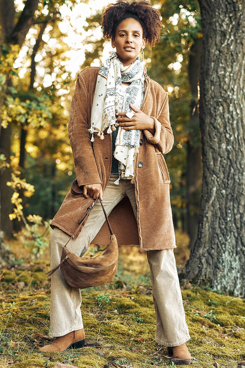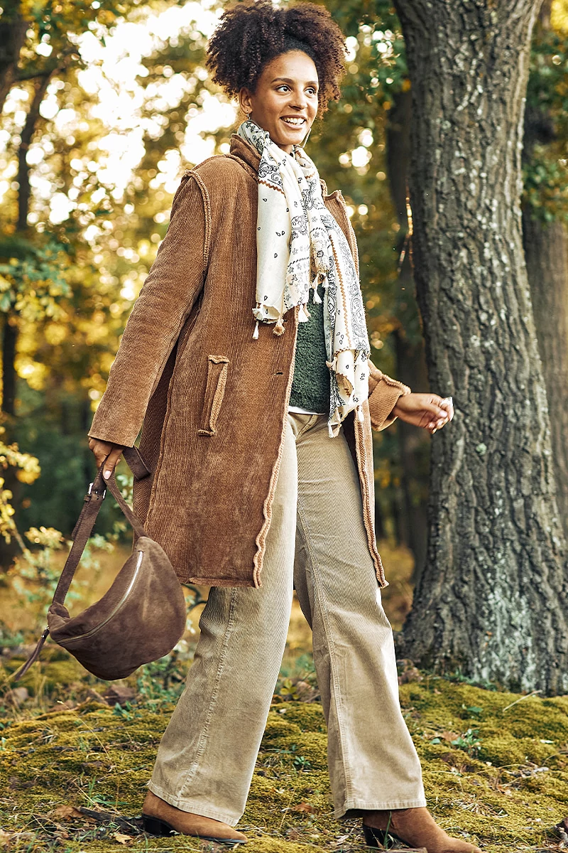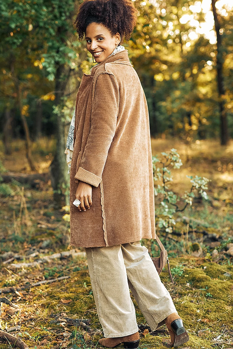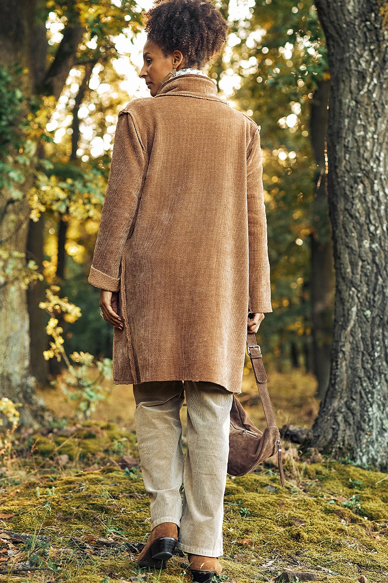 Ez a hosszú kabát különleges kettősséget hordoz magában: kívül kord mintás, belül pedig buklés, vastag anyag gondoskodik a melegségről és a kényelemről. A kifordított varrások modern, nyers hatást adnak, miközben a klasszikus részletek a galléros, hajtókás nyak, az elöl gombos záródás és a praktikus zsebek időtállóvá teszik a fazont.Egy kabát, ami egyszerre ölelően meleg és vagányan stílusos, tökéletes választás a hidegebb napok sokoldalú összeállításaihoz.