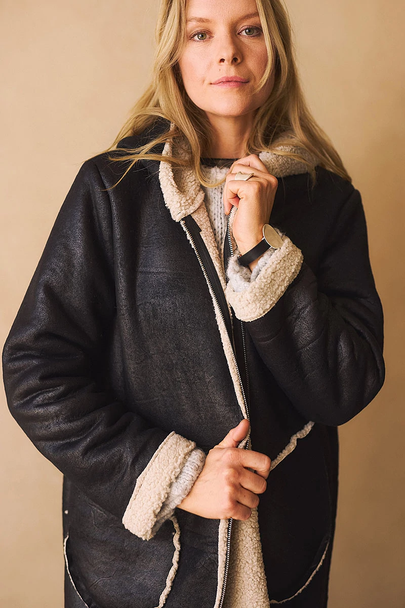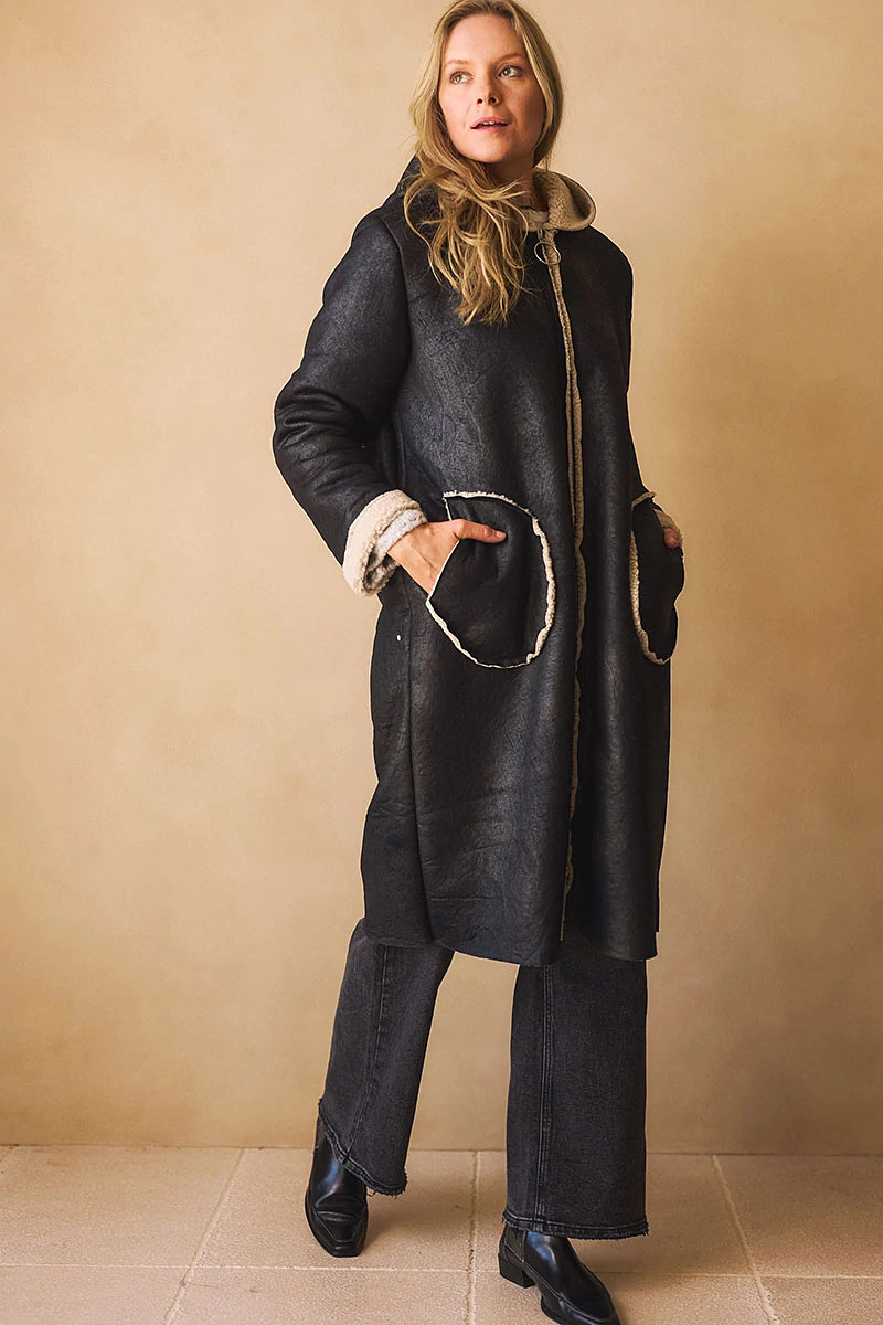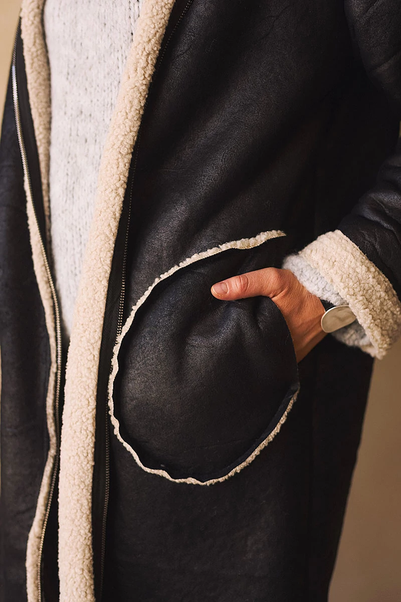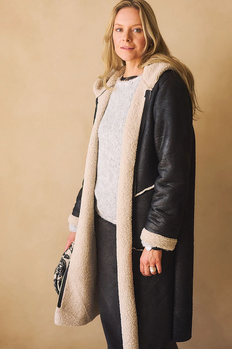 Karakteres, hosszú kabát puha műirhából. Rávarrt zsebei praktikusak, a meleg, prémhatású belső réteg, és a kapucni pedig kényelmet és stílust ad a hűvösebb napokra. Elöl végig ciptárral záródik.Válltól vállig 45 cm, mellvonalban 60 cm, derékvonalban 61 cm, csípővonalban 63 cm széles, hossza 110 cm, ujjhossza 62 cm, karöltő varrástól varrásig 26 cm.