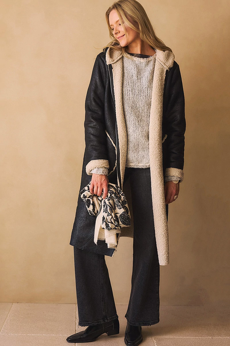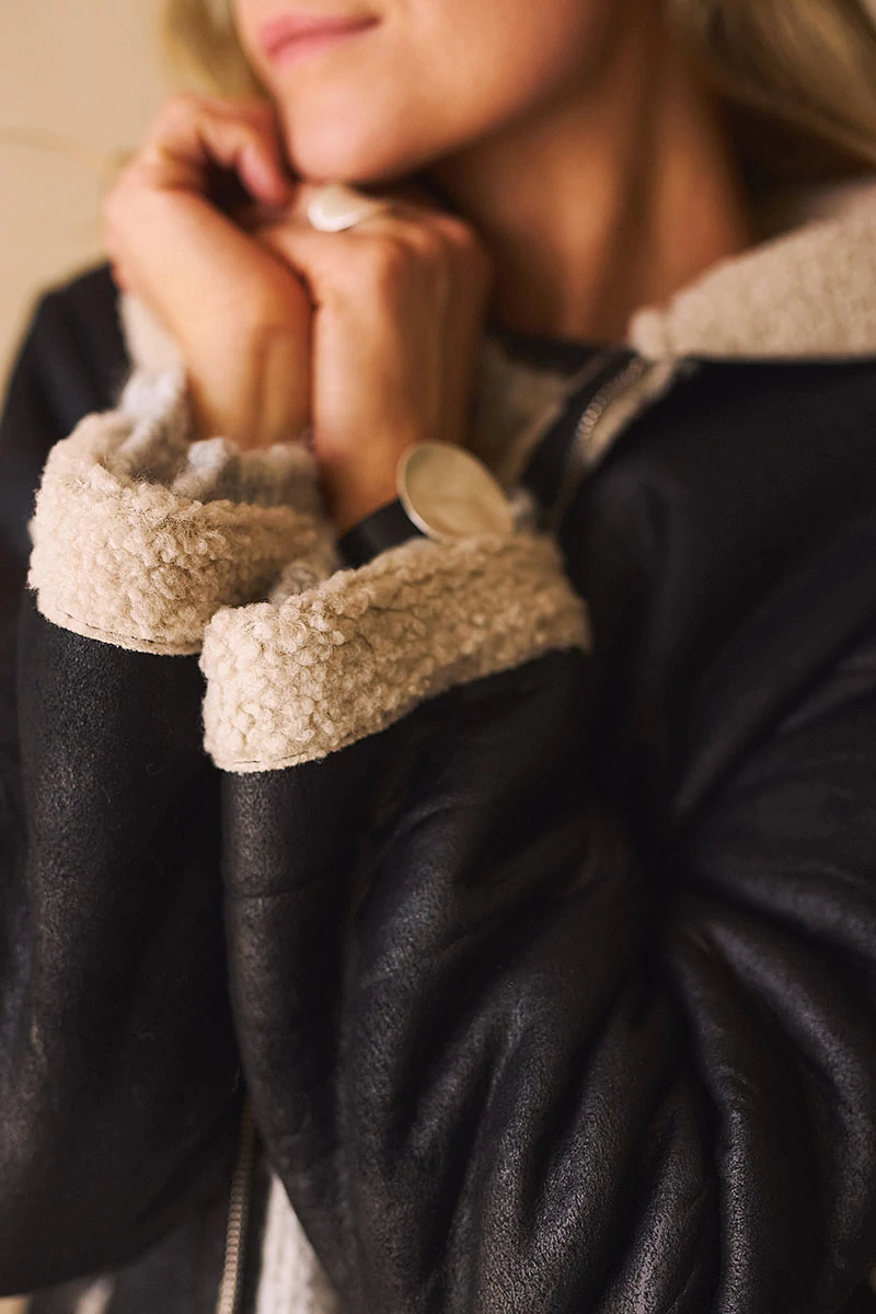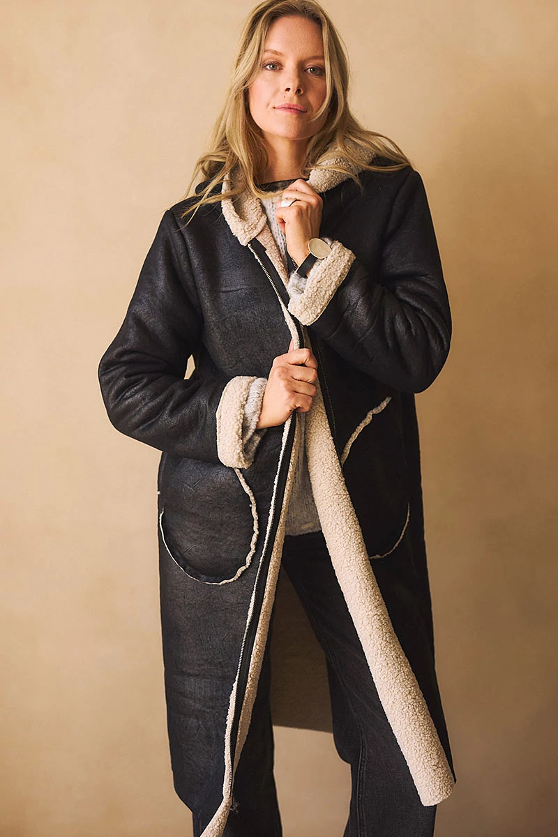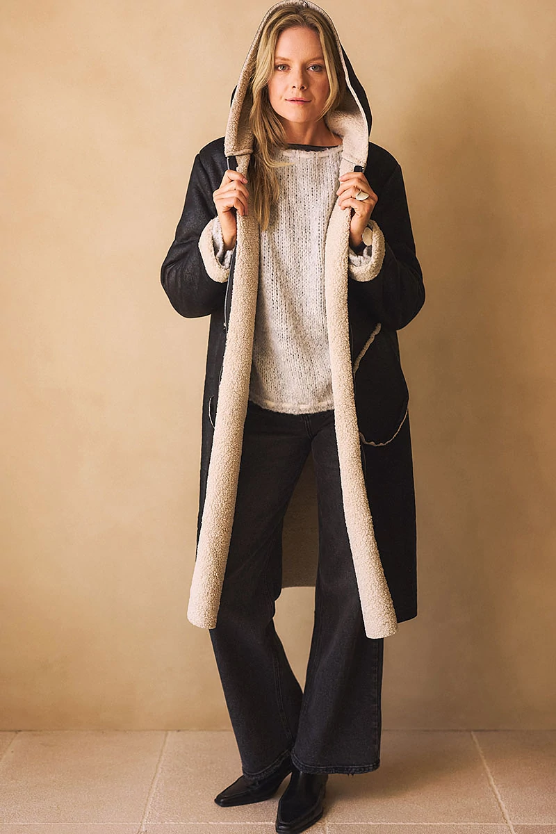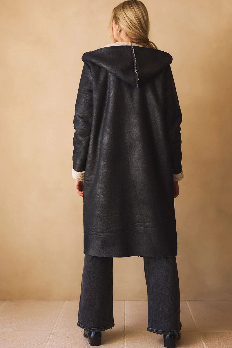 Karakteres, hosszú kabát puha műirhából. Rávarrt zsebei praktikusak, a meleg, prémhatású belső réteg, és a kapucni pedig kényelmet és stílust ad a hűvösebb napokra. Elöl végig ciptárral záródik.Válltól vállig 45 cm, mellvonalban 60 cm, derékvonalban 61 cm, csípővonalban 63 cm széles, hossza 110 cm, ujjhossza 62 cm, karöltő varrástól varrásig 26 cm.