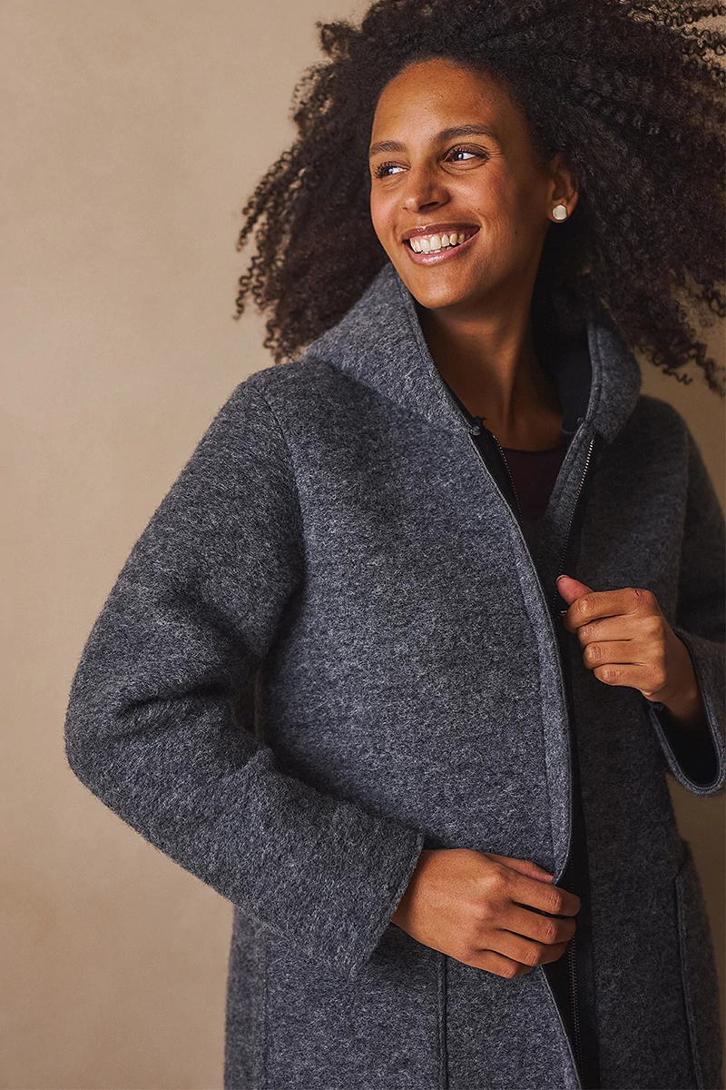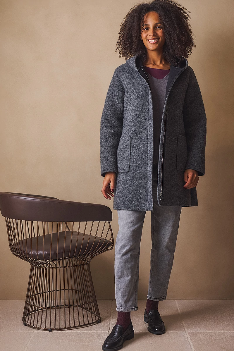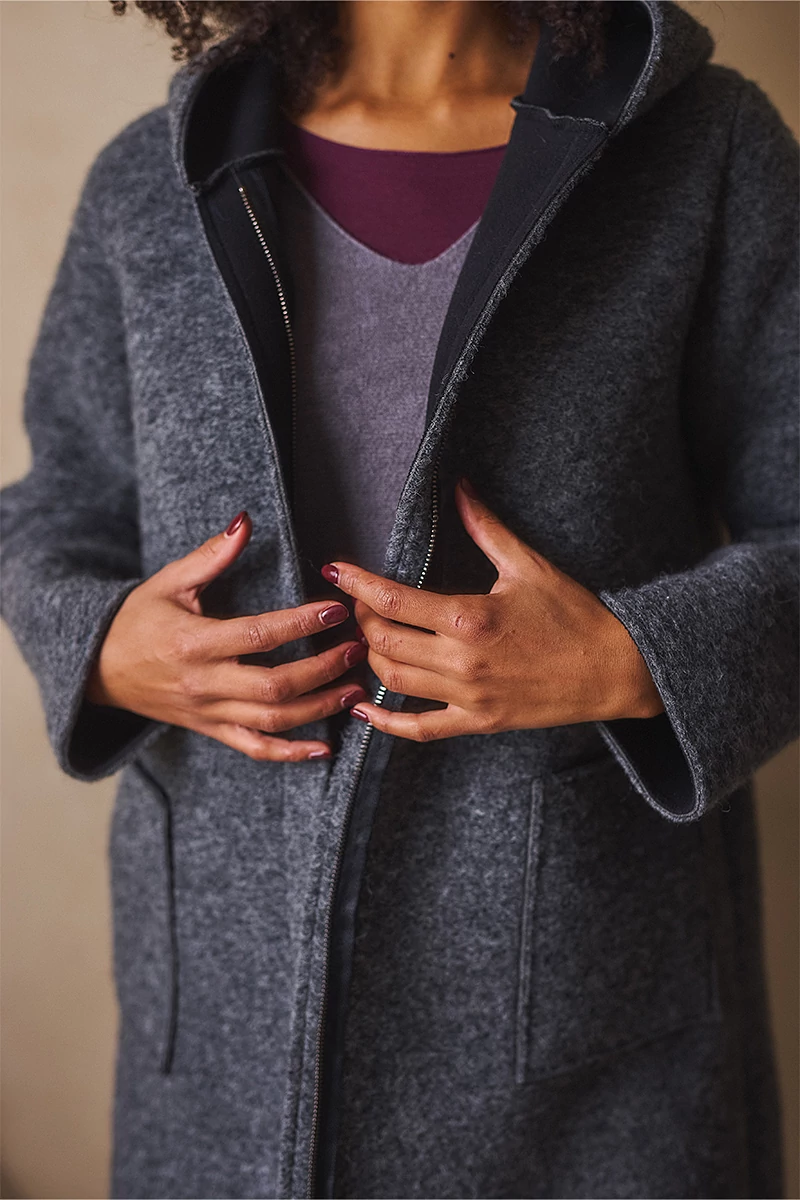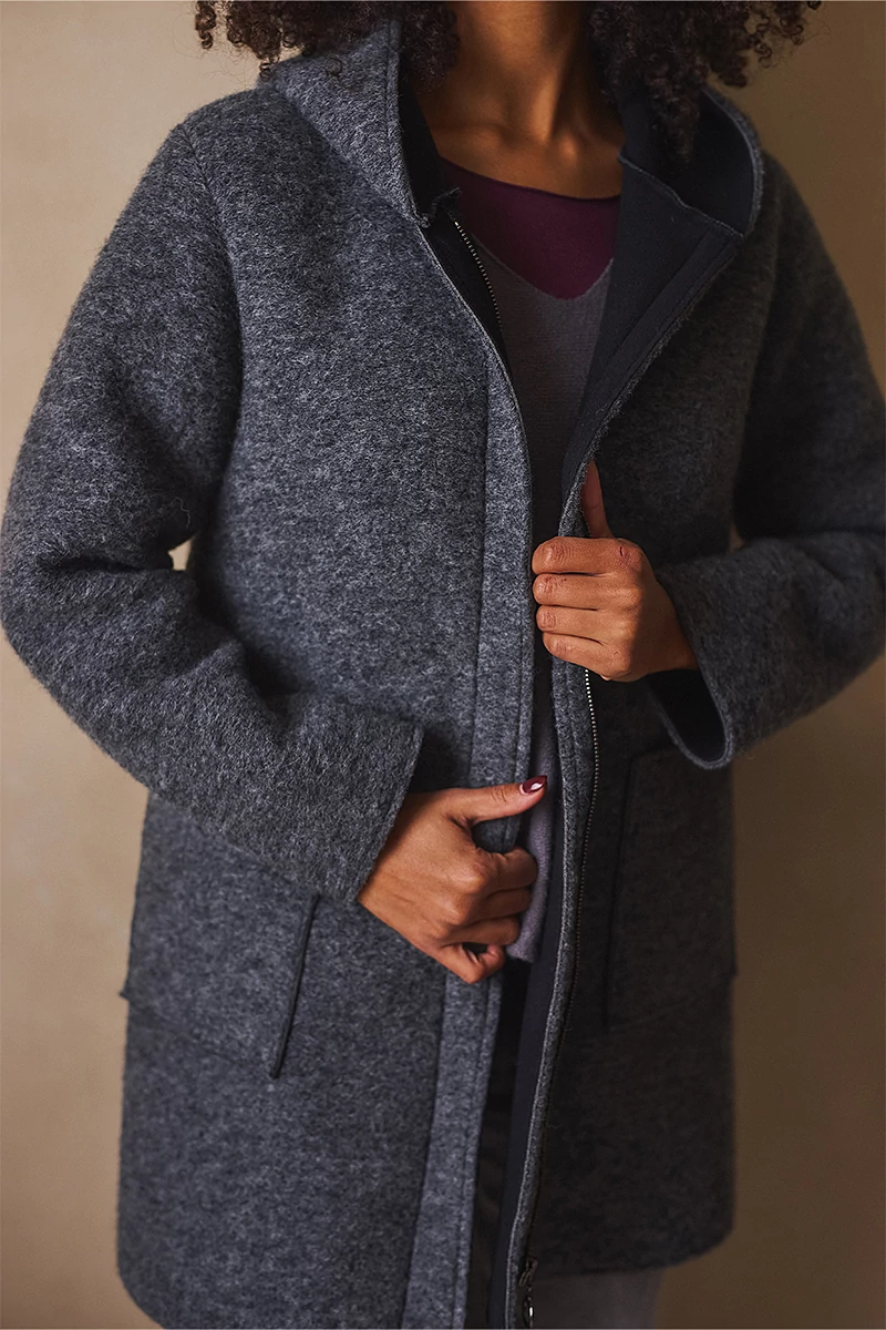 Ez az egyenes vonalú, közepes hosszúságú kabát a kényelem és a letisztultság tökéletes egyensúlya. Kapucnival és elöl cipzárral készült, két rávarrt zsebe pedig lezser, praktikus részletként egészíti ki a fazont. Puha, termo hatású, rugalmas kevertszálas gyapjú anyaga könnyű, mégis melegen tart, miközben kellemes mozgásszabadságot biztosít. Egy kabát, amelyben a modern funkcionalitás és a természetes puhaság találkozik.