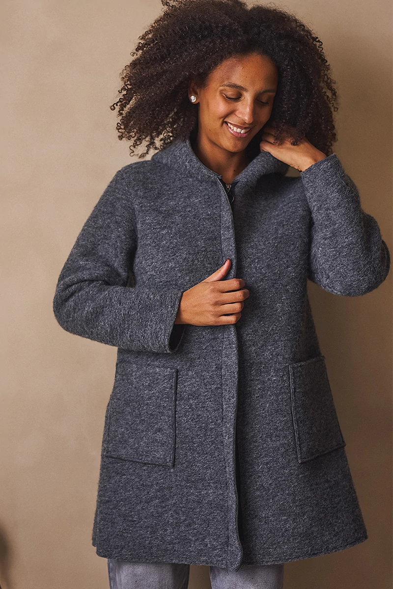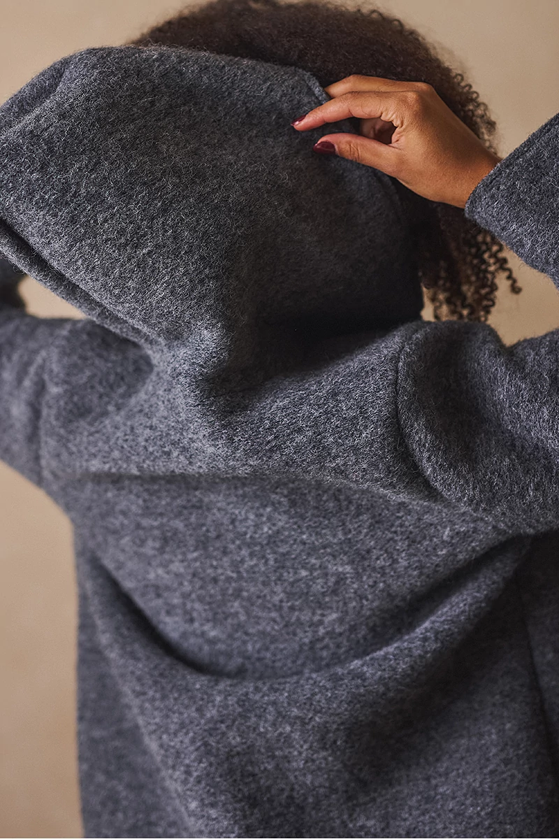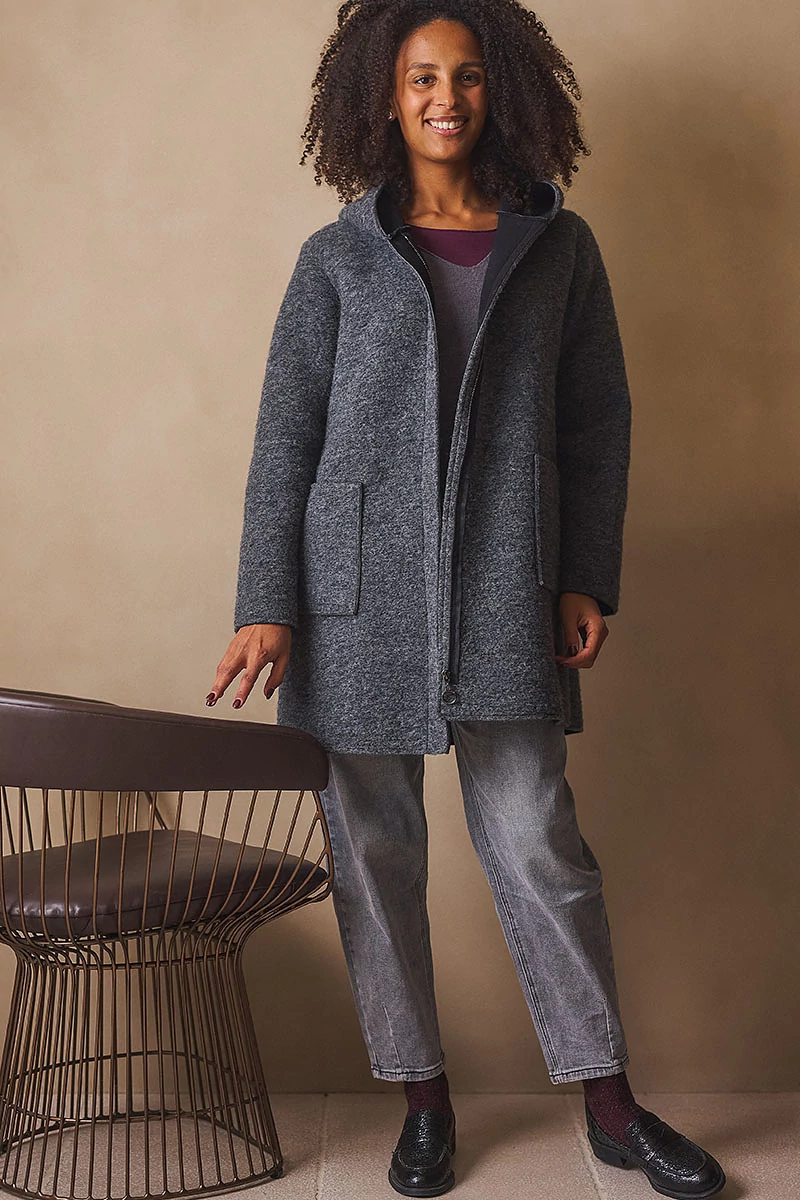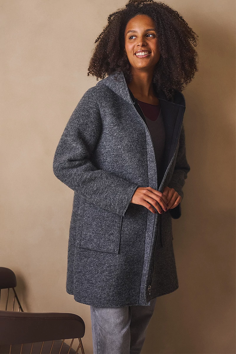 Ez az egyenes vonalú, közepes hosszúságú kabát a kényelem és a letisztultság tökéletes egyensúlya. Kapucnival és elöl cipzárral készült, két rávarrt zsebe pedig lezser, praktikus részletként egészíti ki a fazont. Puha, termo hatású, rugalmas kevertszálas gyapjú anyaga könnyű, mégis melegen tart, miközben kellemes mozgásszabadságot biztosít. Egy kabát, amelyben a modern funkcionalitás és a természetes puhaság találkozik.