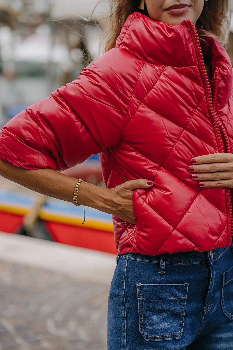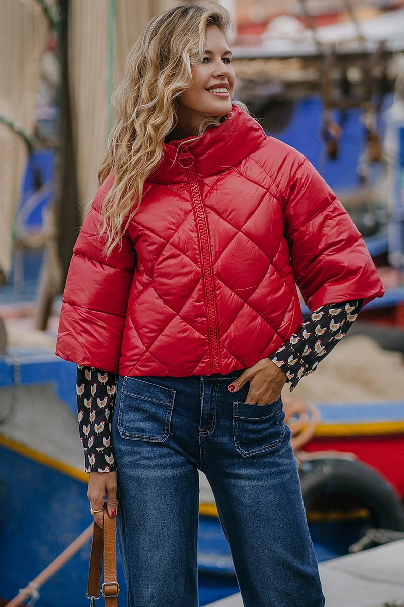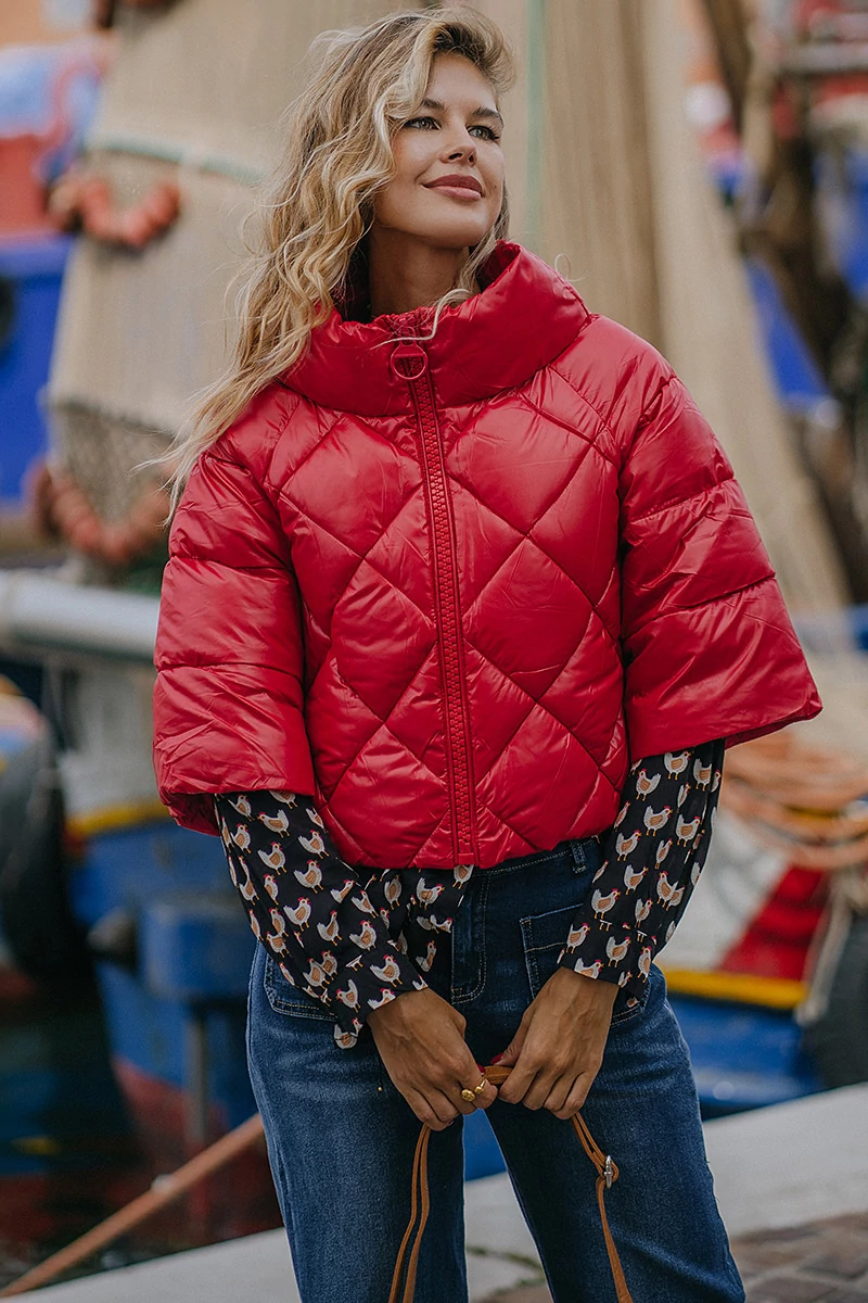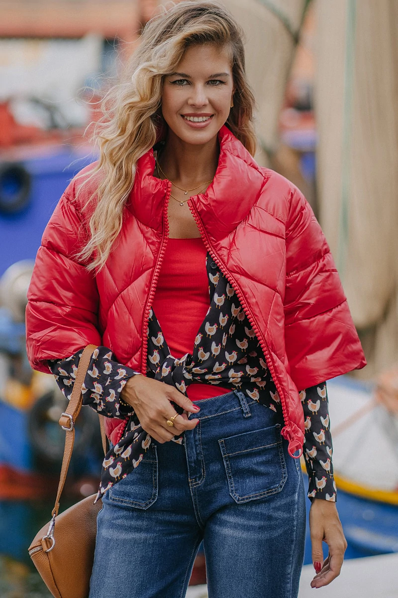 Rövidebb szabású,steppelt kabát álló gallérral, könnyű, poliészter béléssel, cipzáros, rejtett zsebekkel, 3/4-es raglán ujjal. A kabát elöl széles cipzárral záródik.