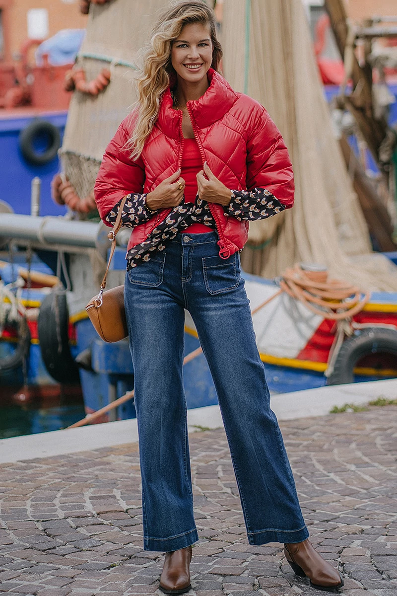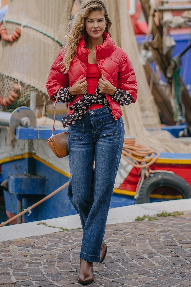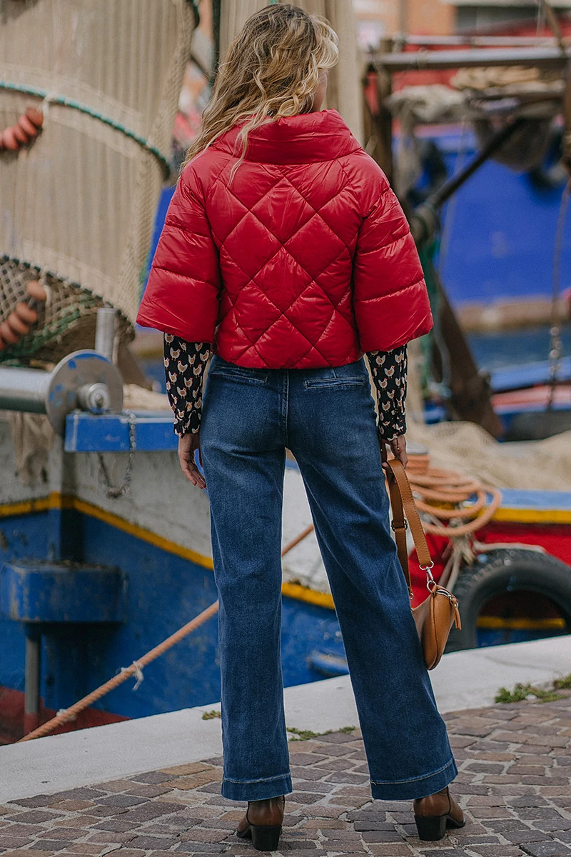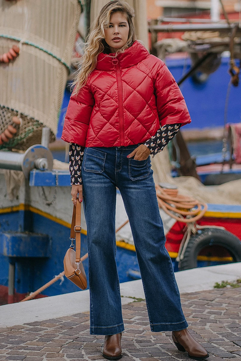 Rövidebb szabású,steppelt kabát álló gallérral, könnyű, poliészter béléssel, cipzáros, rejtett zsebekkel, 3/4-es raglán ujjal. A kabát elöl széles cipzárral záródik.