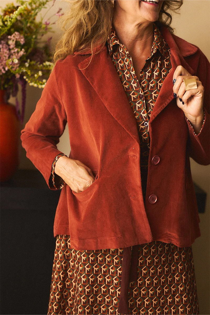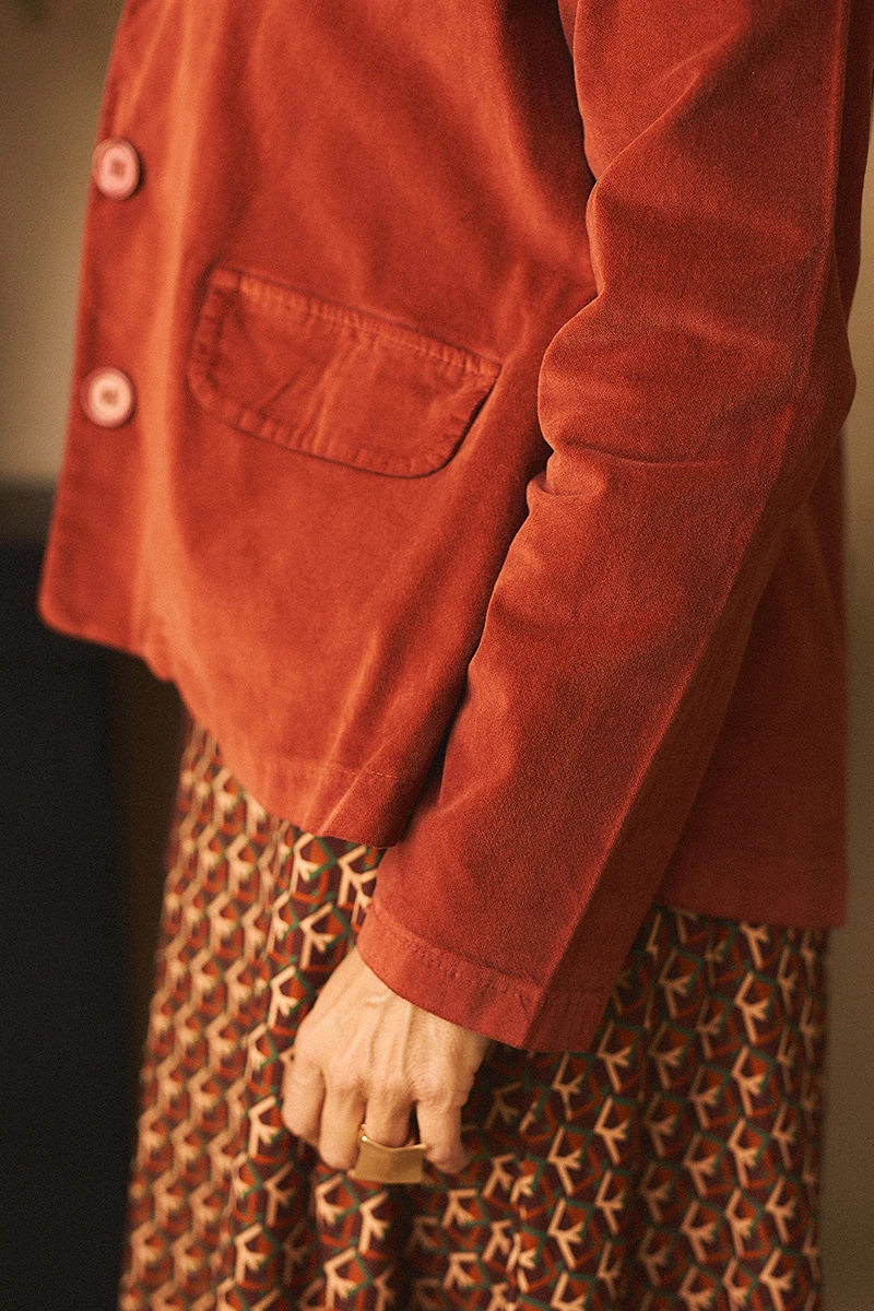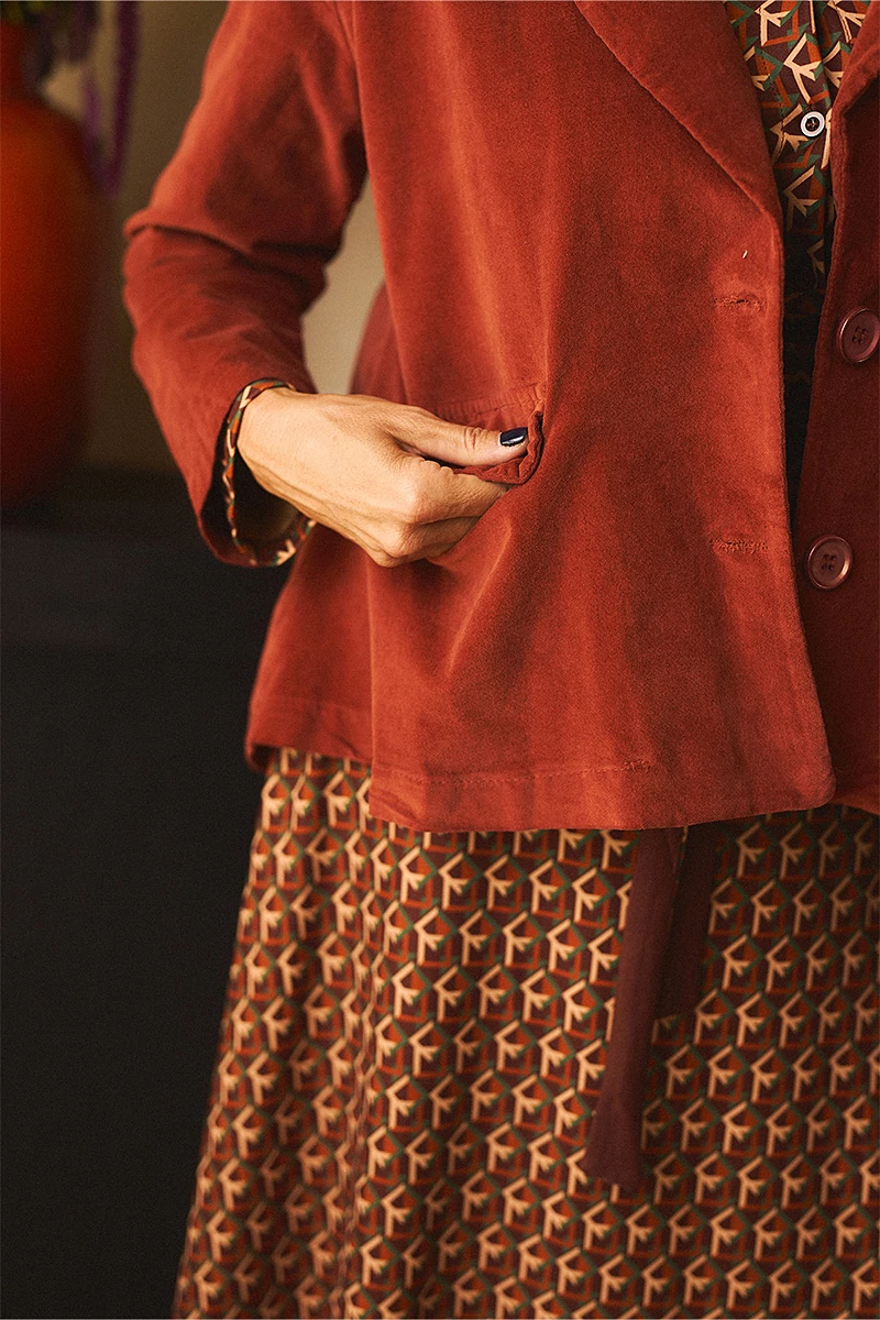 Bő, harang fazonú bársony blézer, zsebekkel, hosszú ujjal, hajtókás gallérral. Elöl gombokkal záródik. A blézer béleletlen, az anyaga rugalmas, közepes vastag bársony.