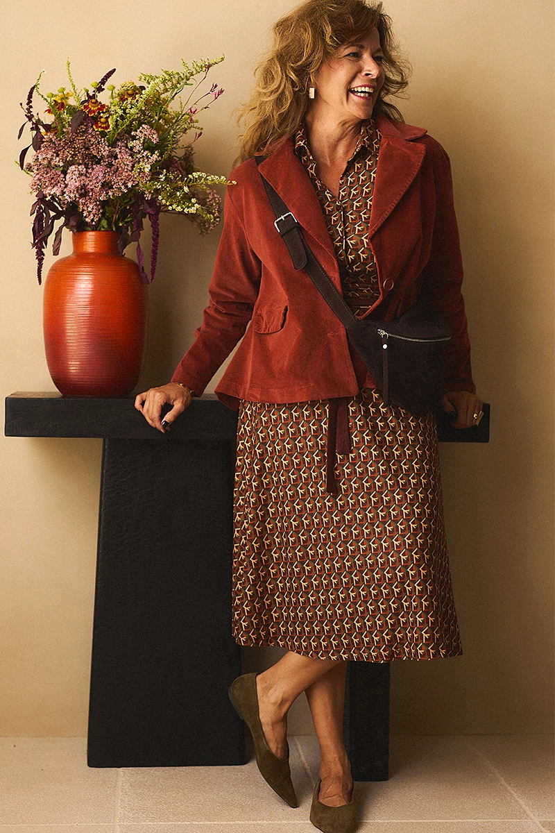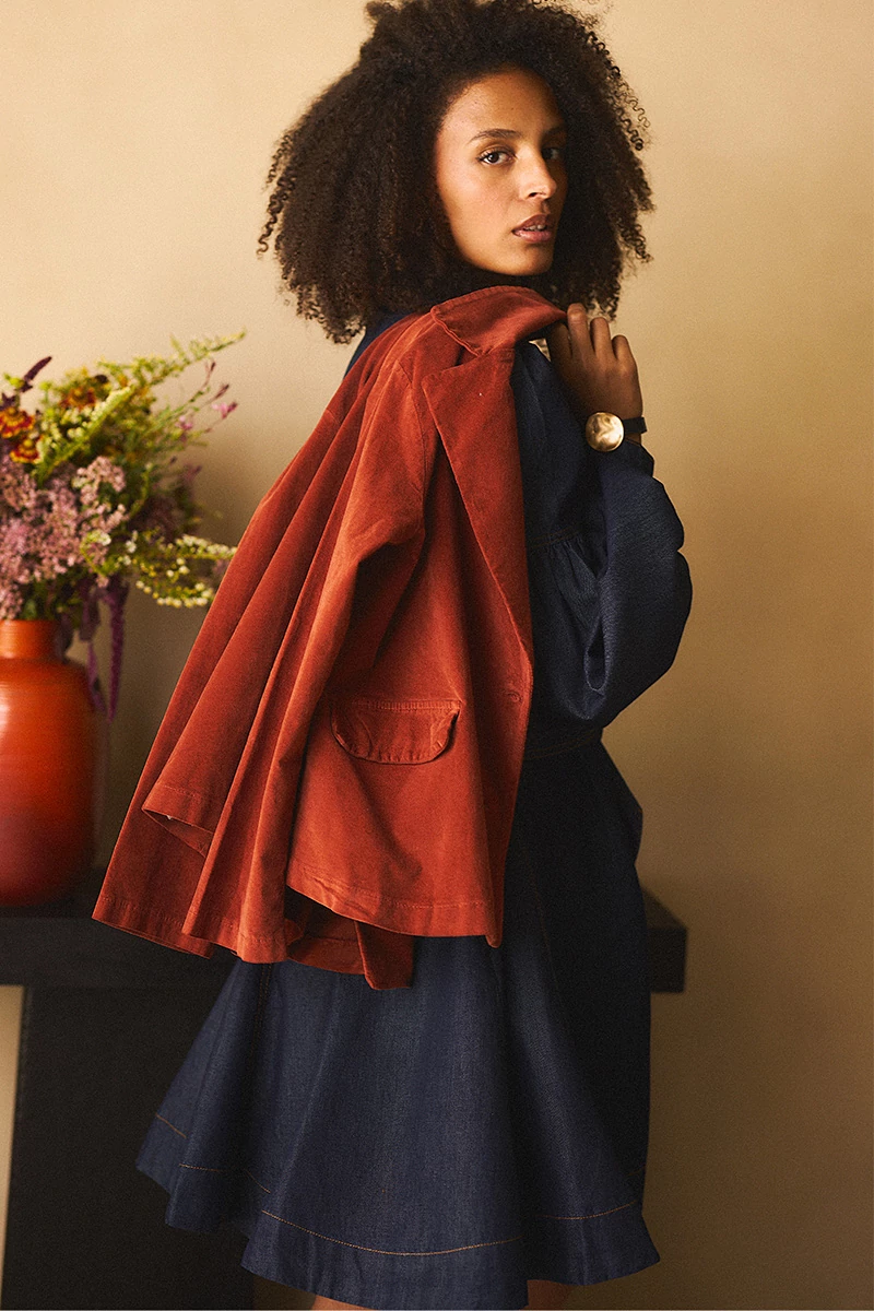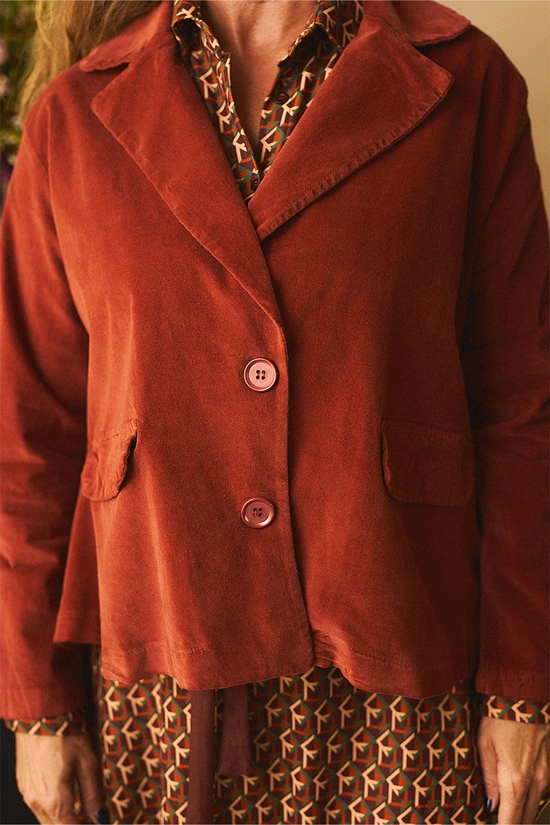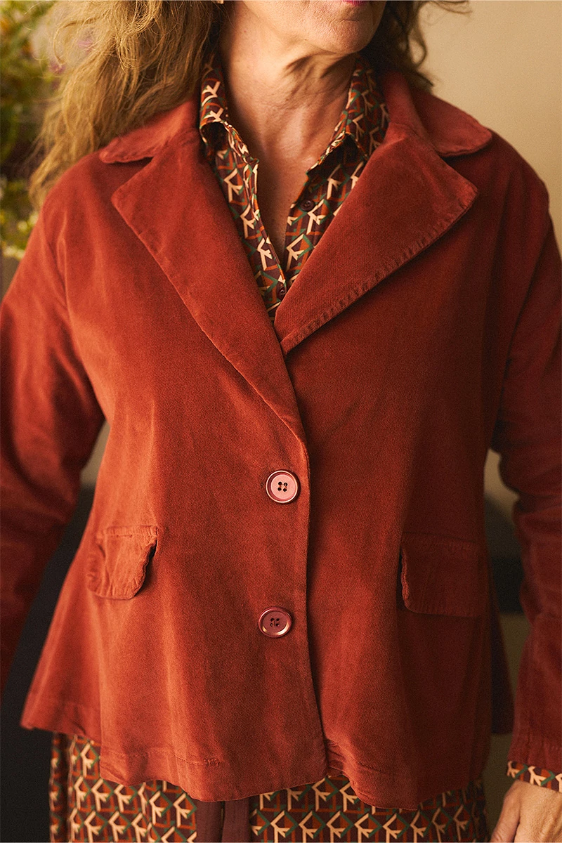 Bő, harang fazonú bársony blézer, zsebekkel, hosszú ujjal, hajtókás gallérral. Elöl gombokkal záródik. A blézer béleletlen, az anyaga rugalmas, közepes vastag bársony.