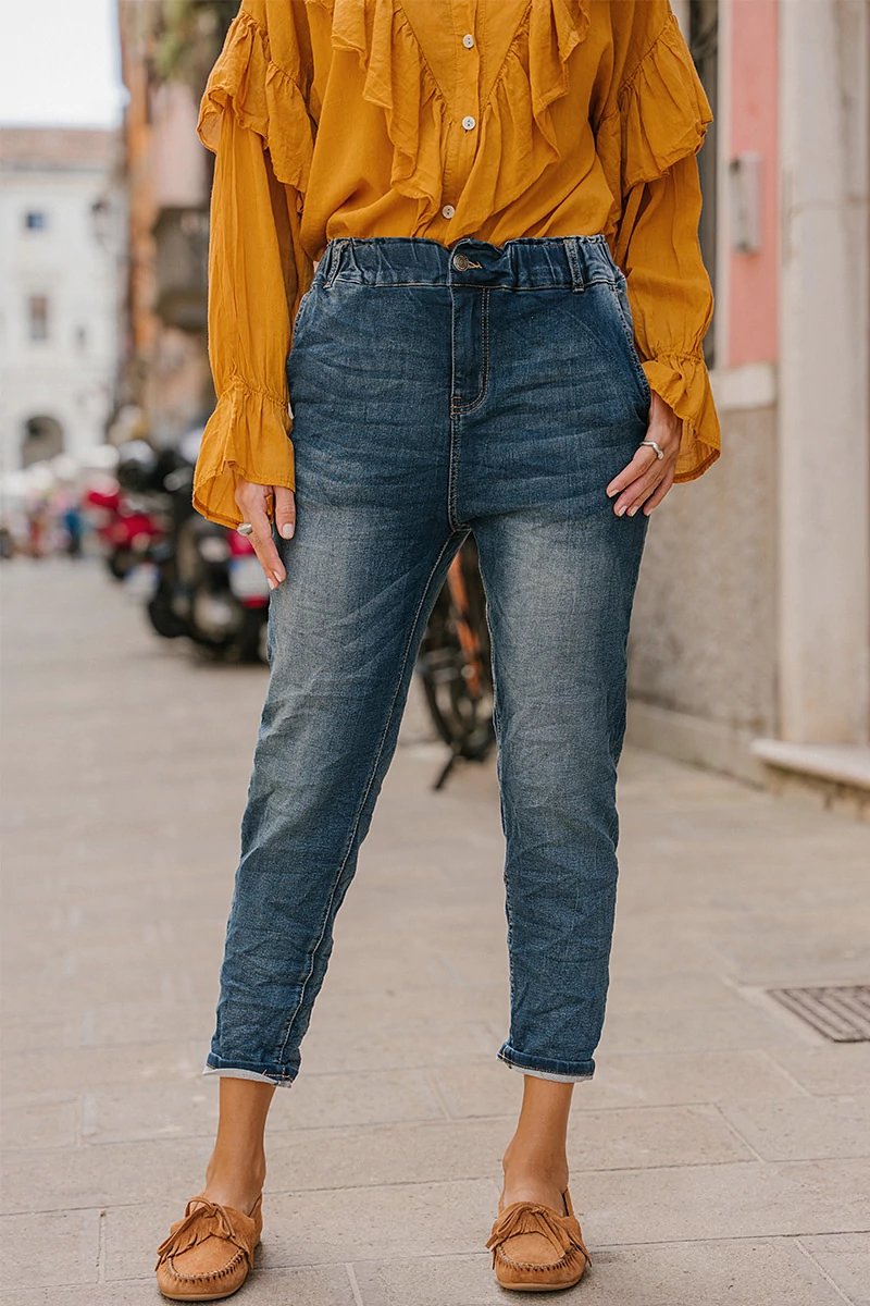 Magasabb derekú, elöl gombbal, cipzárral záródó farmer gumis derékrésszel, derekán övbújtatókkal, szűkebb szárral. A nadrág normál szárhosszúságú, Az anyaga rugalmas, formatartó, puha, gyűrt, koptatott farmer anyag. Nagyobb méretállású nadrág, javasoljuk, hogy egy mérettel kisebbet válassz! Figyeld a lecentizett adatokat!