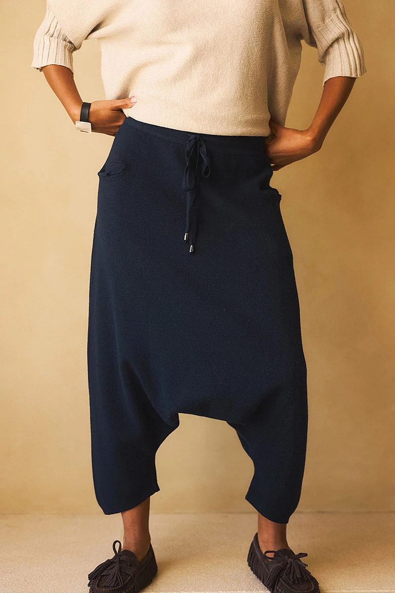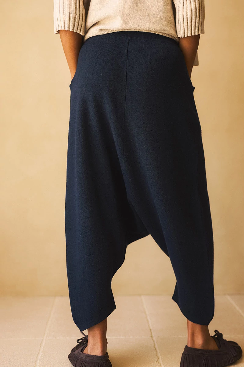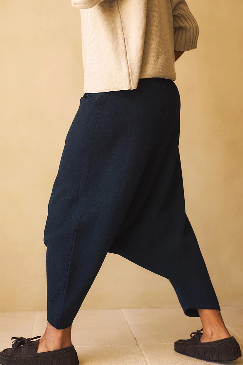 Mélyülepű nadrág gumis, kötős derékrésszel, elöl két vágott, rejtett zsebbel. Anyaga rendkívül rugalmas, meleg, hurkolt, polárszerű viszkóz anyag.