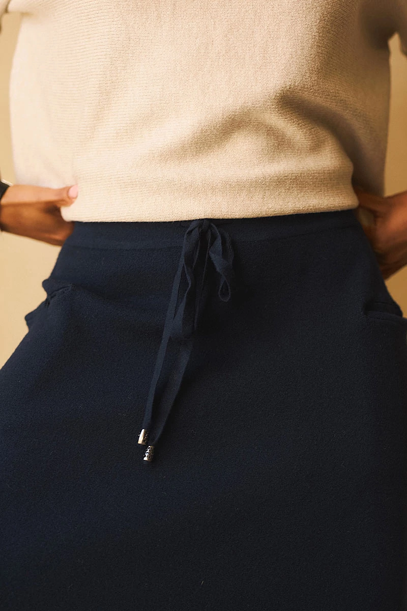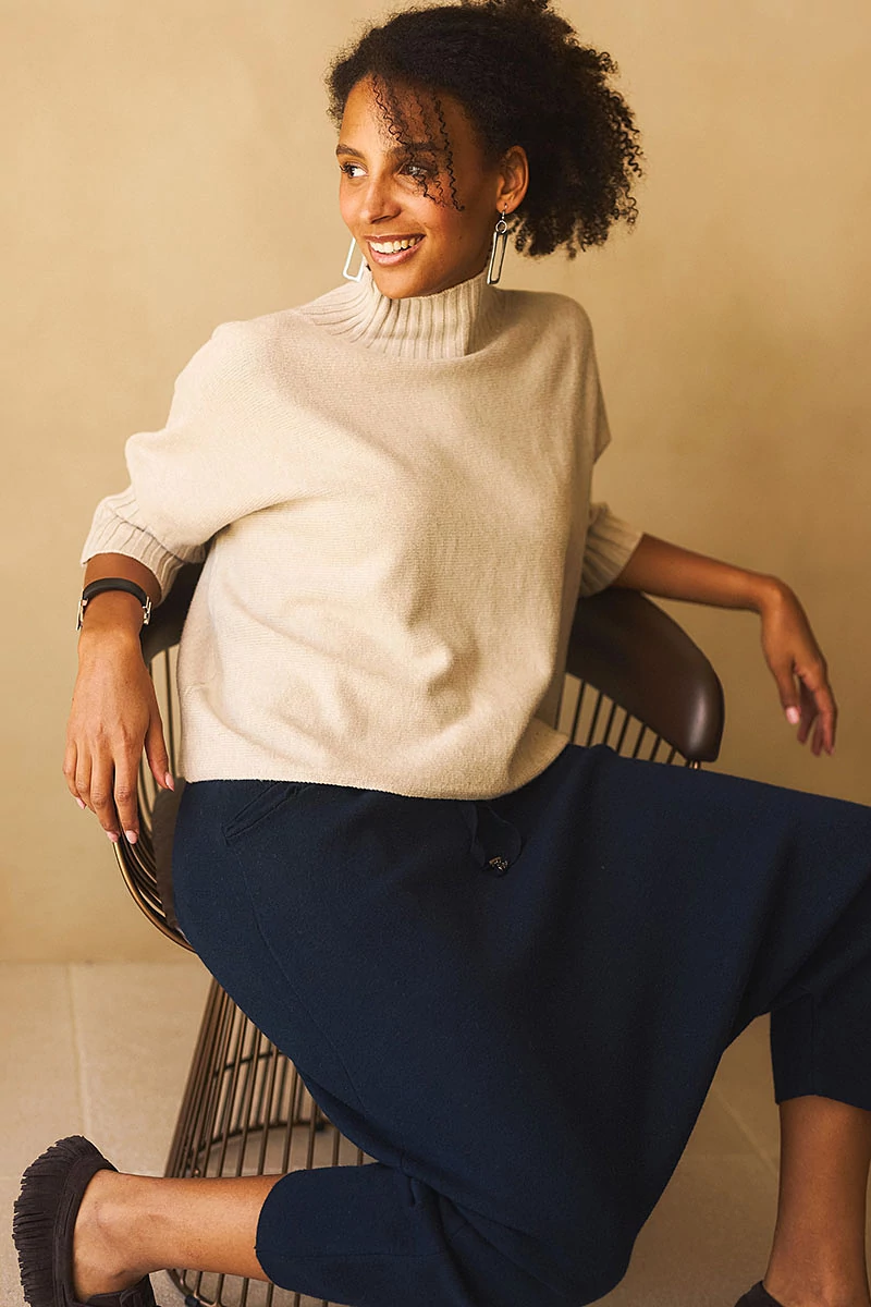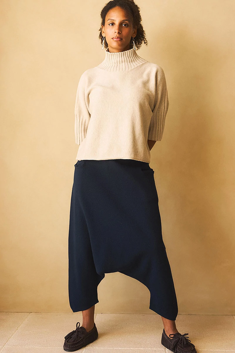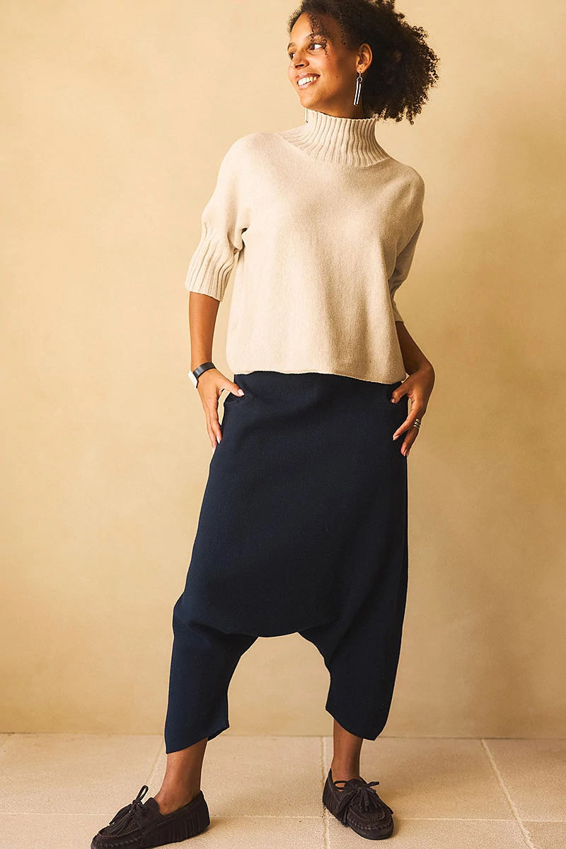 Mélyülepű nadrág gumis, kötős derékrésszel, elöl két vágott, rejtett zsebbel. Anyaga rendkívül rugalmas, meleg, hurkolt, polárszerű viszkóz anyag.