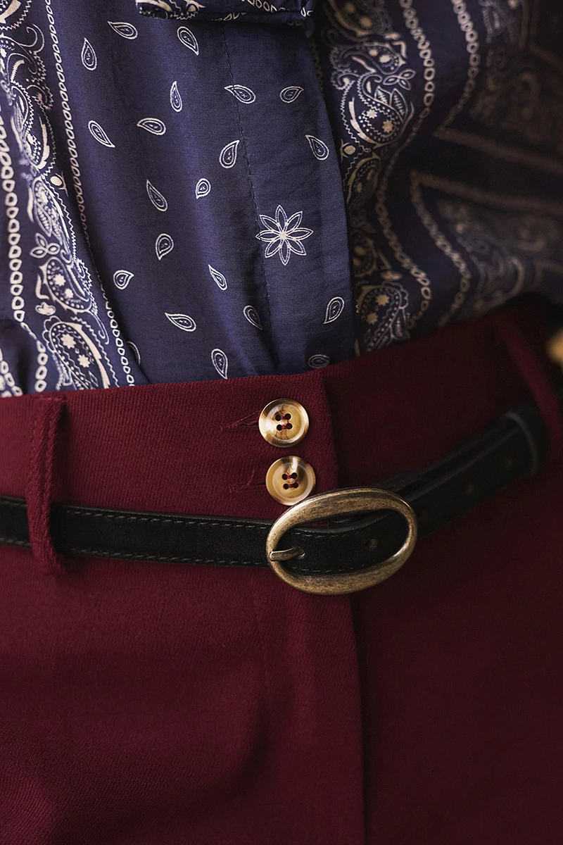 Nadrág magasabb derékrésszel, bővebb fazonú, az alján széles hajtókával, elöl 2 zsebbel. Elöl fix, hátul gumírozott derékrésszel, cipzárral és gombbal záródik. Az anyaga puha szövet.