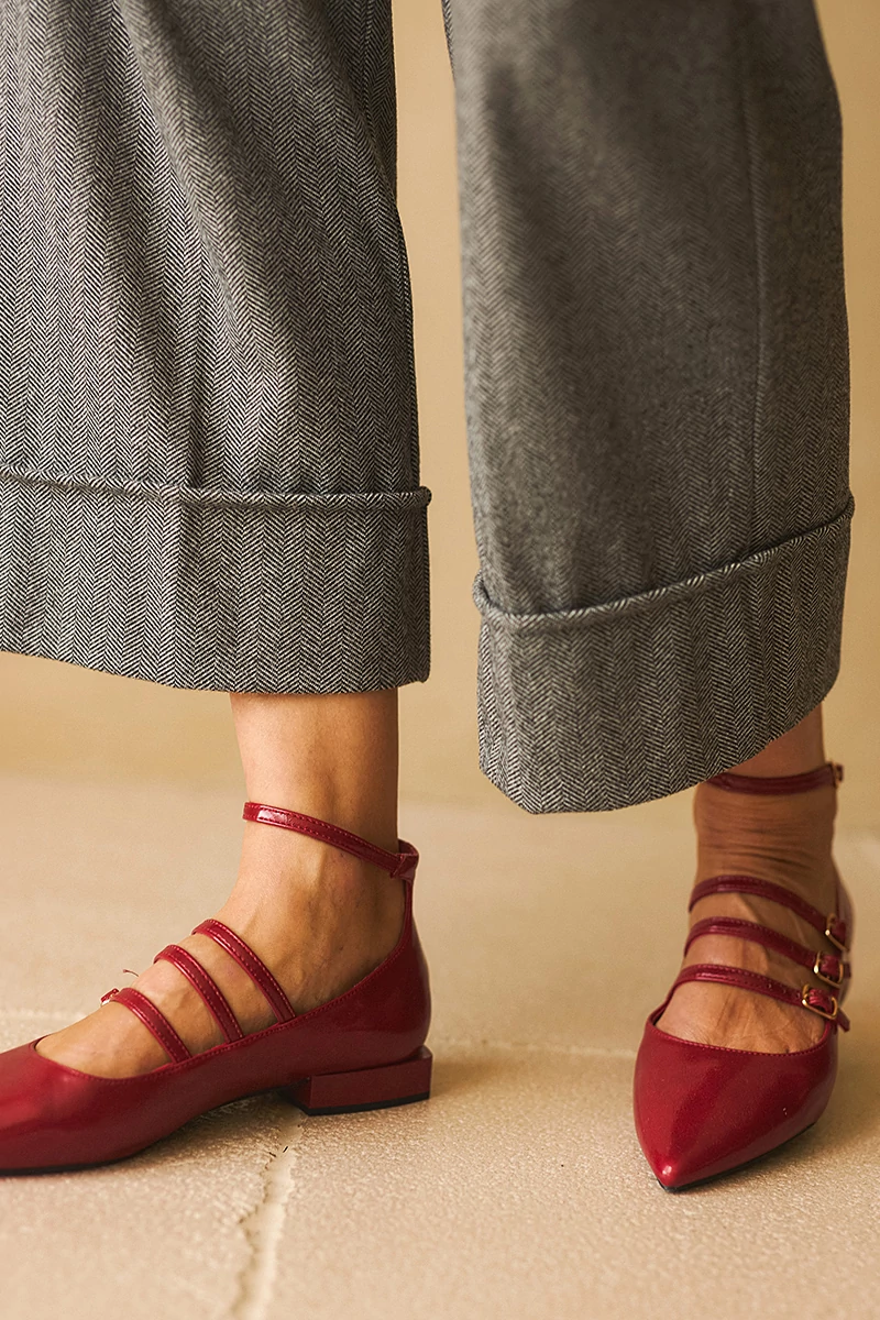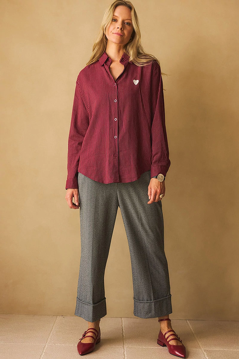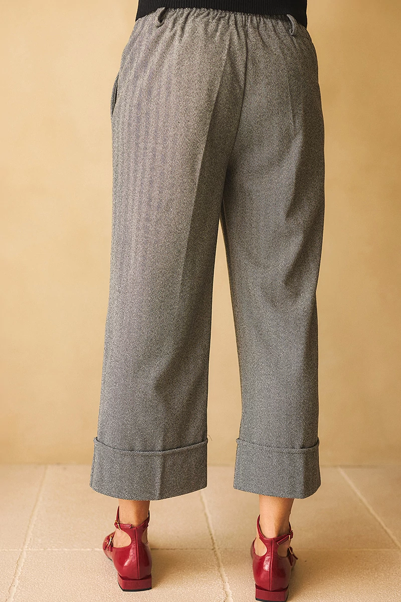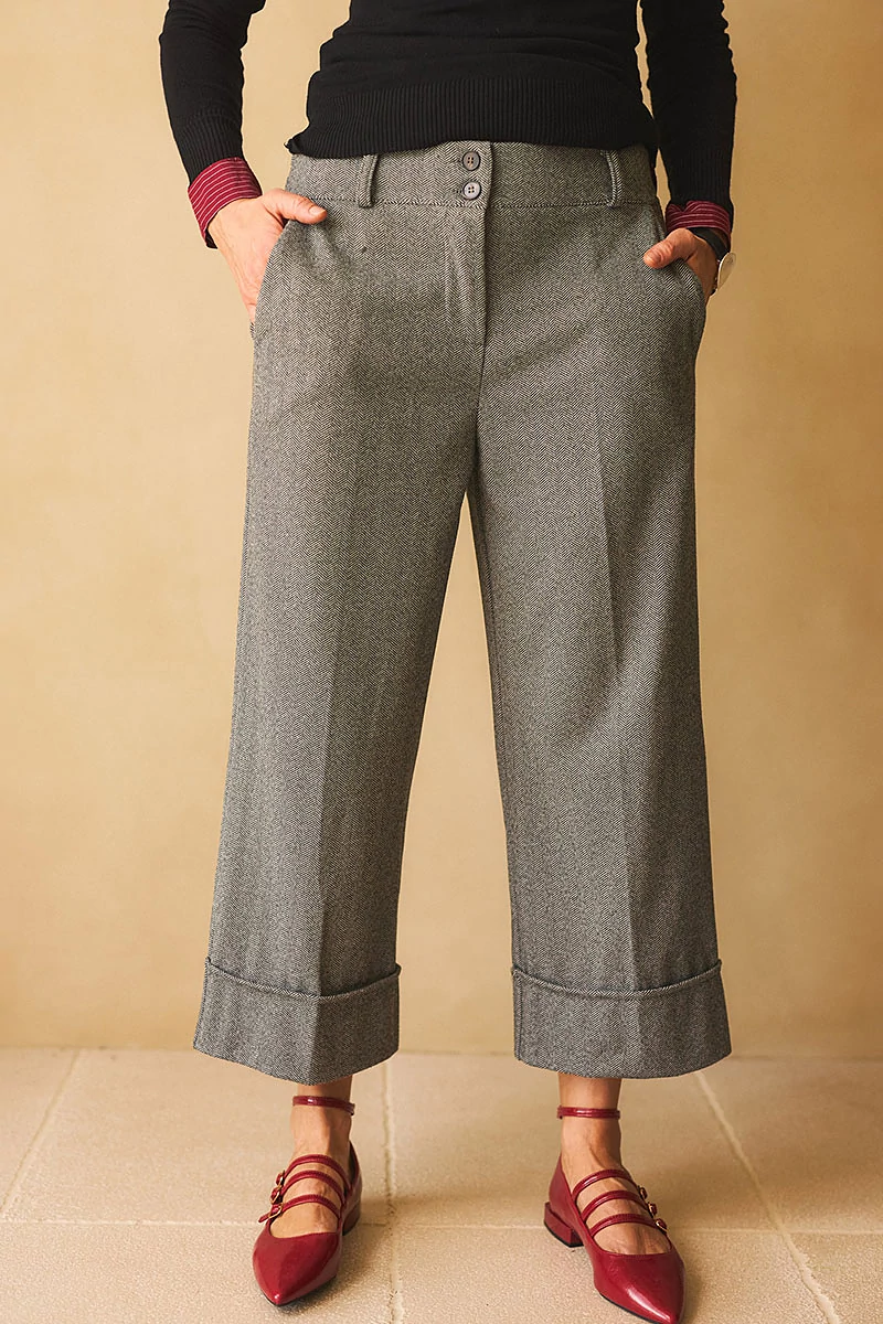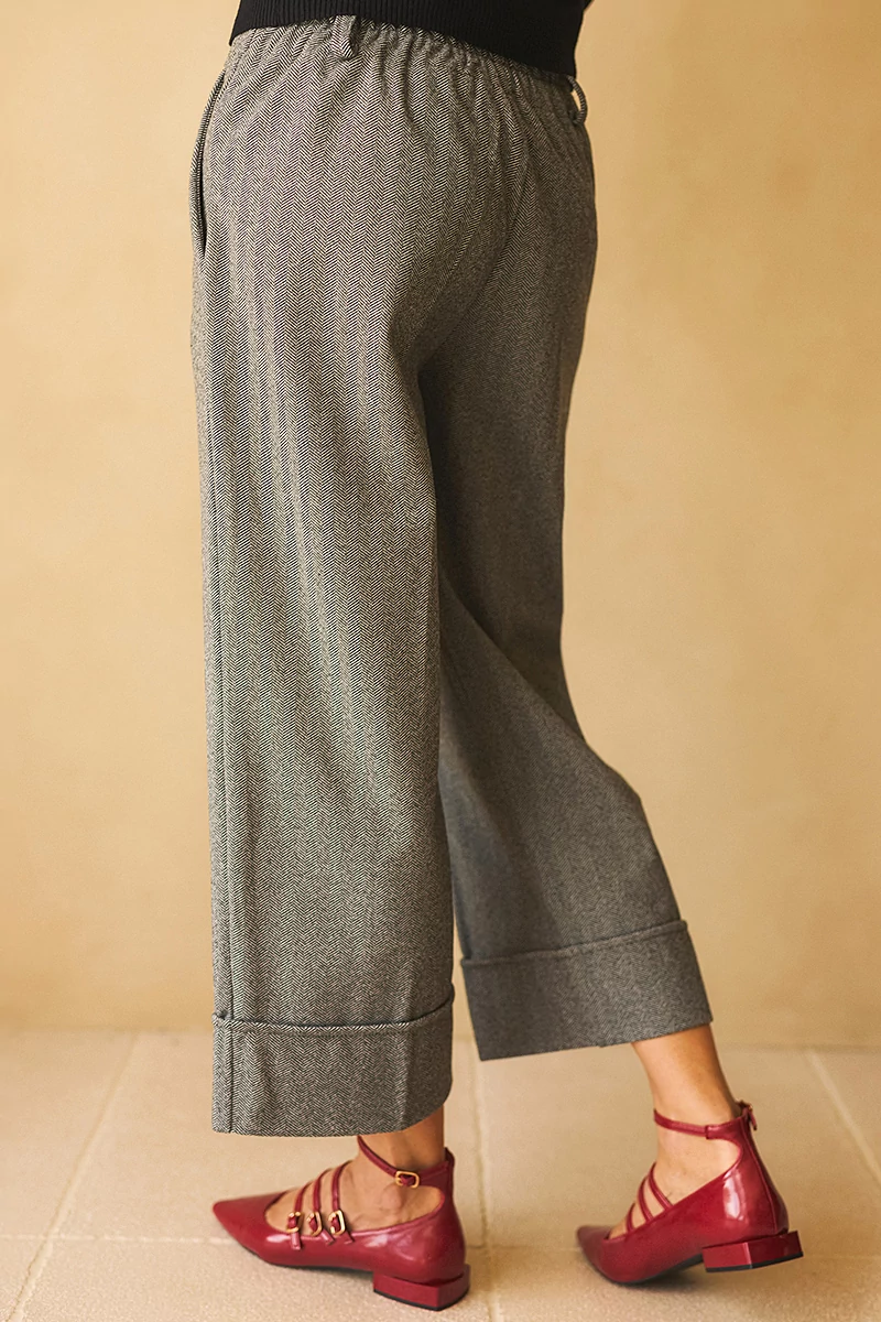 Nadrág magasabb derékrésszel, bővebb fazonú, az alján széles hajtókával, elöl 2 zsebbel. Elöl fix, hátul gumírozott derékrésszel, cipzárral és gombbal záródik. Az anyaga puha szövet.