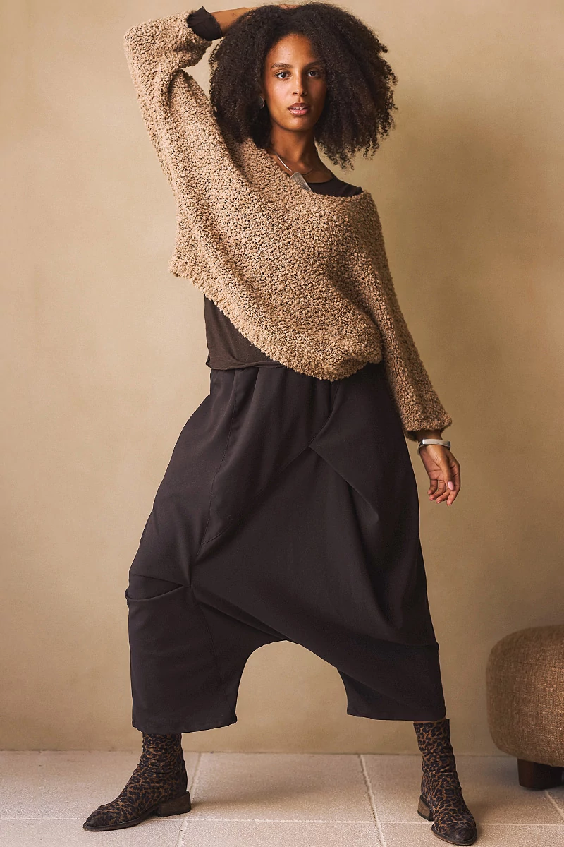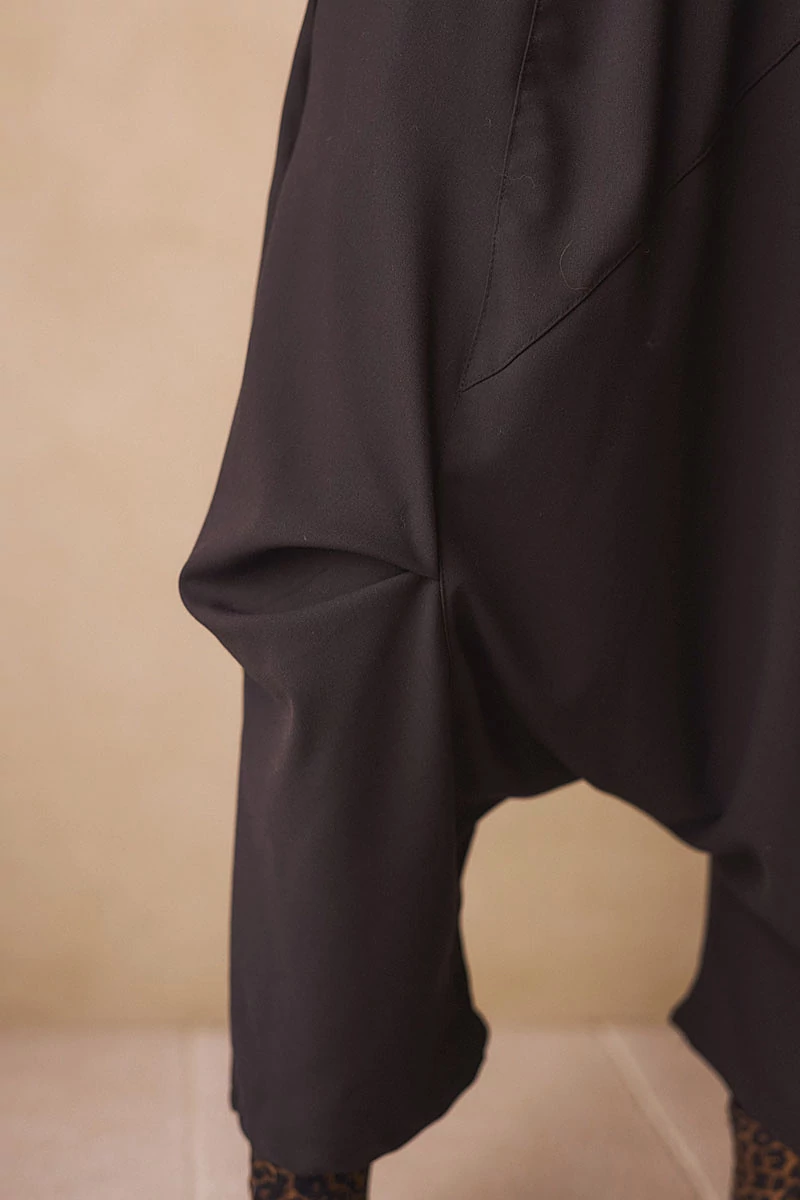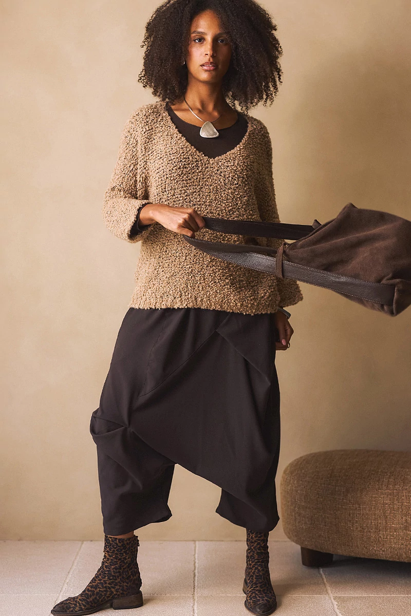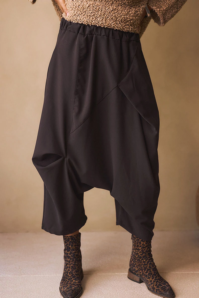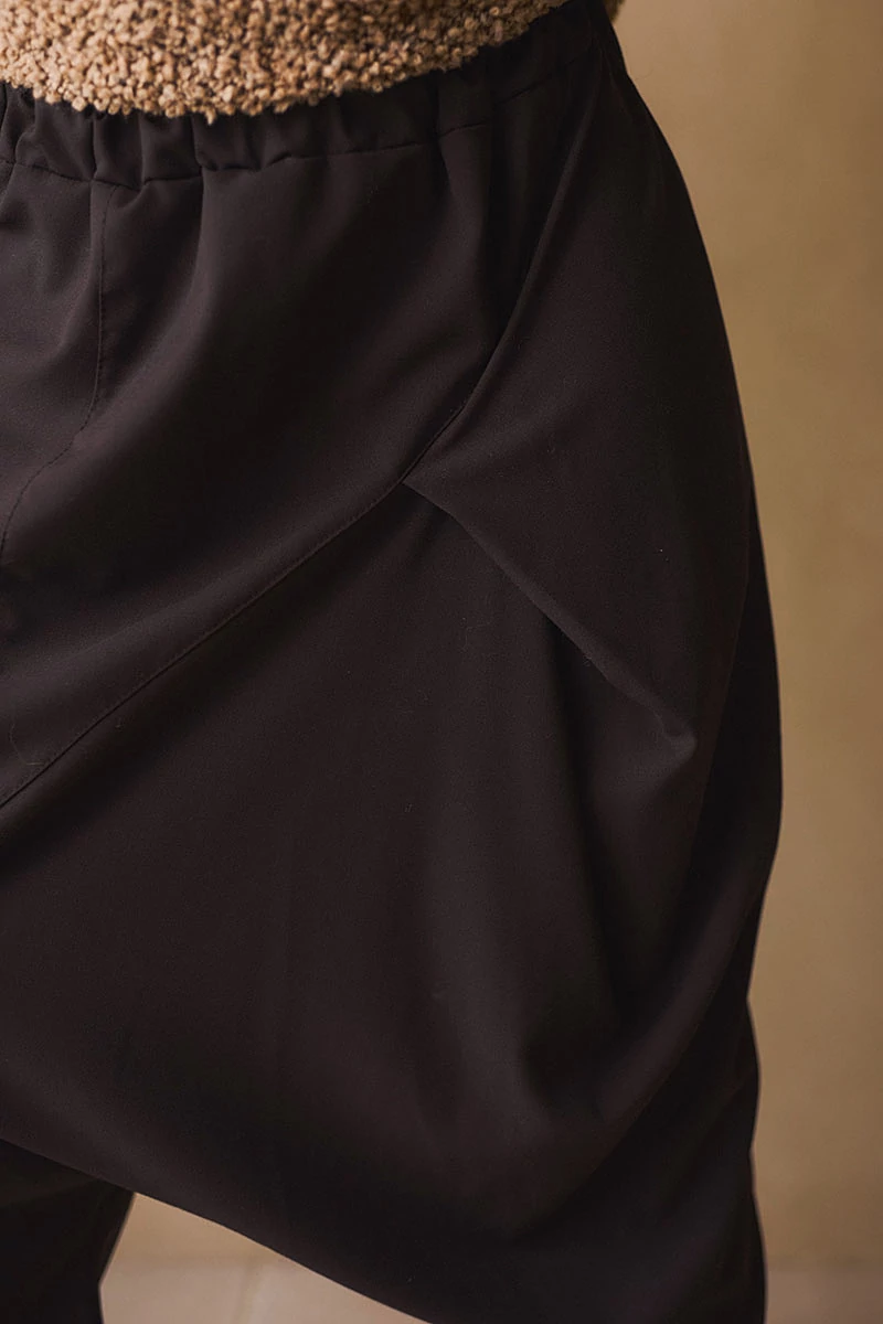 Ez a nadrág a kényelmet és a karakteres megjelenést ötvözi. Rugalmas anyaga lágyan követi a mozdulatokat, miközben tartást is ad. Az elöl futó keresztvarrások és finom csípések játékos, mégis határozott vonalvezetést rajzolnak. A varrásvonalba rejtett zsebek diszkréten simulnak az anyagba, a gumis derék pedig gondoskodik a könnyed viselhetőségről. Letisztult, mégis különleges darab azoknak, akik szeretik, ha a hétköznapi viseletben is van egy apró csavar.