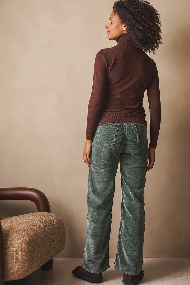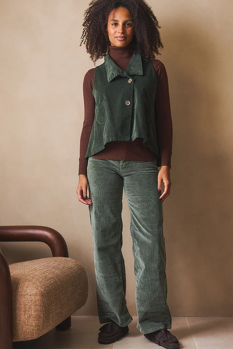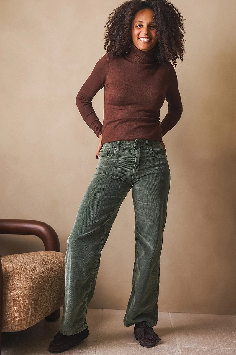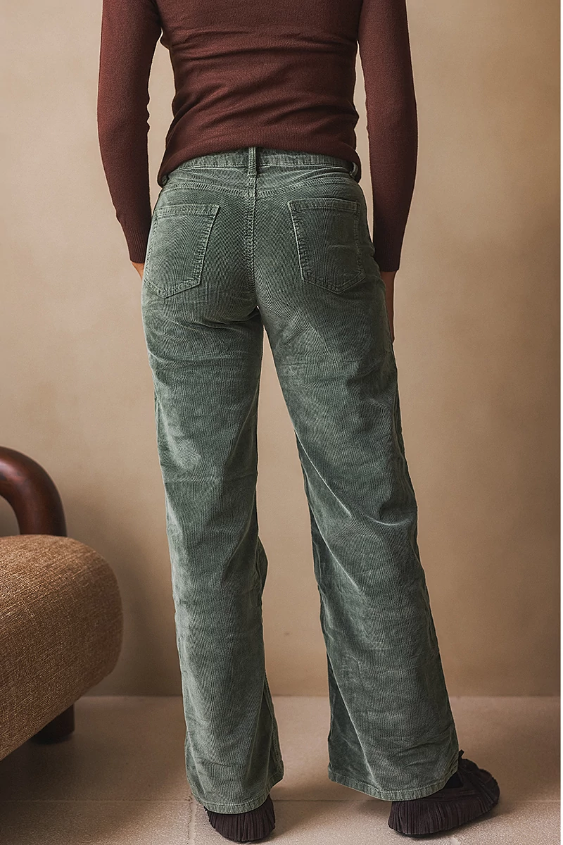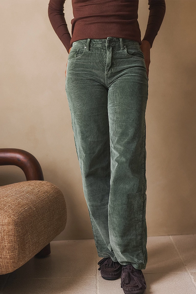 Ez a mikrokord nadrág a klasszikus szabás és a modern kényelem találkozása. Bő szárú fazonja lezser, mégis elegáns megjelenést ad, miközben a rugalmas, pamutszálas kordbársony anyag puha tapintású és könnyed mozgást biztosít. A szabott, gombos-cipzáros kialakítás a magasabb ülepvonalnak köszönhetően kényelmes viseletet nyújt. A két ferde oldalzseb és a hátul elhelyezett rávarrt zsebek a lezserséget hangsúlyozzák, miközben funkcionális részleteket adnak a nadrágnak.