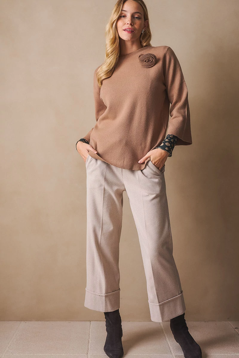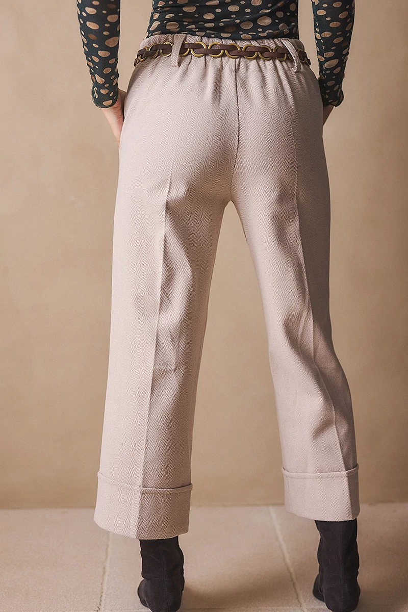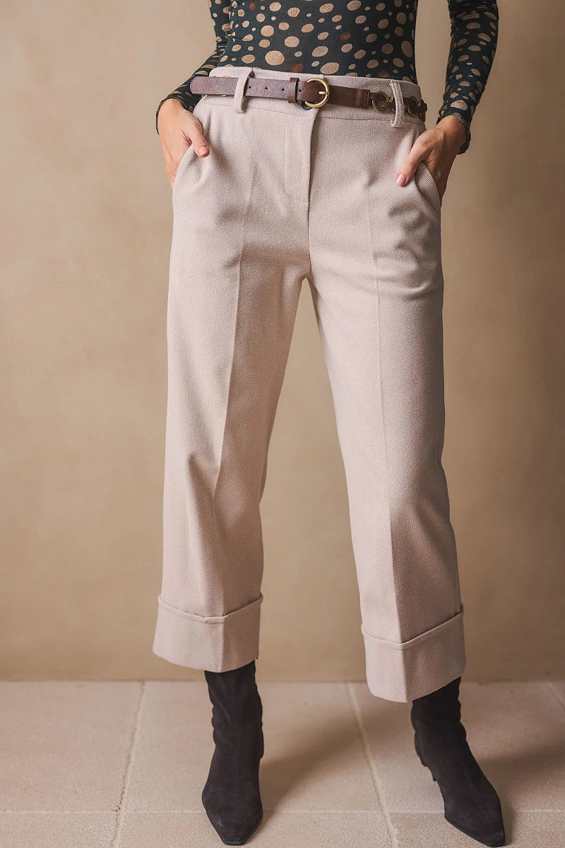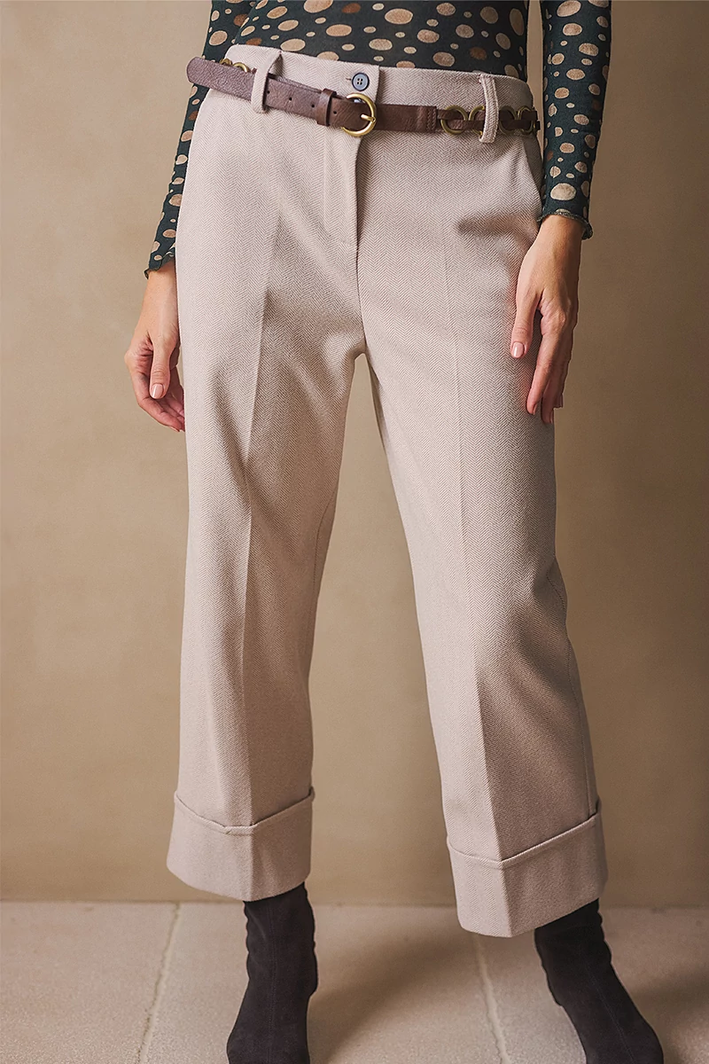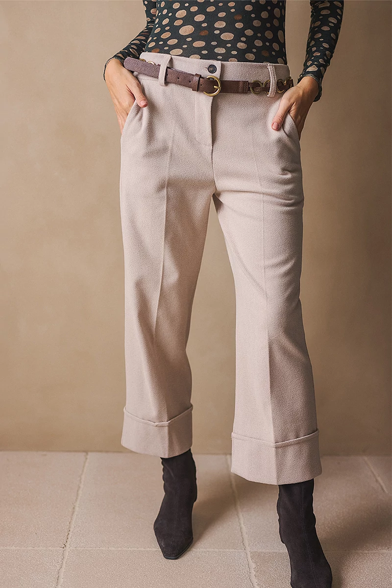 Nadrág magasabb derékrésszel, bővebb fazonú, az alján széles hajtókával, elöl 2 zsebbel. Elöl fix, hátul gumírozott derékrésszel, cipzárral és gombbal záródik. Az anyaga puha szövet.