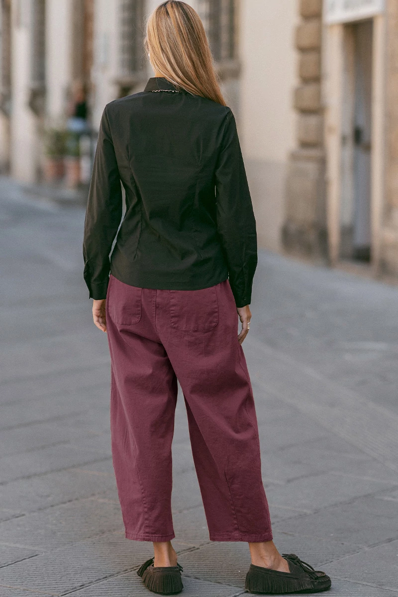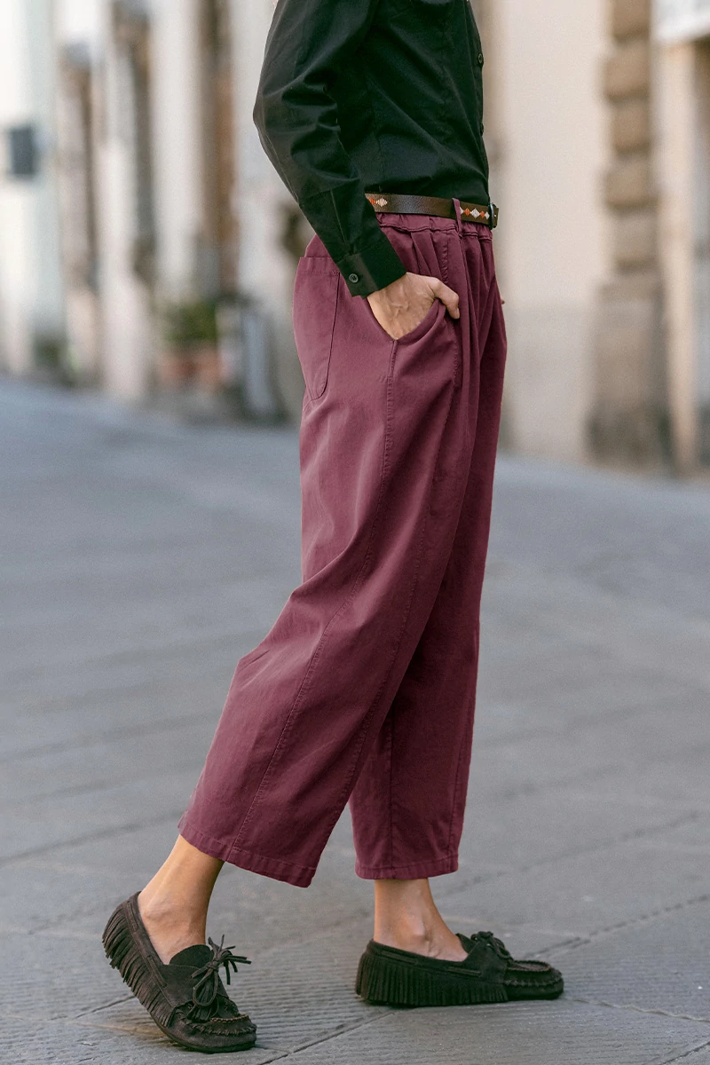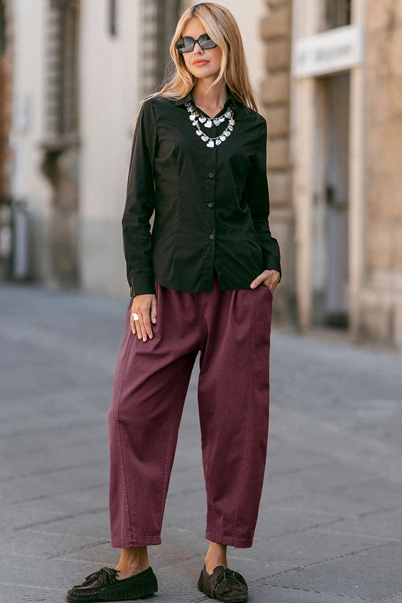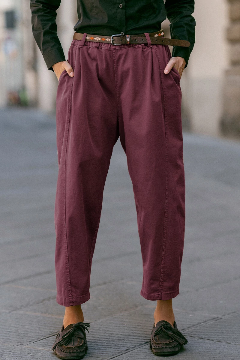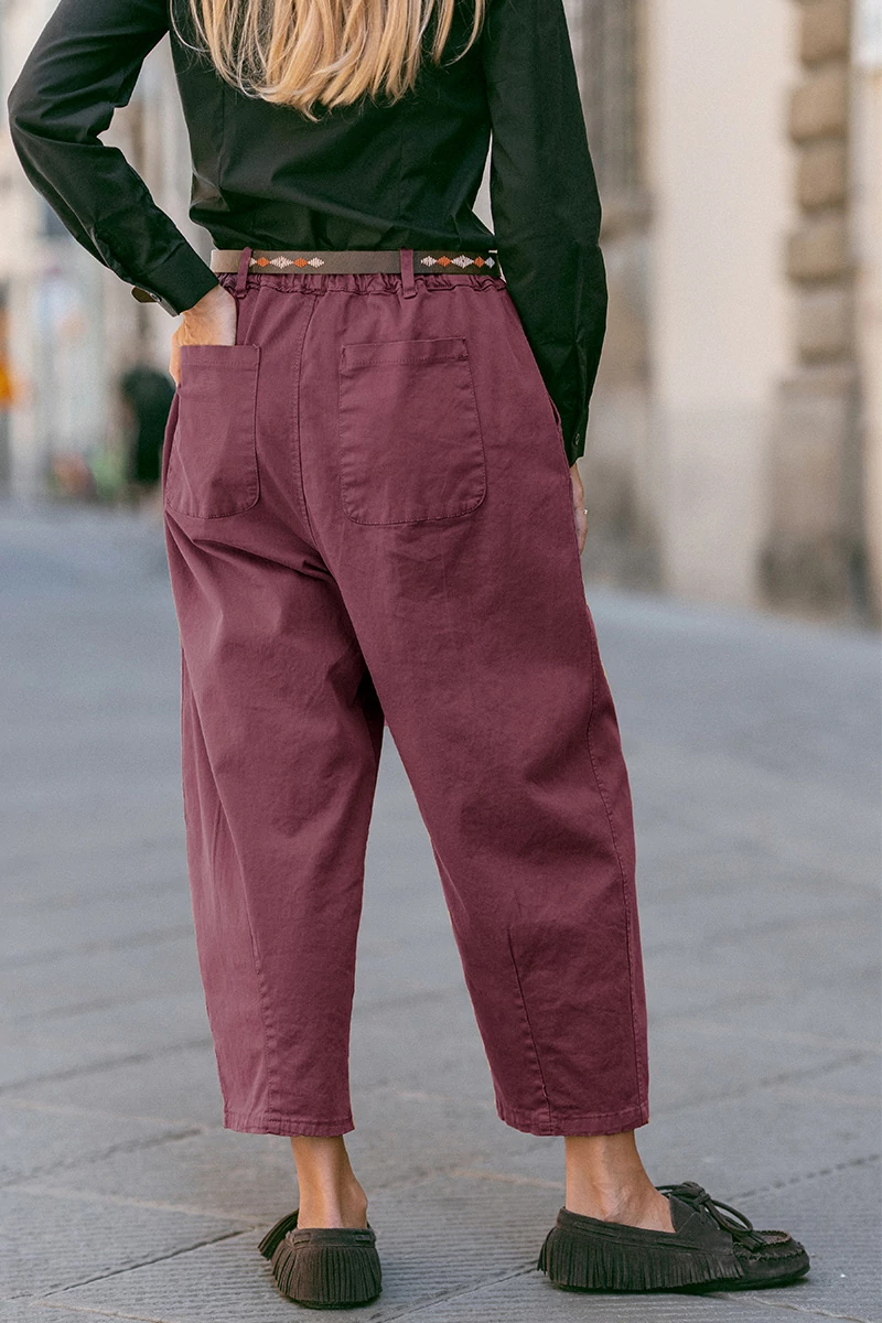 Ballon fazonú nadrág, széles, gumírozott derékkal, övbújtatóval, ajándék övvel, zsebekkel. Anyaga rugalmas, közepes vastagságú vászon.