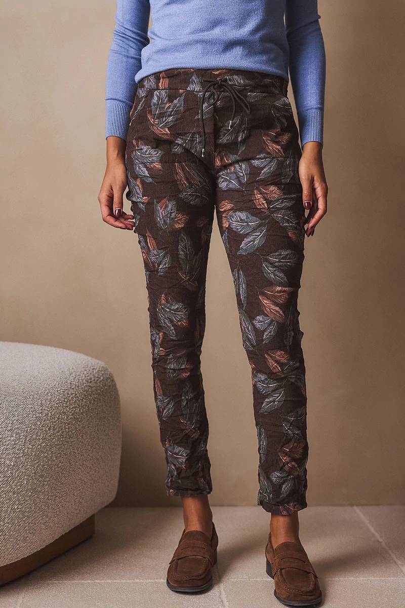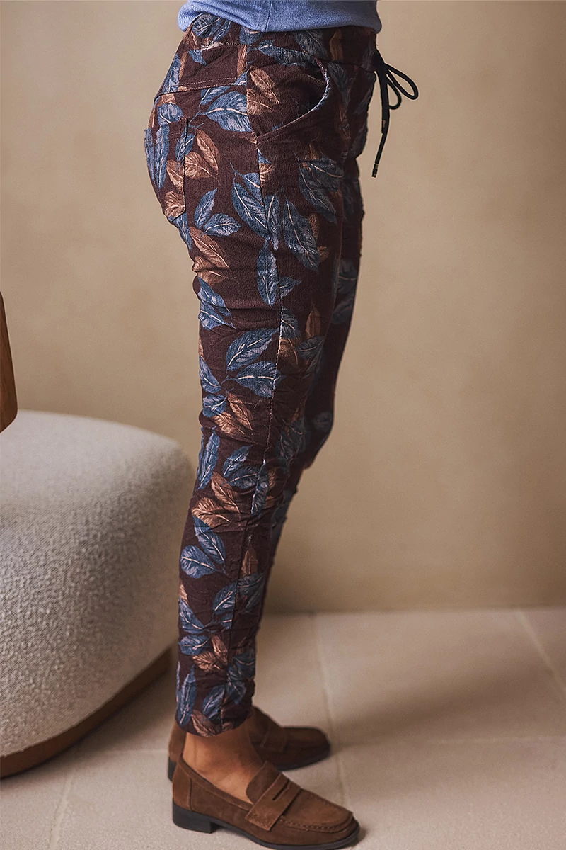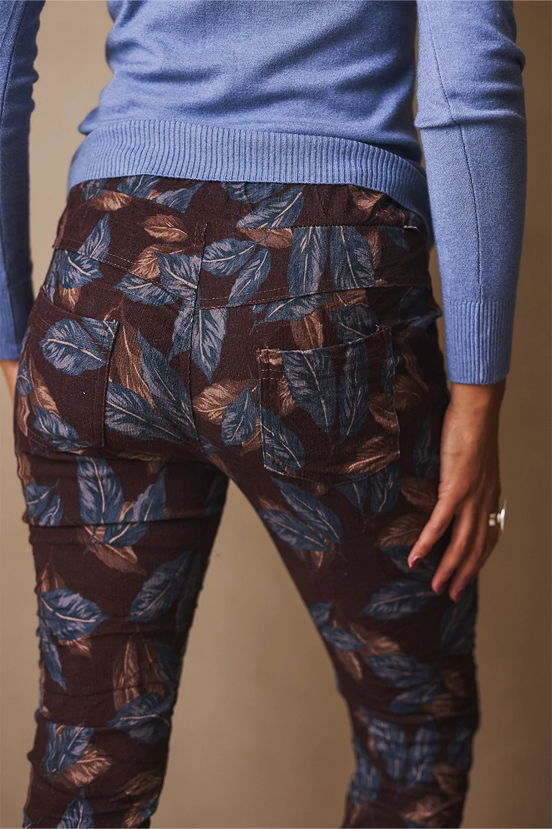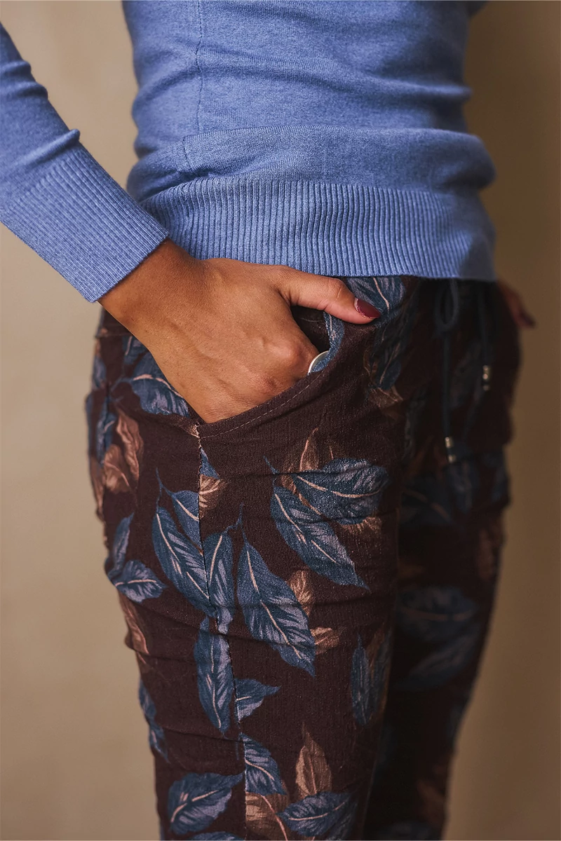 Rugalmas anyagú nadrág, széles, gumis, kötős derékrésszel, két oldalán elöl zsebekkel, lefele szűkülő szárral. Anyaga rugalmas düftin, felülete kissé bársonyos, meleg anyag.