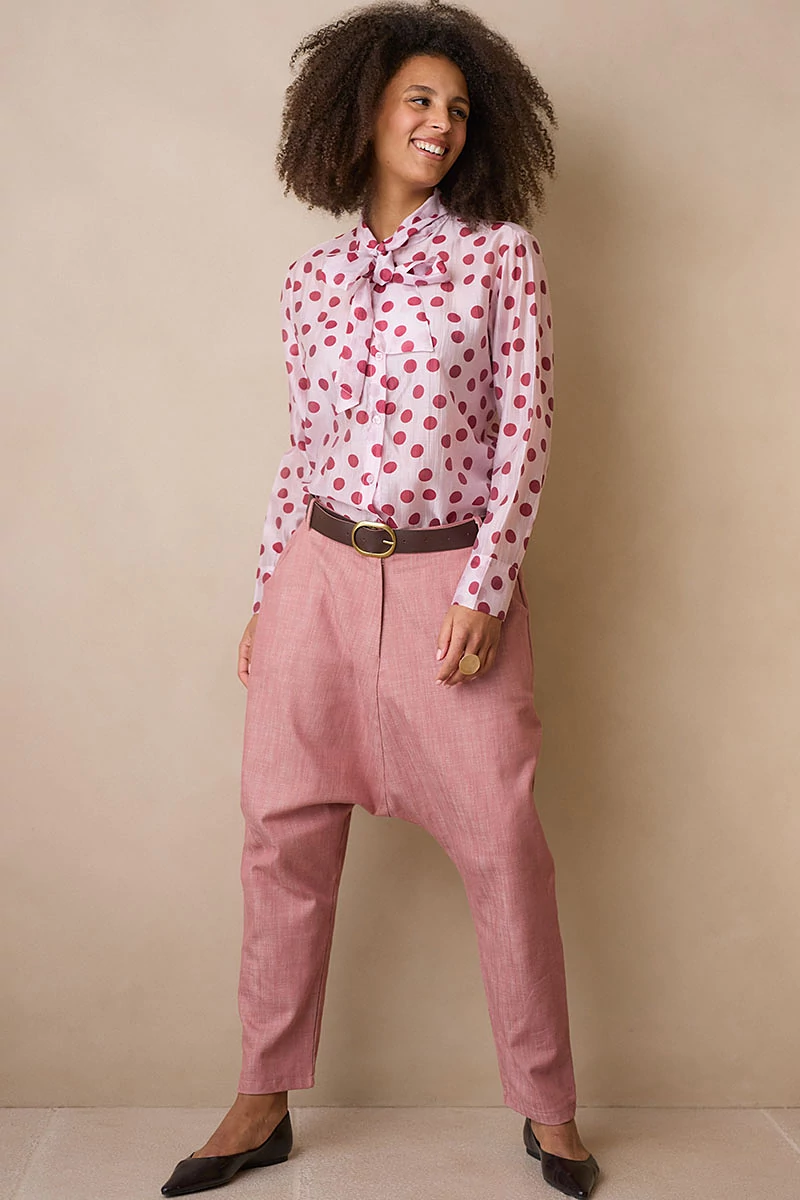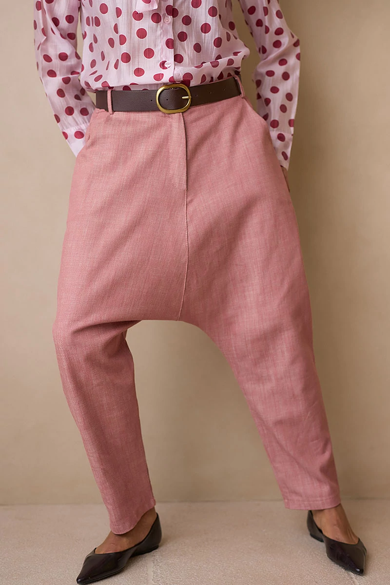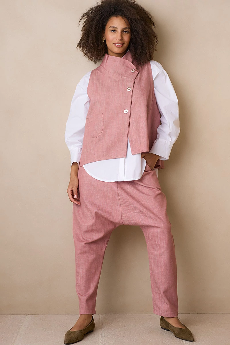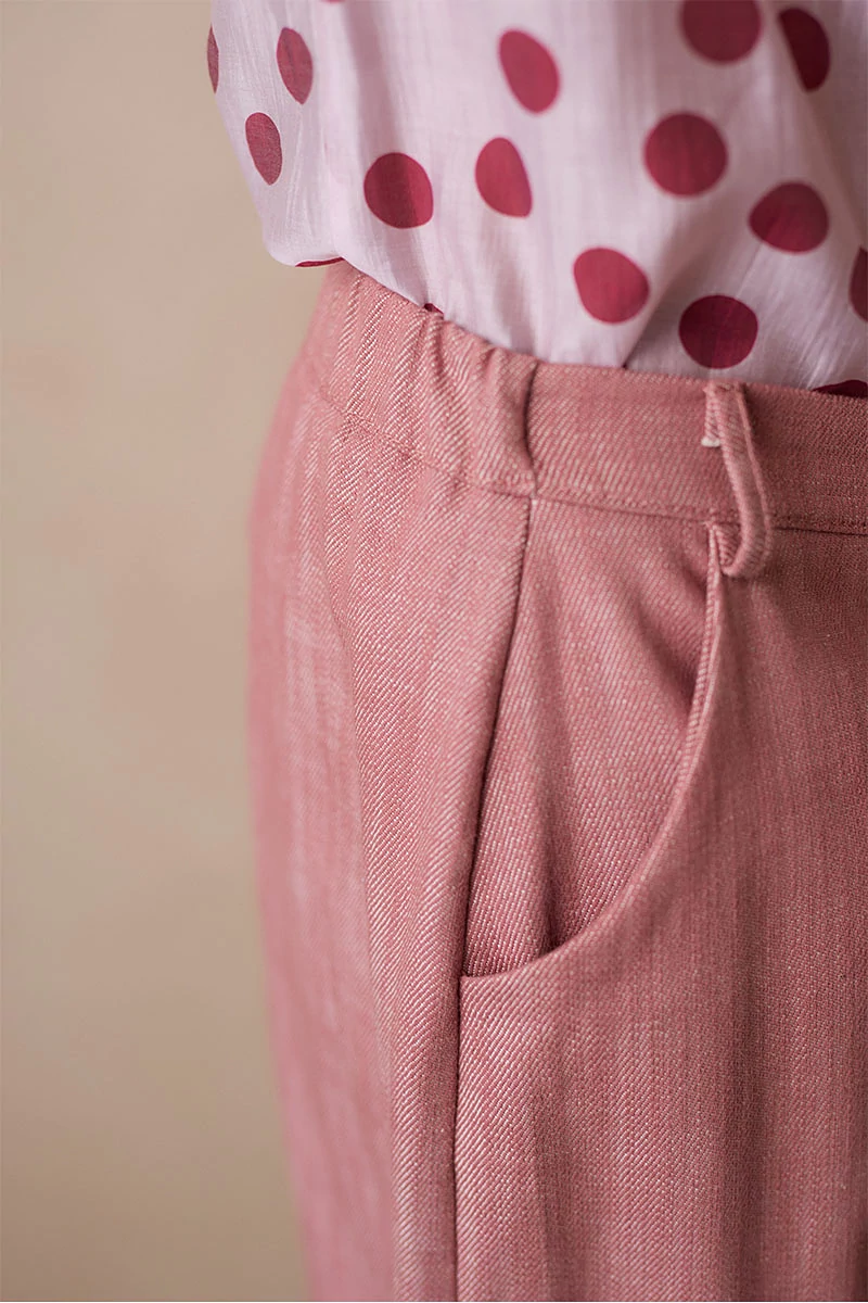 Mélyülepű, karakteres fazonú szövetnadrág elöl fix, cipzáros és gombos derékrésszel, hátul kényelmes gumírozással. Két oldalsó zsebe praktikus részletként simul a letisztult vonalvezetésbe. Szép esésű, texturált szövetanyagból készült, amely természetes mozgást és kifinomult megjelenést ad a darabnak.