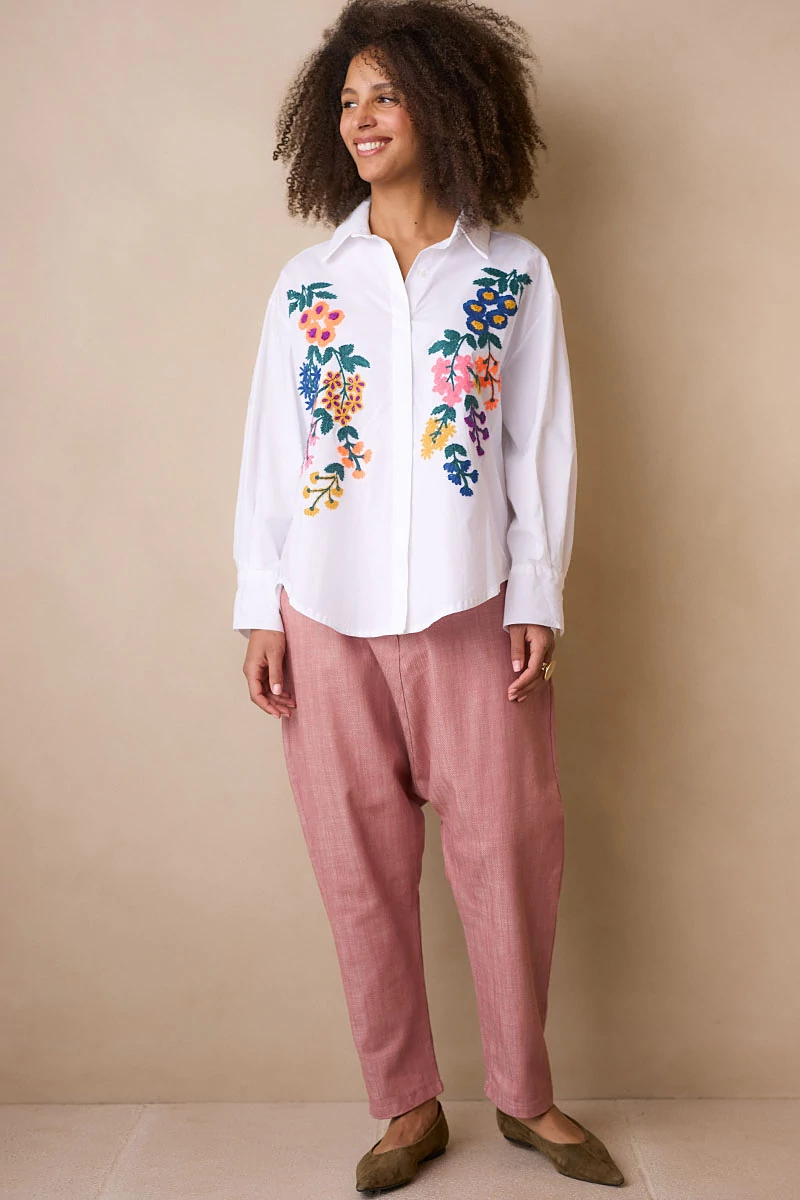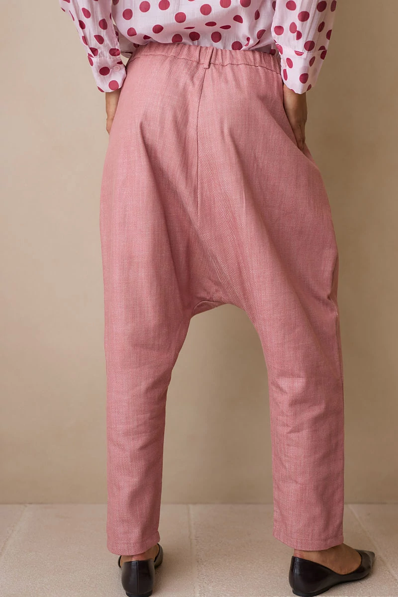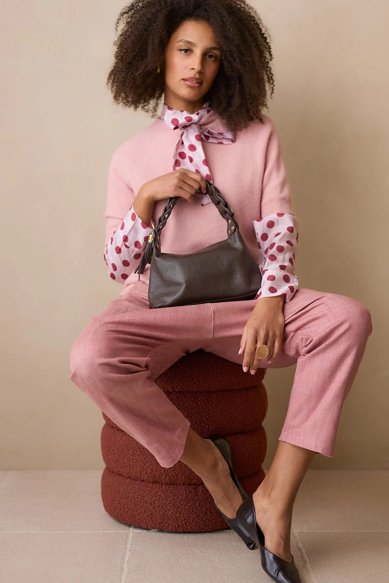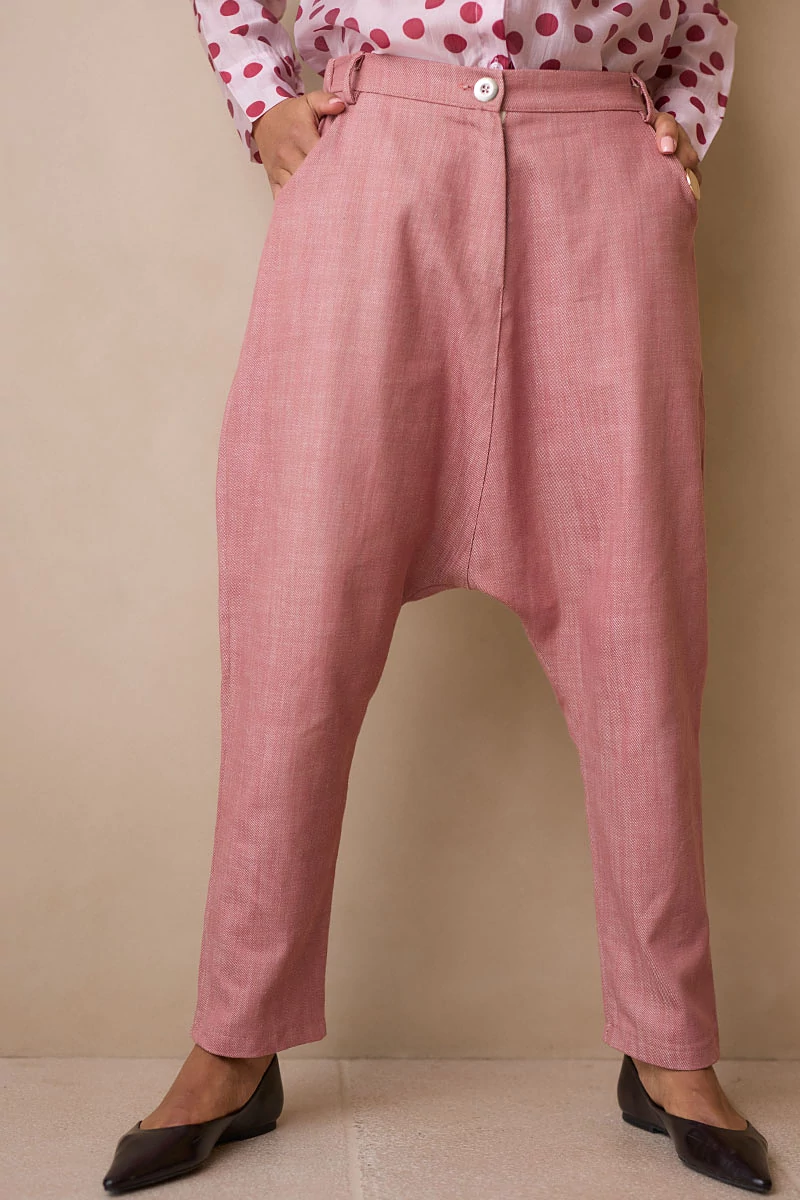 Mélyülepű, karakteres fazonú szövetnadrág elöl fix, cipzáros és gombos derékrésszel, hátul kényelmes gumírozással. Két oldalsó zsebe praktikus részletként simul a letisztult vonalvezetésbe. Szép esésű, texturált szövetanyagból készült, amely természetes mozgást és kifinomult megjelenést ad a darabnak.