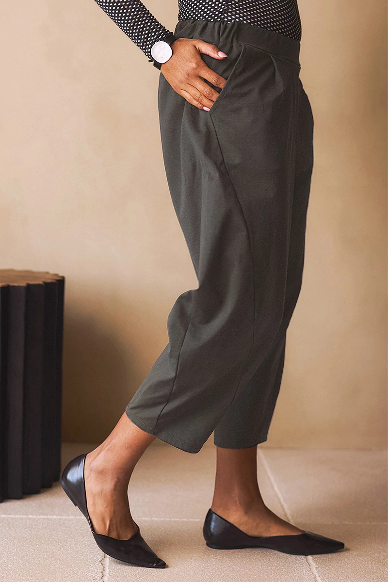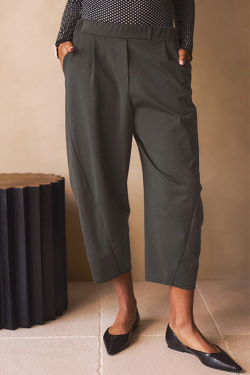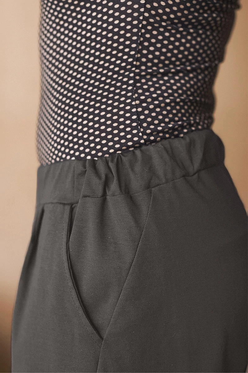Bőszárú nadrág, széles, gumírozott derékkal, zsebekkel, a ballon fazonú szárakkal. Az anyaga puha, rugalmas pamut keverék.