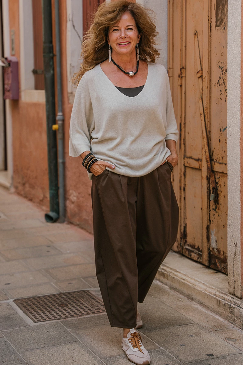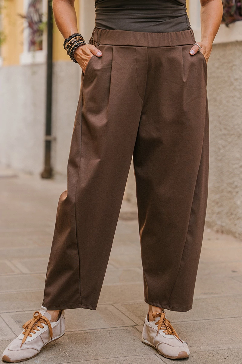 3/4-es, ballon fazonú nadrág, széles, gumírozott derékkal, zsebekkel. Anyaga rendkívül rugalmas, közepes vastagságú, enyhén selyemfényű viszkózszövet.