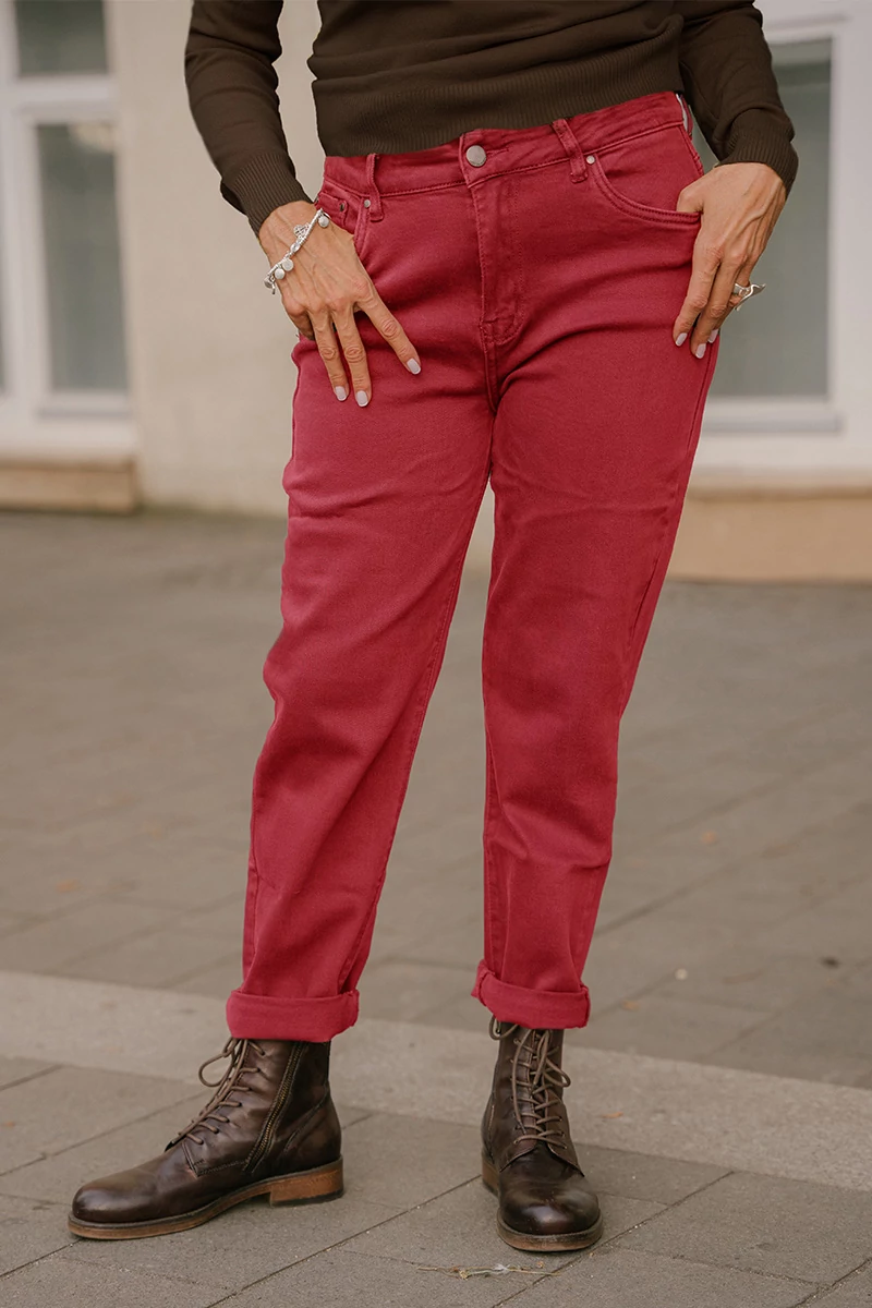 Lefele szűkülő szárú farmernadrág magas üleprésszel, öt zsebbel, a szára alján szűkítő varrásokkal. Cipzárral és gombbal záródik. Az anyaga puha, rugalmas farmer.
