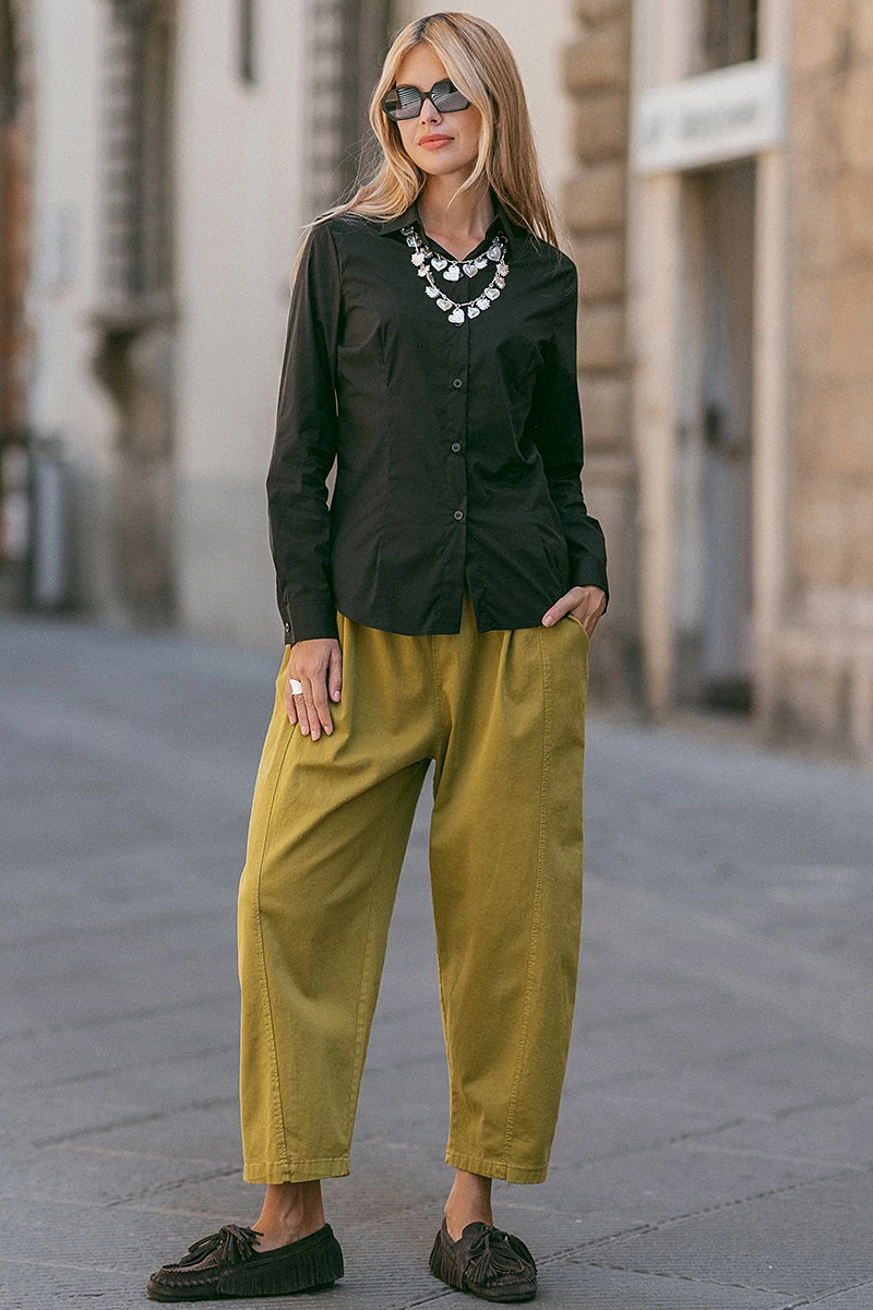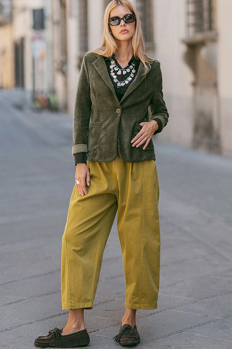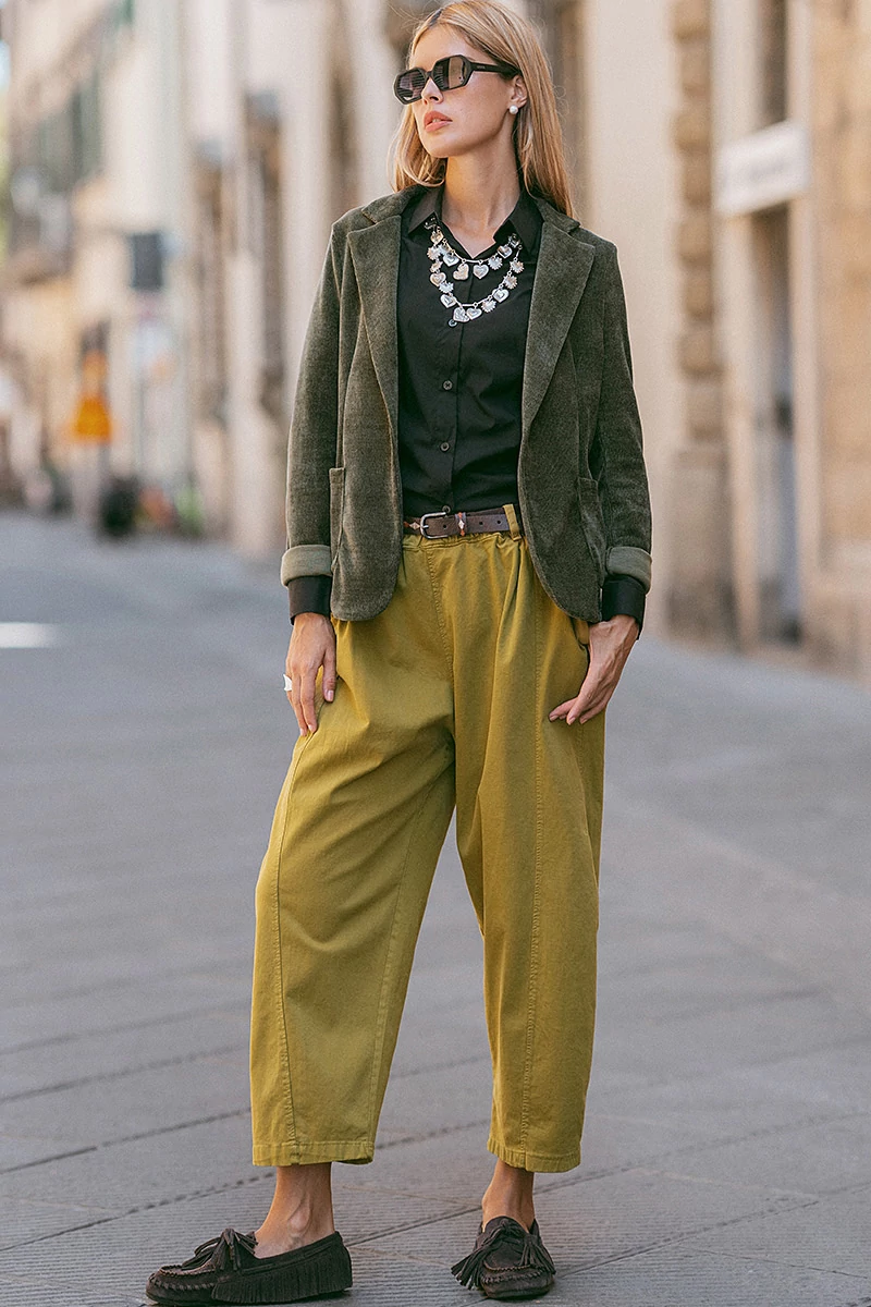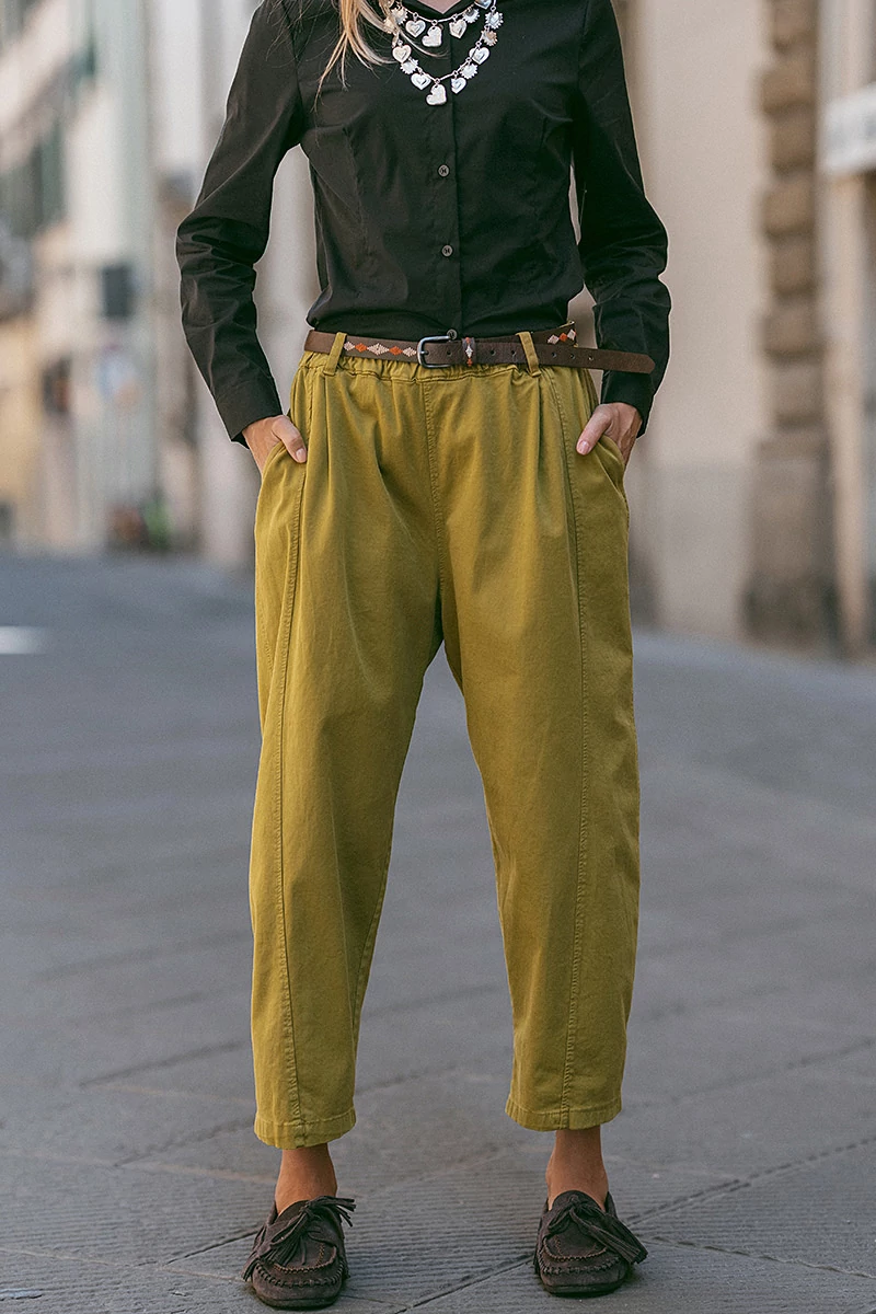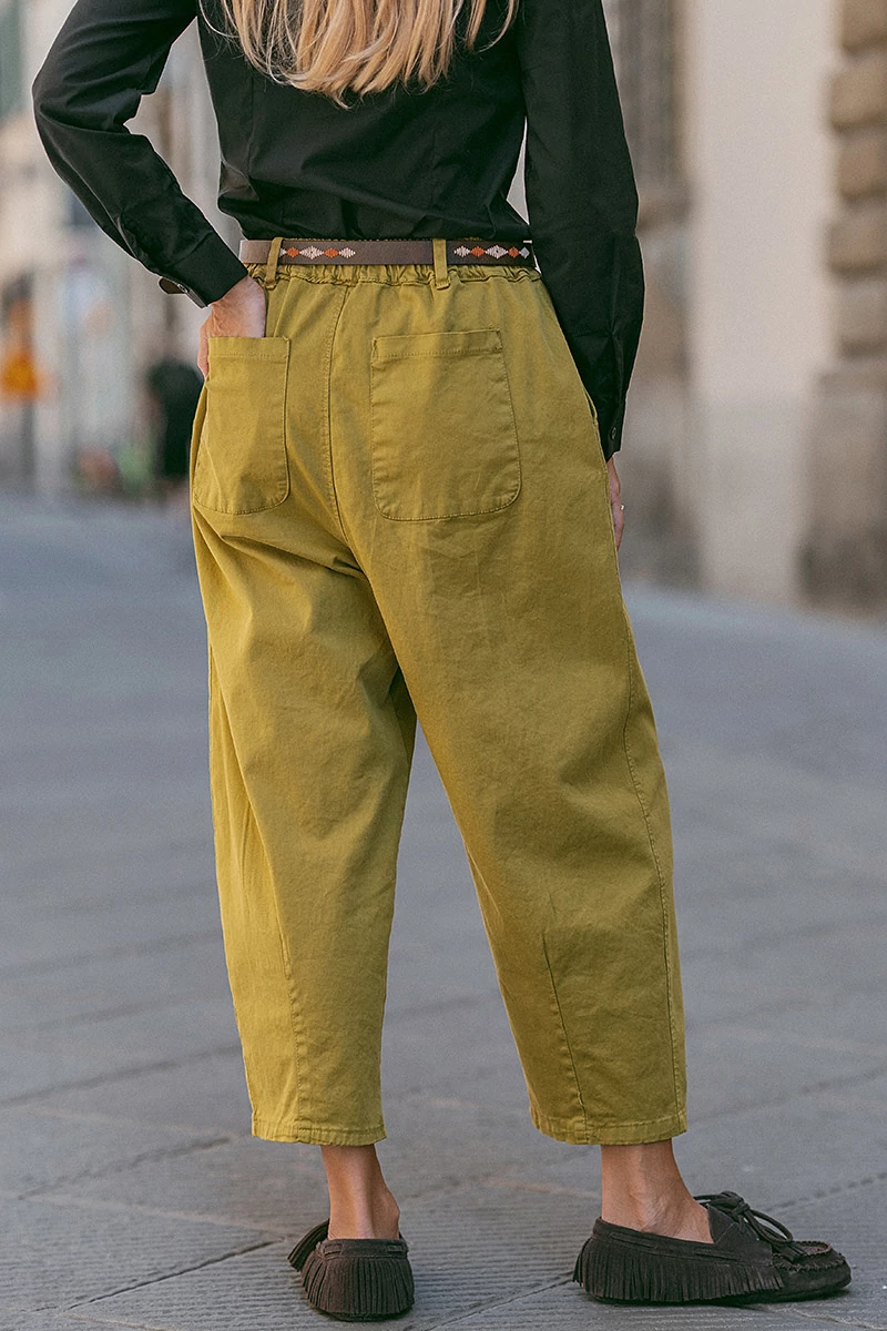 Ballon fazonú nadrág, széles, gumírozott derékkal, övbújtatóval, ajándék övvel, zsebekkel. Anyaga rugalmas, közepes vastagságú vászon.