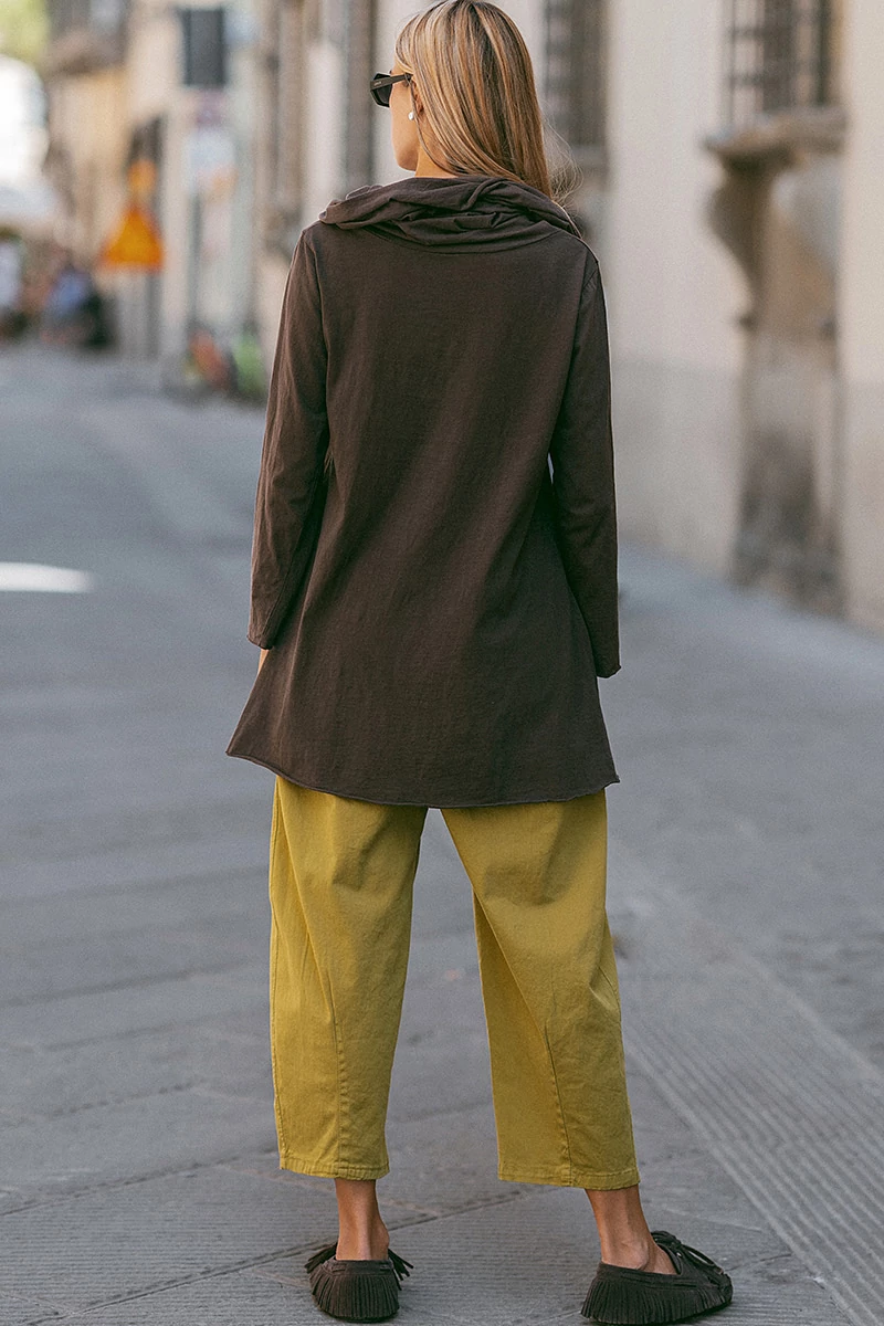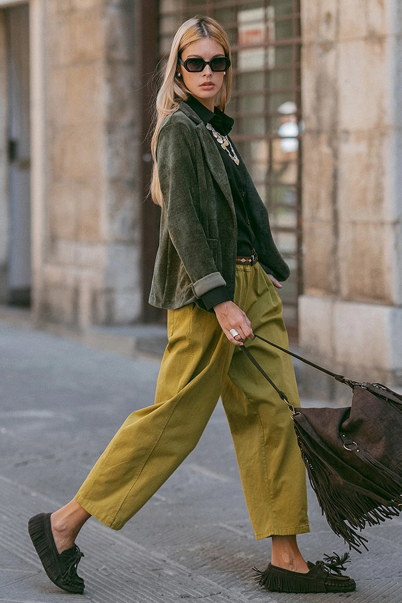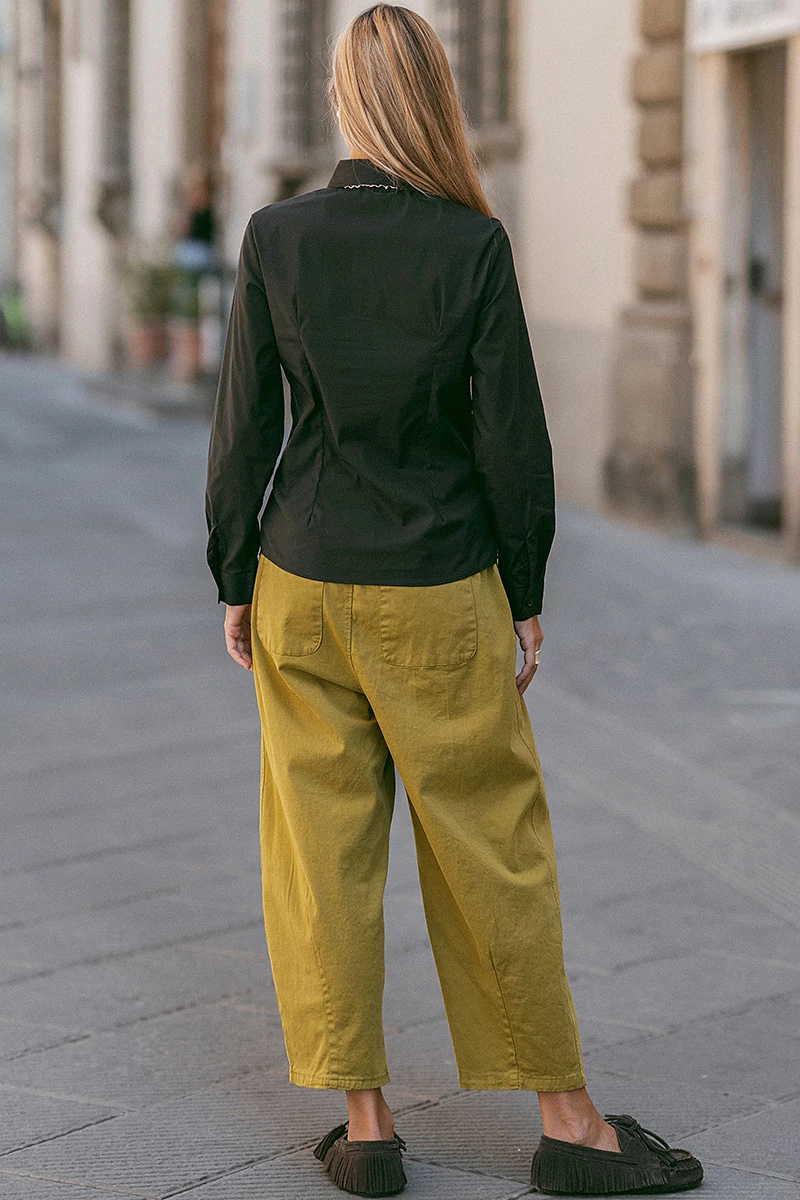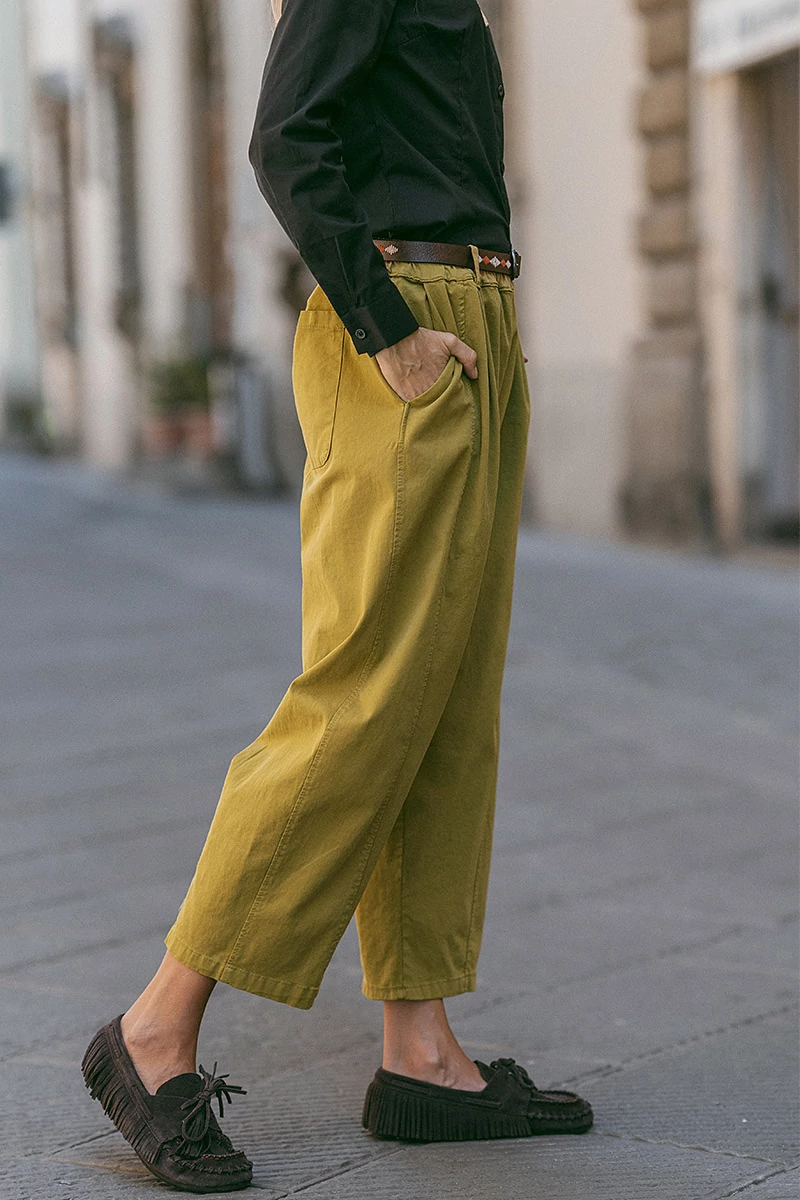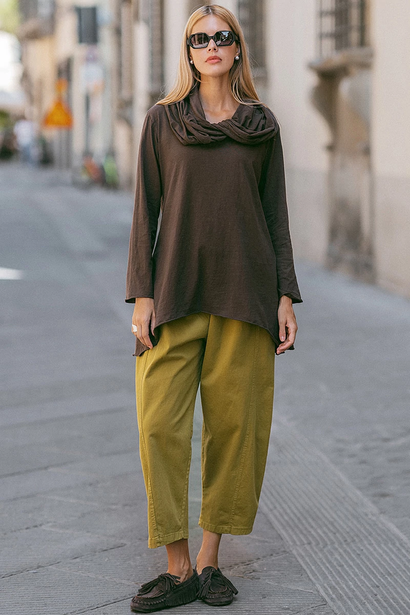 Ballon fazonú nadrág, széles, gumírozott derékkal, övbújtatóval, ajándék övvel, zsebekkel. Anyaga rugalmas, közepes vastagságú vászon.