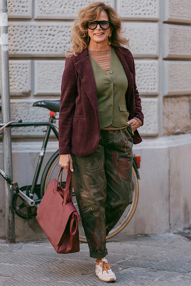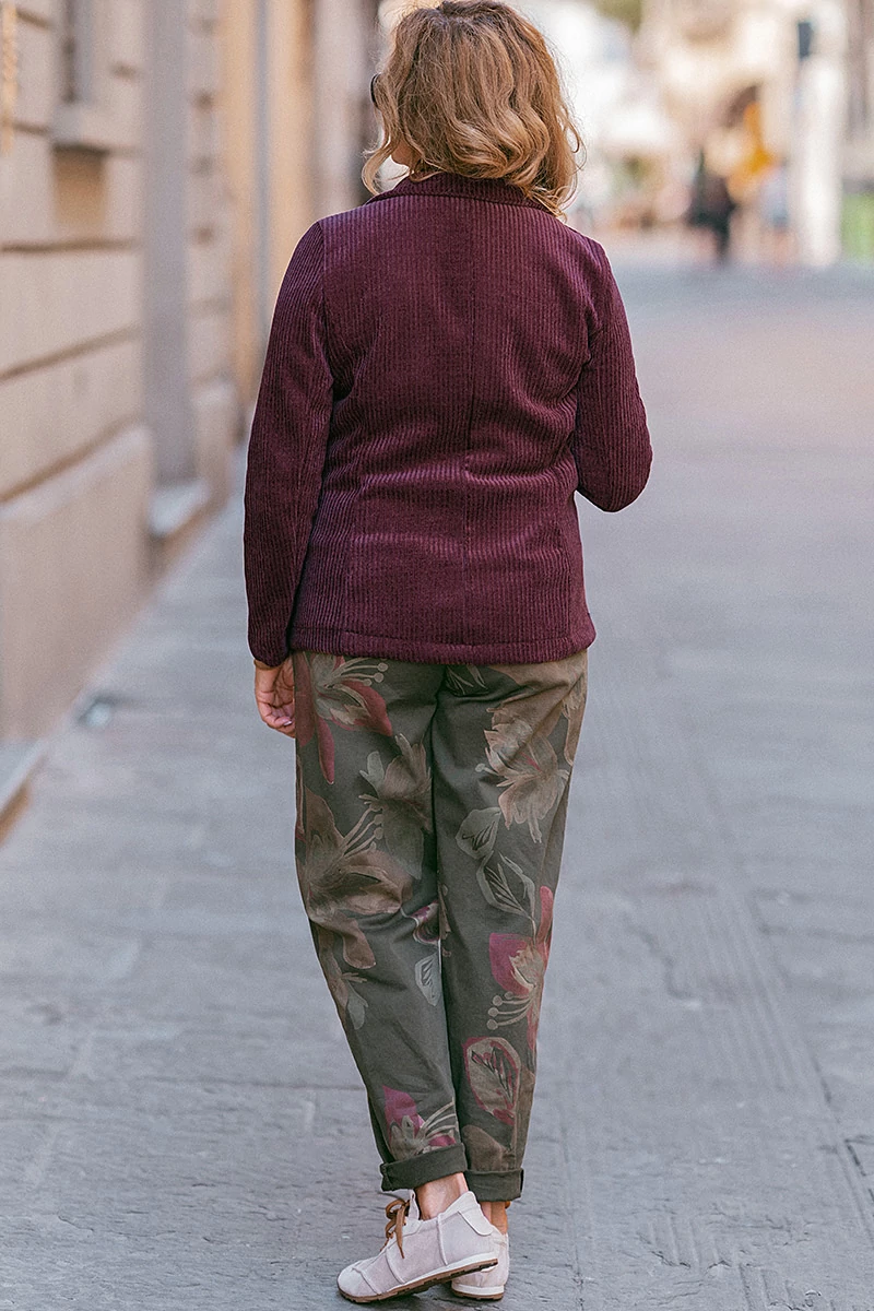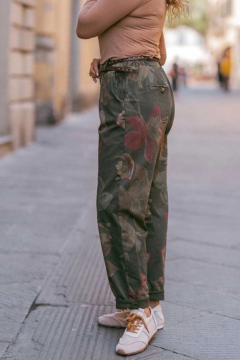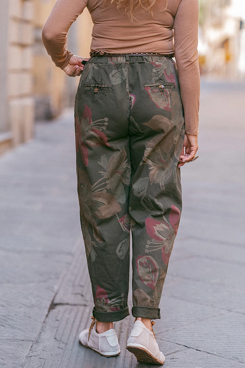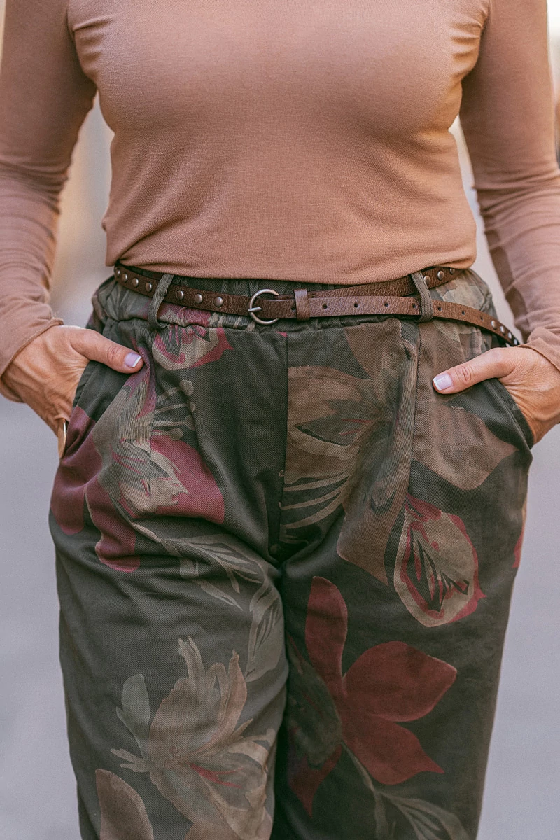 Lefele szűkülő szárú, svédzsebes nadrág, széles, gumis derékkal, övbújtatókkal, hátul gombos díszzsebekkel, A nadrághoz ajándék egy vékony, szegecselt öv. A nadrág anyaga rugalmas, puha pamutvászon.