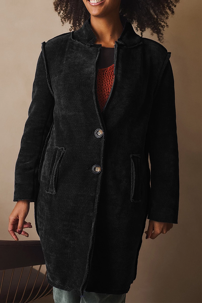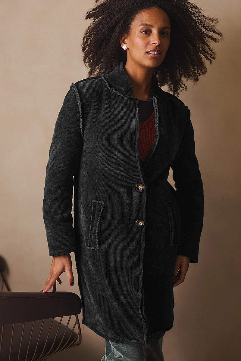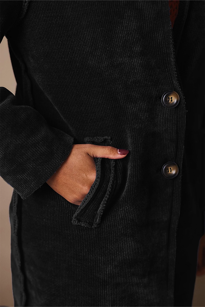 Ez a hosszú kabát különleges kettősséget hordoz magában: kívül kord mintás, belül pedig buklés, vastag anyag gondoskodik a melegségről és a kényelemről. A kifordított varrások modern, nyers hatást adnak, miközben a klasszikus részletek a galléros, hajtókás nyak, az elöl gombos záródás és a praktikus zsebek időtállóvá teszik a fazont.Egy kabát, ami egyszerre ölelően meleg és vagányan stílusos, tökéletes választás a hidegebb napok sokoldalú összeállításaihoz.
