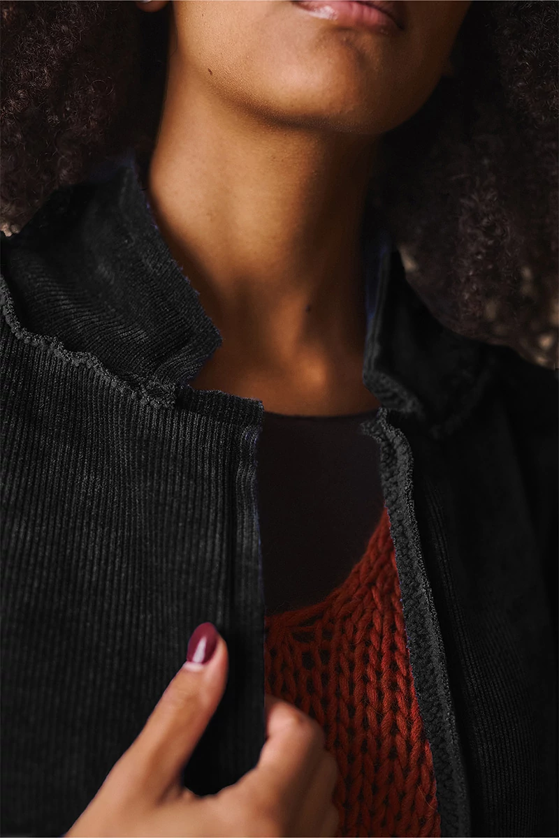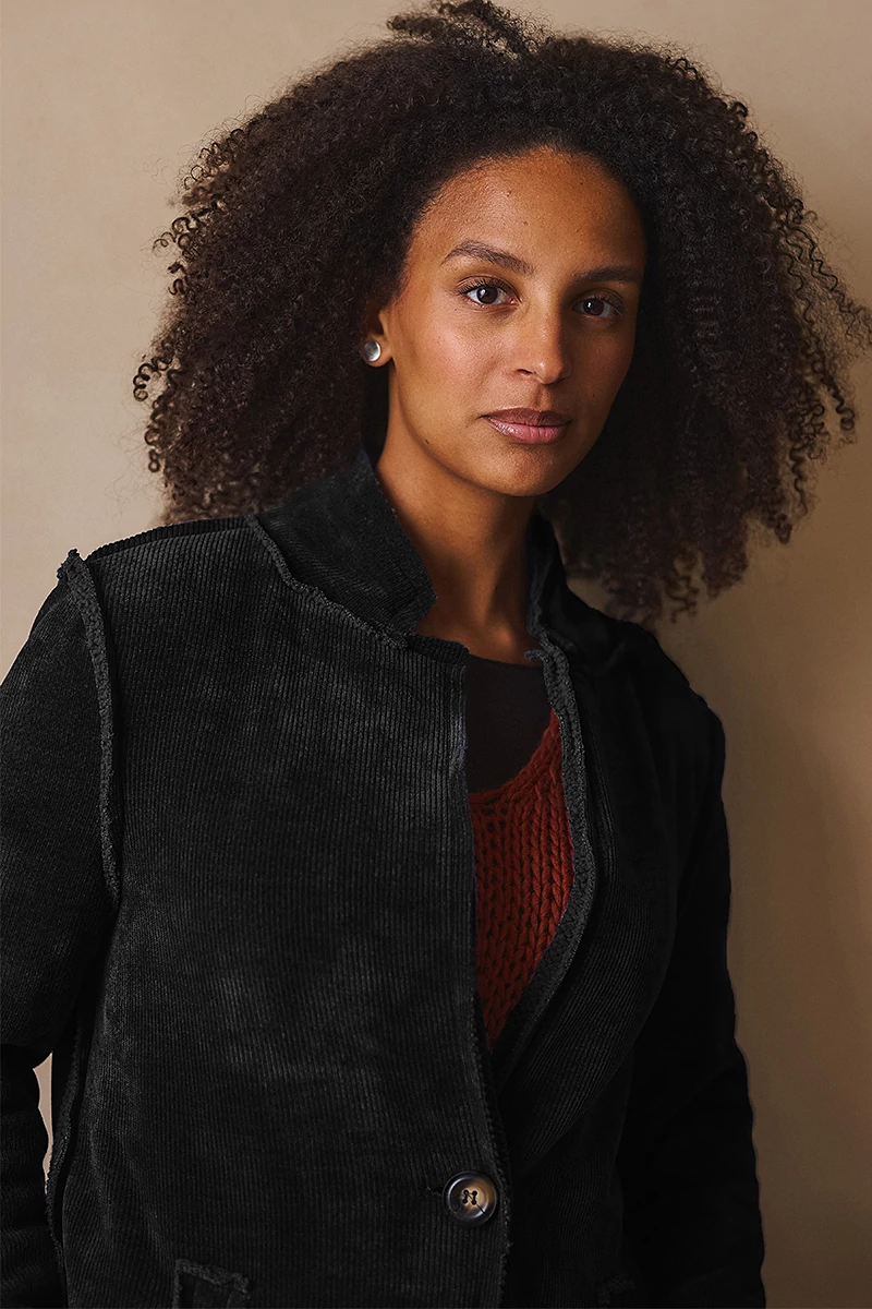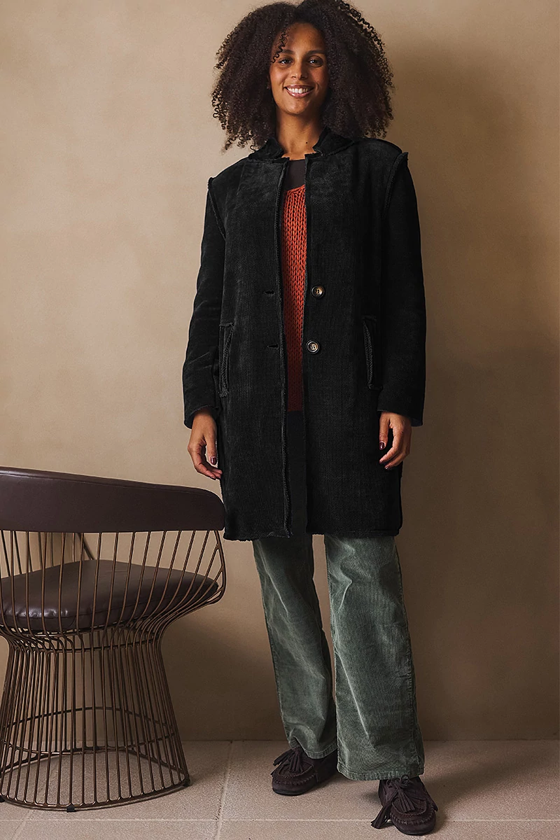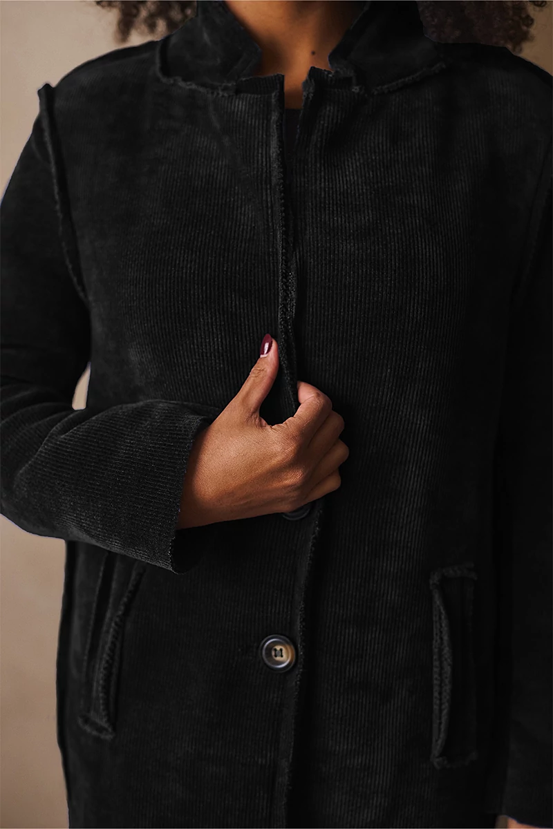 Ez a hosszú kabát különleges kettősséget hordoz magában: kívül kord mintás, belül pedig buklés, vastag anyag gondoskodik a melegségről és a kényelemről. A kifordított varrások modern, nyers hatást adnak, miközben a klasszikus részletek a galléros, hajtókás nyak, az elöl gombos záródás és a praktikus zsebek időtállóvá teszik a fazont.Egy kabát, ami egyszerre ölelően meleg és vagányan stílusos, tökéletes választás a hidegebb napok sokoldalú összeállításaihoz.