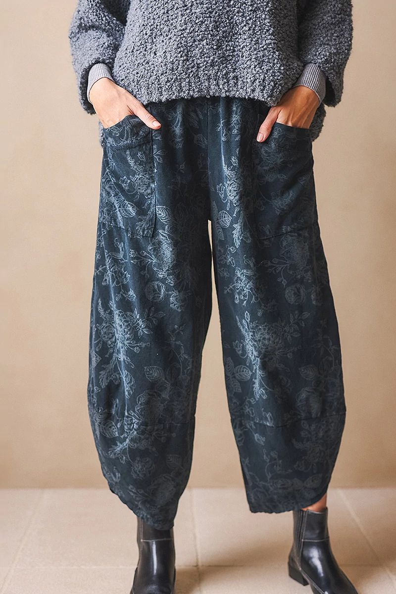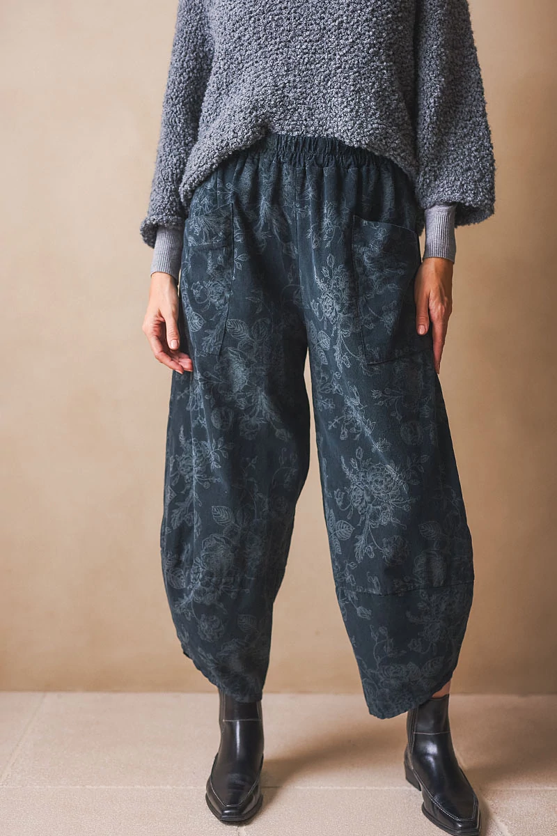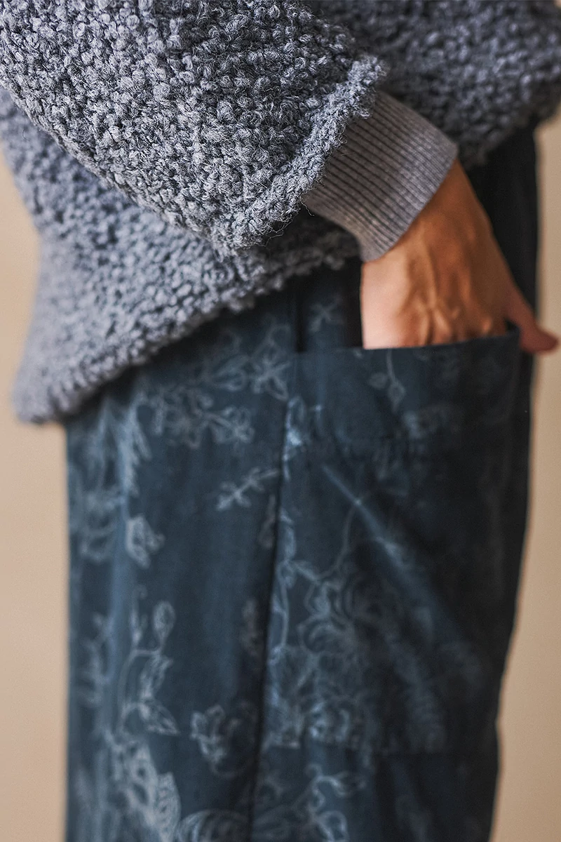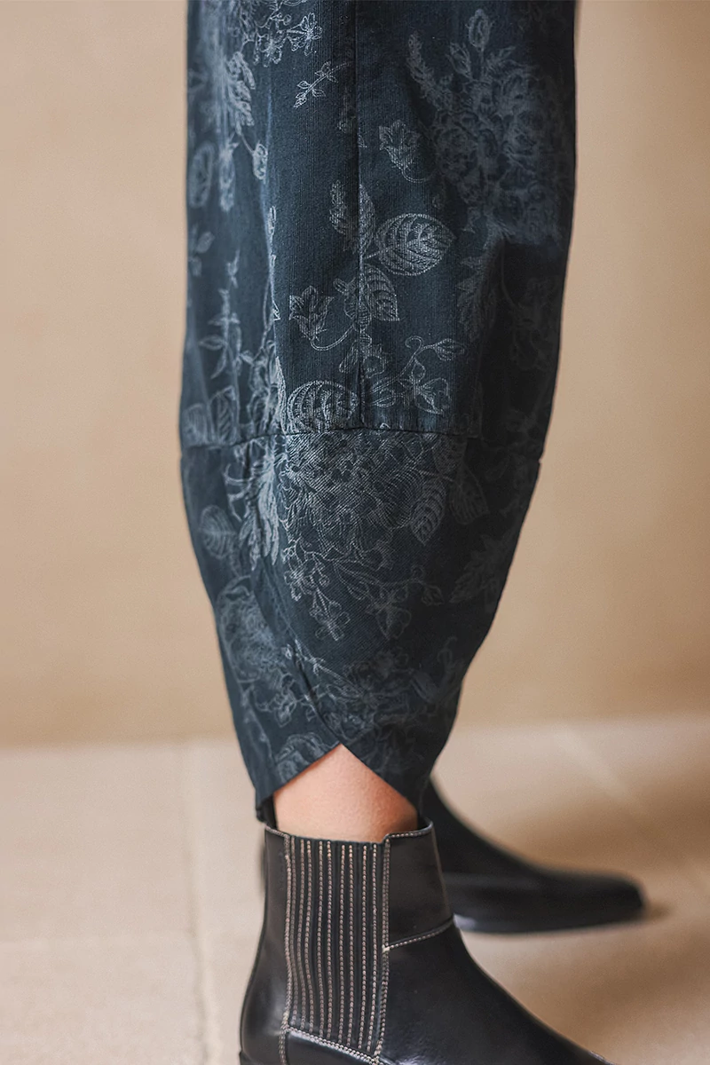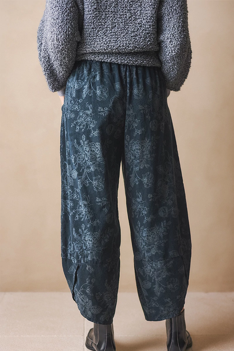 Düftin nadrág gumis derékkal, zsebekkel, ballon fazonú, széles nadrágszárakkal. A szára alján íves, ráhajtásos díszítéssel. Anyaga puha, rugalmas, düftin.