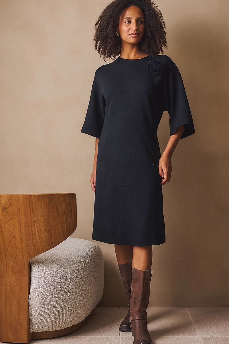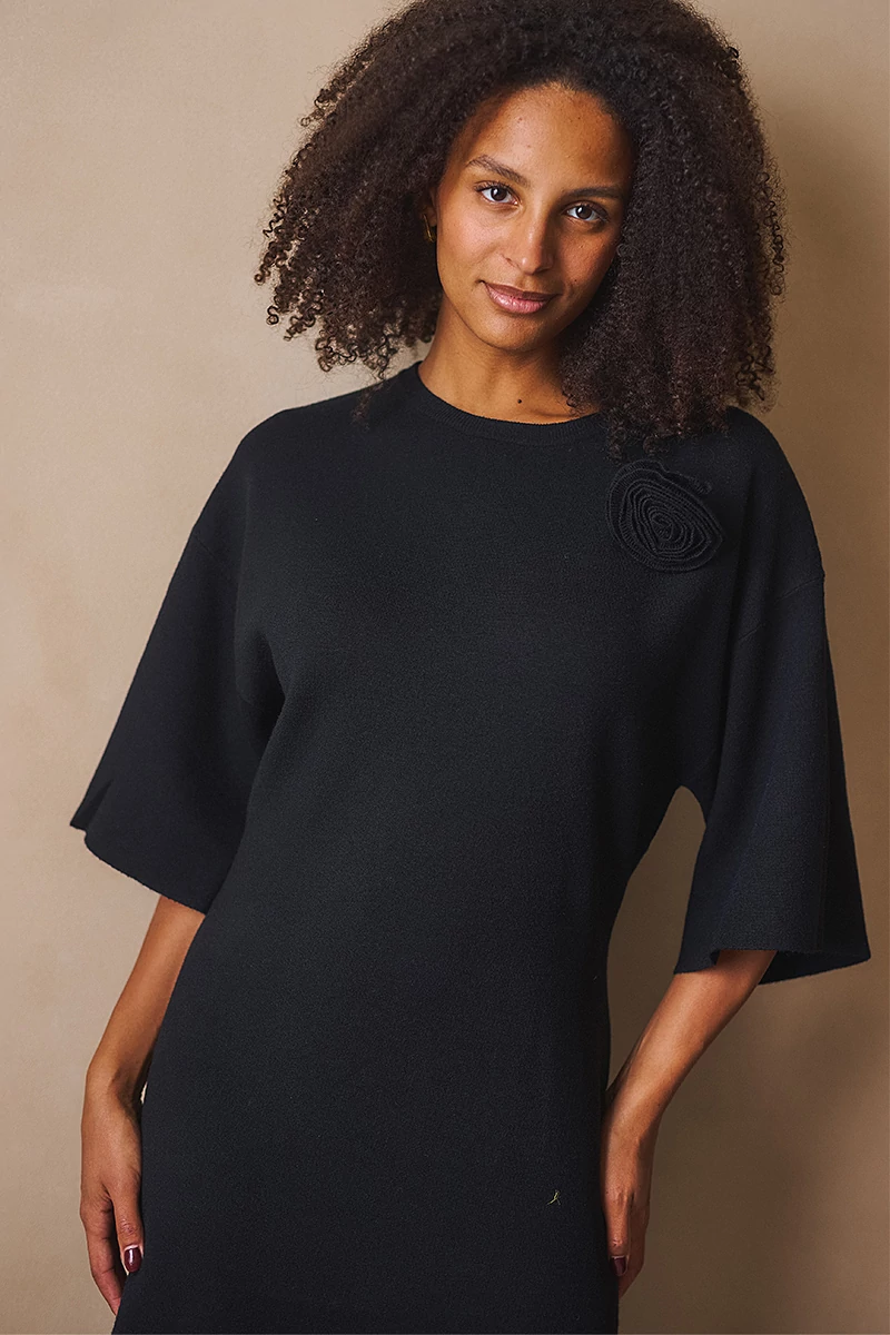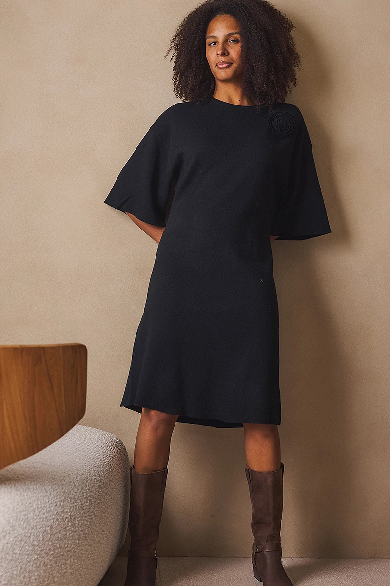 Ez a kötött ruha a letisztultság és a nőies részletek tökéletes egyensúlya.Egyenes vonalú, közepes hosszúságú fazonja kényelmes és elegáns, az 1/2-es bő ujj pedig könnyed mozgást enged. Az alján és az ujja végén passzé nélküli megoldás finom egyszerűséget ad, míg a kerek, passzés nyakkivágás harmonikusan zárja a vonalakat. A levehető, rózsa formájú textil kitűző játékos, romantikus részlet, amely személyessé teszi a darabot.Egy ruha, amelyben természetesen lehetsz elegáns, minden mozdulatában ott van a könnyedség és a női finomság.