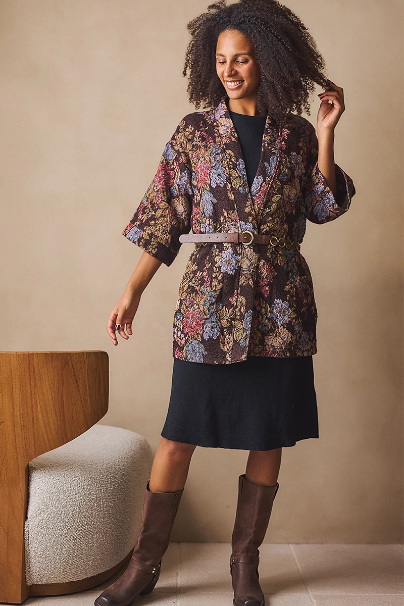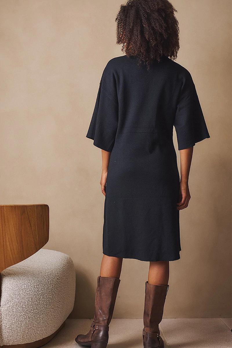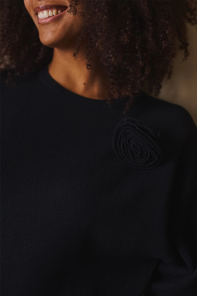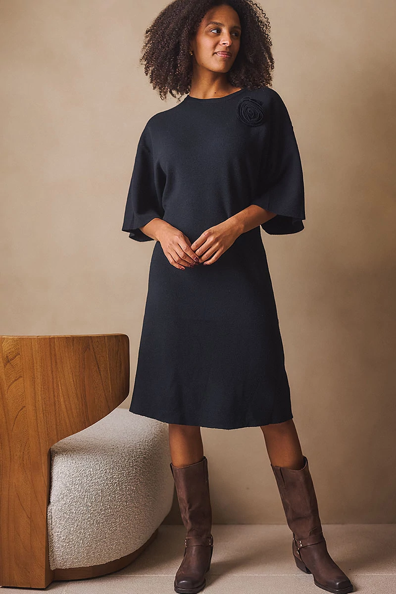 Ez a kötött ruha a letisztultság és a nőies részletek tökéletes egyensúlya.Egyenes vonalú, közepes hosszúságú fazonja kényelmes és elegáns, az 1/2-es bő ujj pedig könnyed mozgást enged. Az alján és az ujja végén passzé nélküli megoldás finom egyszerűséget ad, míg a kerek, passzés nyakkivágás harmonikusan zárja a vonalakat. A levehető, rózsa formájú textil kitűző játékos, romantikus részlet, amely személyessé teszi a darabot.Egy ruha, amelyben természetesen lehetsz elegáns, minden mozdulatában ott van a könnyedség és a női finomság.