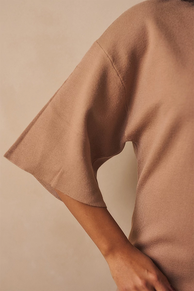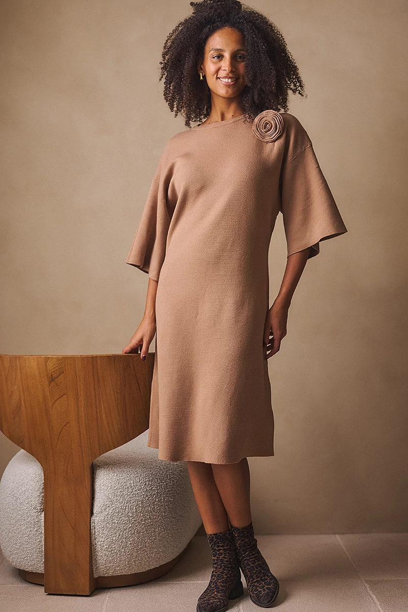 Ez a kötött ruha a letisztultság és a nőies részletek tökéletes egyensúlya.Egyenes vonalú, közepes hosszúságú fazonja kényelmes és elegáns, az 1/2-es bő ujj pedig könnyed mozgást enged. Az alján és az ujja végén passzé nélküli megoldás finom egyszerűséget ad, míg a kerek, passzés nyakkivágás harmonikusan zárja a vonalakat. A levehető, rózsa formájú textil kitűző játékos, romantikus részlet, amely személyessé teszi a darabot.Egy ruha, amelyben természetesen lehetsz elegáns, minden mozdulatában ott van a könnyedség és a női finomság.