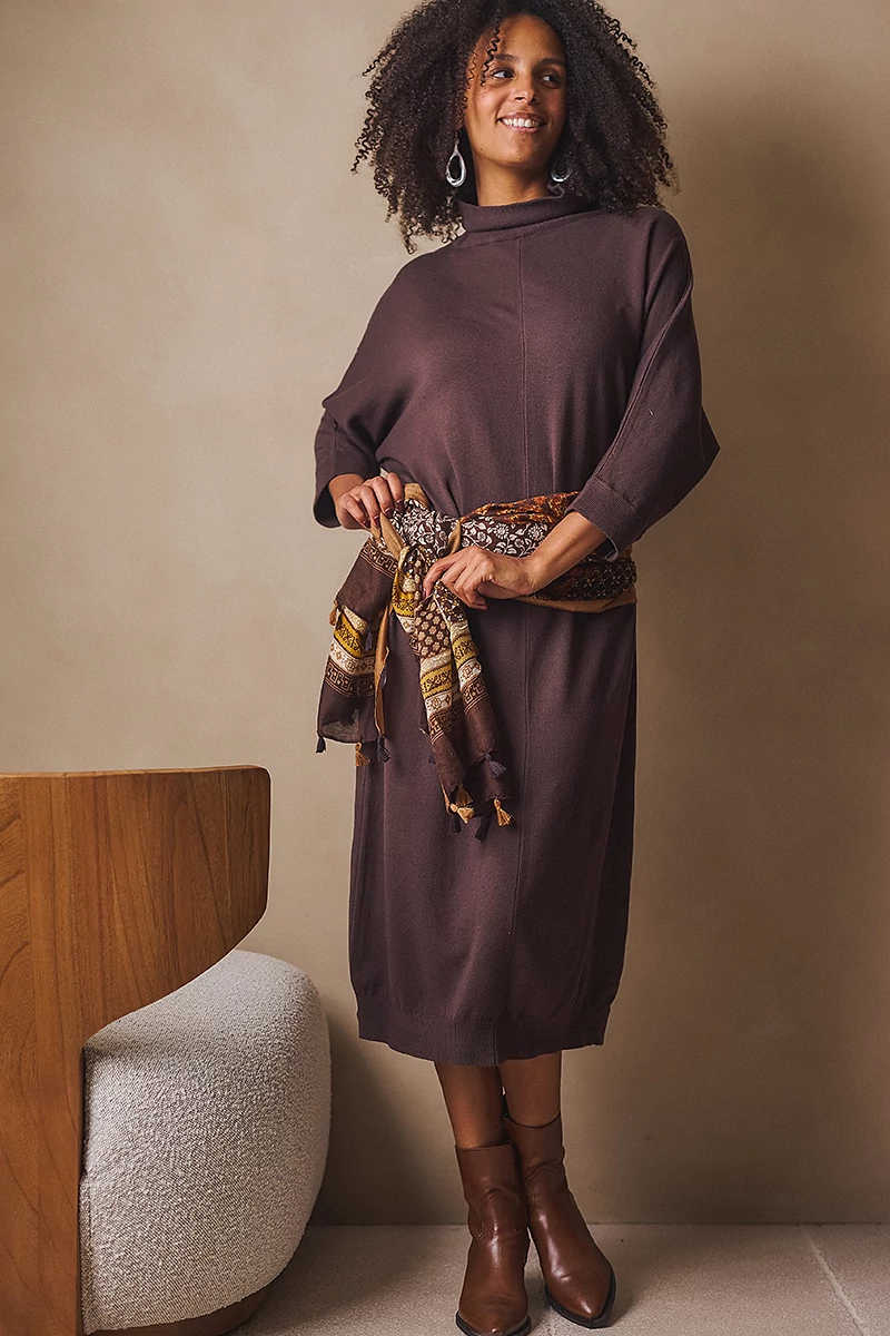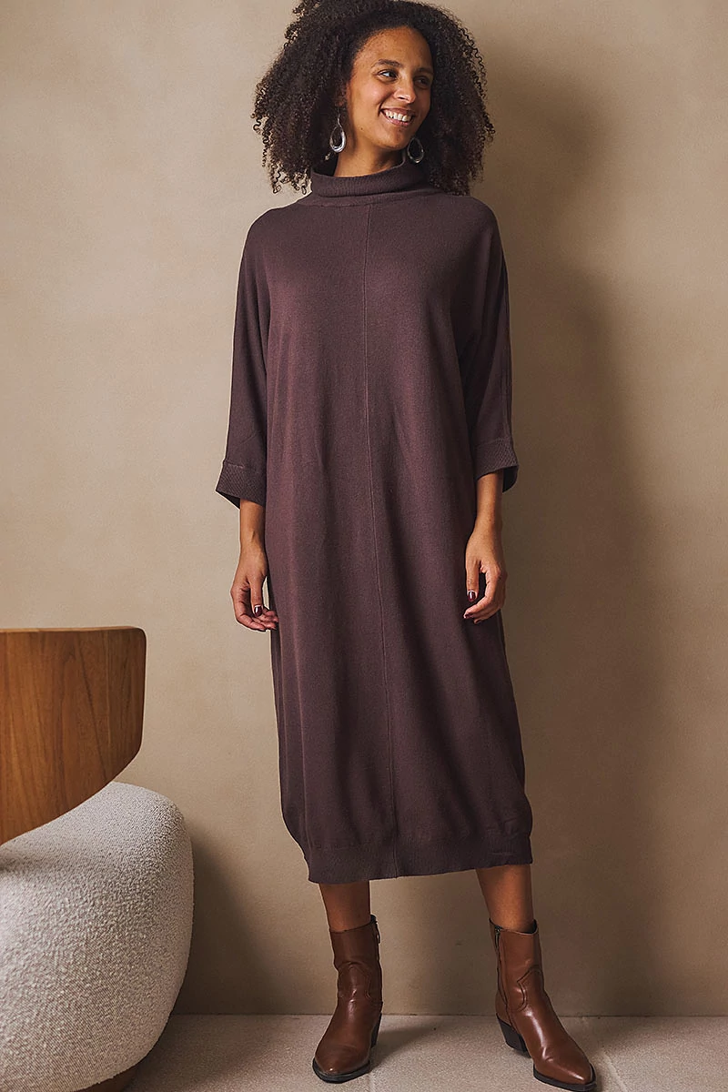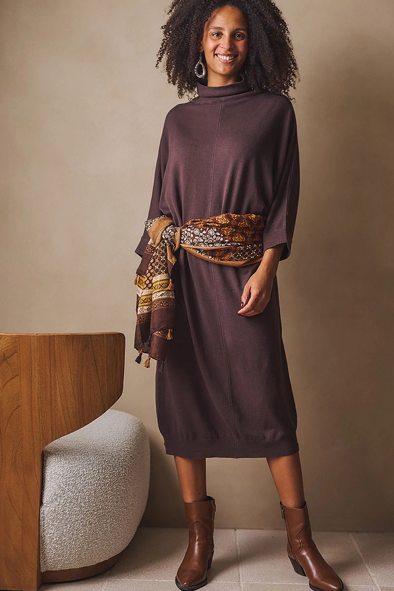 Finomkötött pulóverruha a letisztult elegancia és a kényelmes nőiesség darabja.Egyenes fazonja lágyan követi a test vonalát, a 3/4-es denevér ujj és a garbós nyak finom, modern karaktert ad neki. Az alján és az ujja végén passzé zárja a formát, ami kiegyensúlyozza a lezser szabást. Vékonyabb, puha finomkötött anyaga kellemesen lágy esésű, így a ruha egyszerre könnyed, elegáns és igazán komfortos, tökéletes választás a hűvösebb napokra.