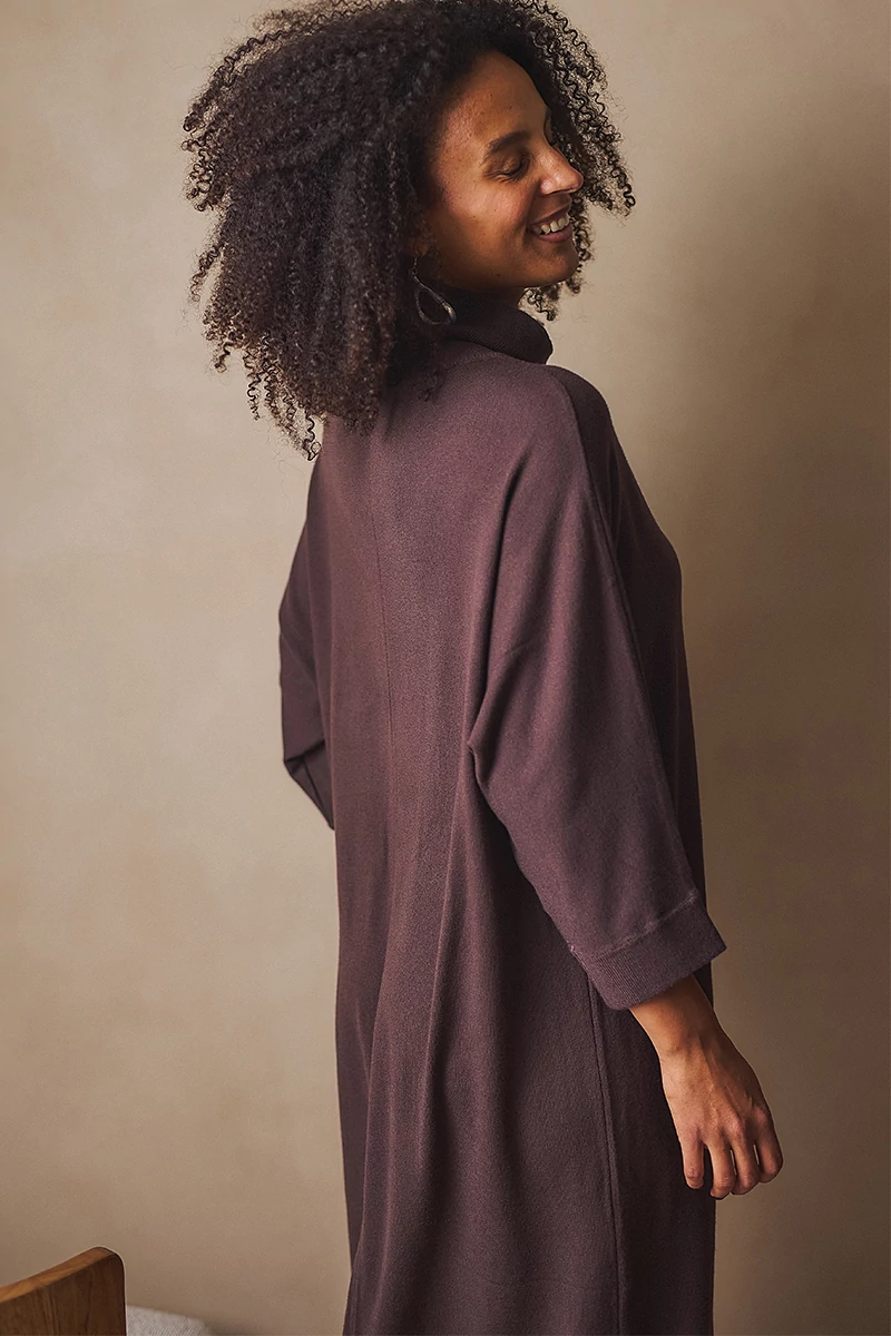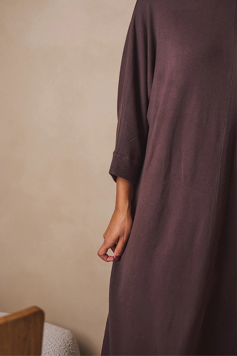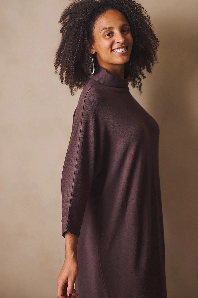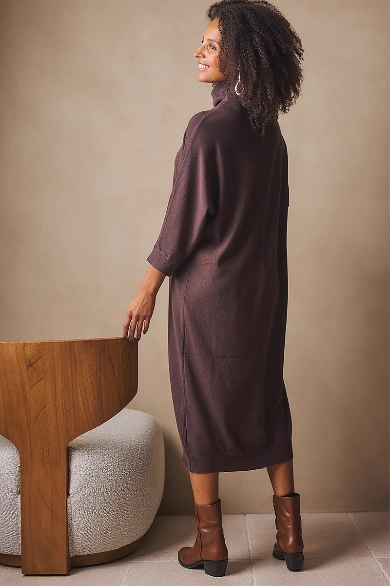 Finomkötött pulóverruha a letisztult elegancia és a kényelmes nőiesség darabja.Egyenes fazonja lágyan követi a test vonalát, a 3/4-es denevér ujj és a garbós nyak finom, modern karaktert ad neki. Az alján és az ujja végén passzé zárja a formát, ami kiegyensúlyozza a lezser szabást. Vékonyabb, puha finomkötött anyaga kellemesen lágy esésű, így a ruha egyszerre könnyed, elegáns és igazán komfortos, tökéletes választás a hűvösebb napokra.