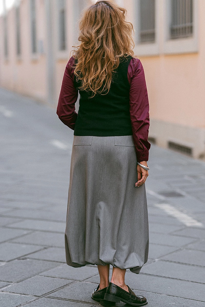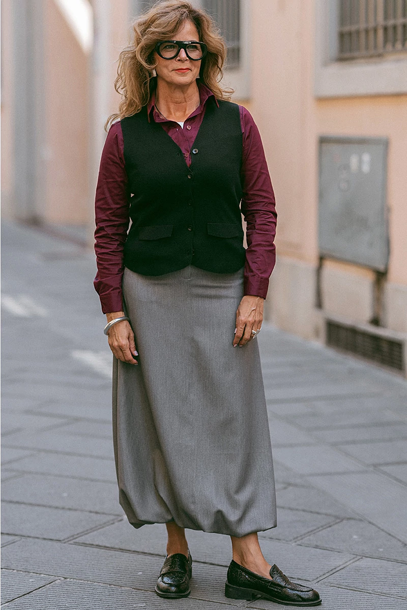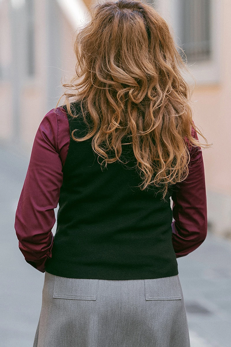 Rövid szabású kötött mellény álzsebekkel, elöl gombokkal záródik. Anyaga rugalmas.