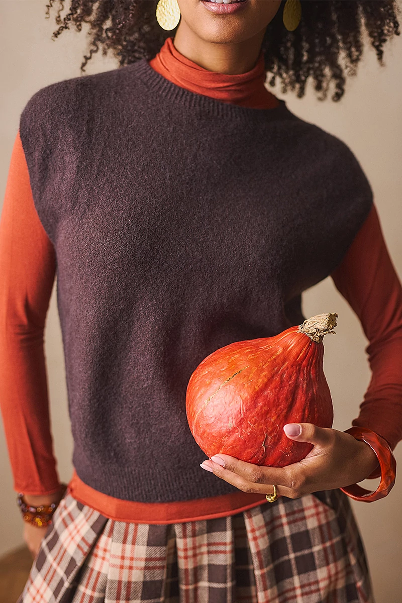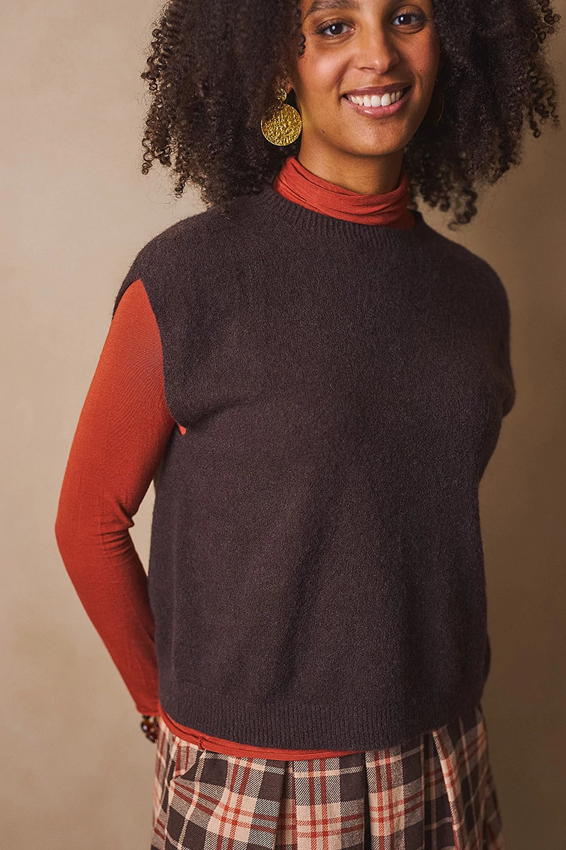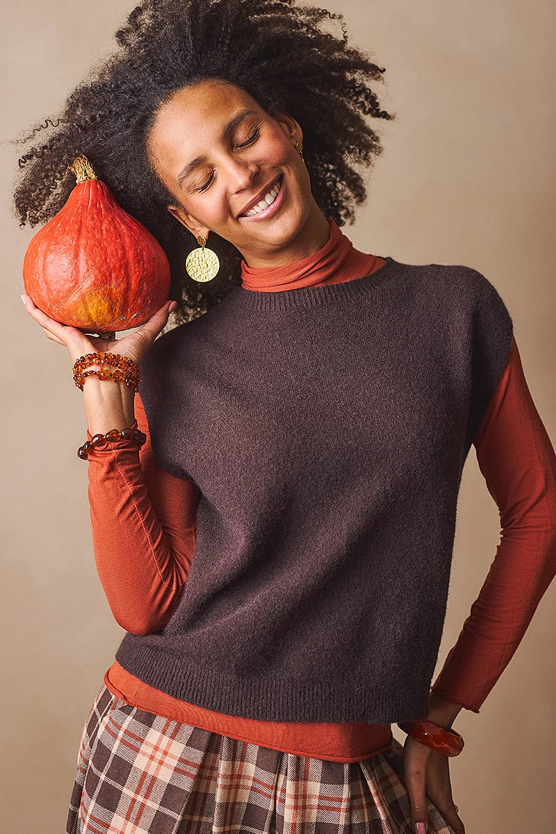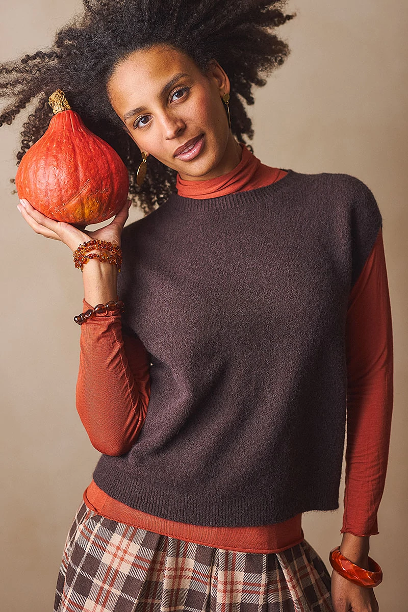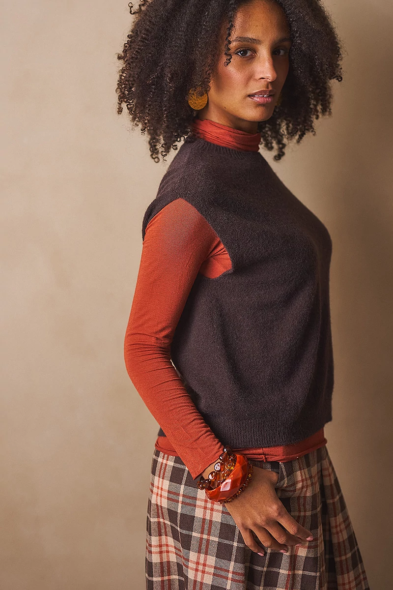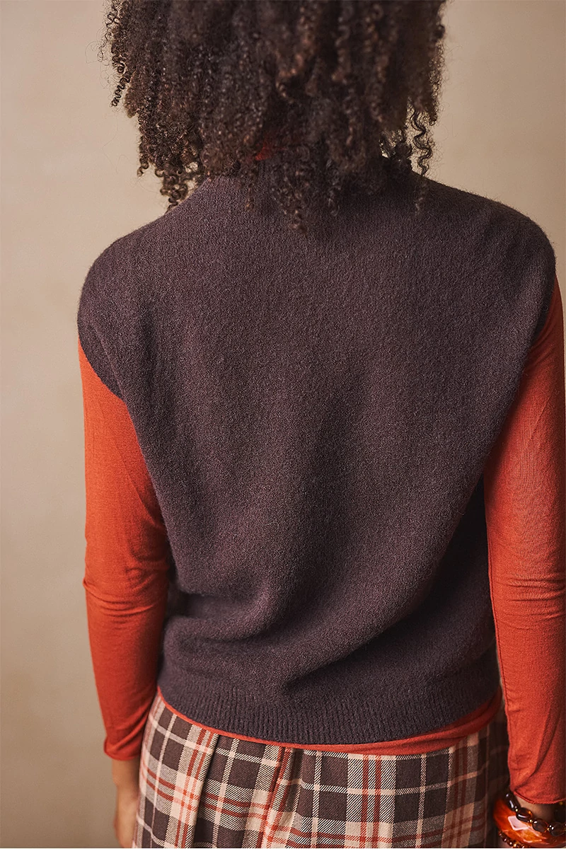 Egyenes vonalú, finomkötött mellény, kerek passzés nyakkal és passzé nélküli aljjal. A puha és meleg kötöttek változatossá és komfortossá teszik az őszi/téli öltözékeket.