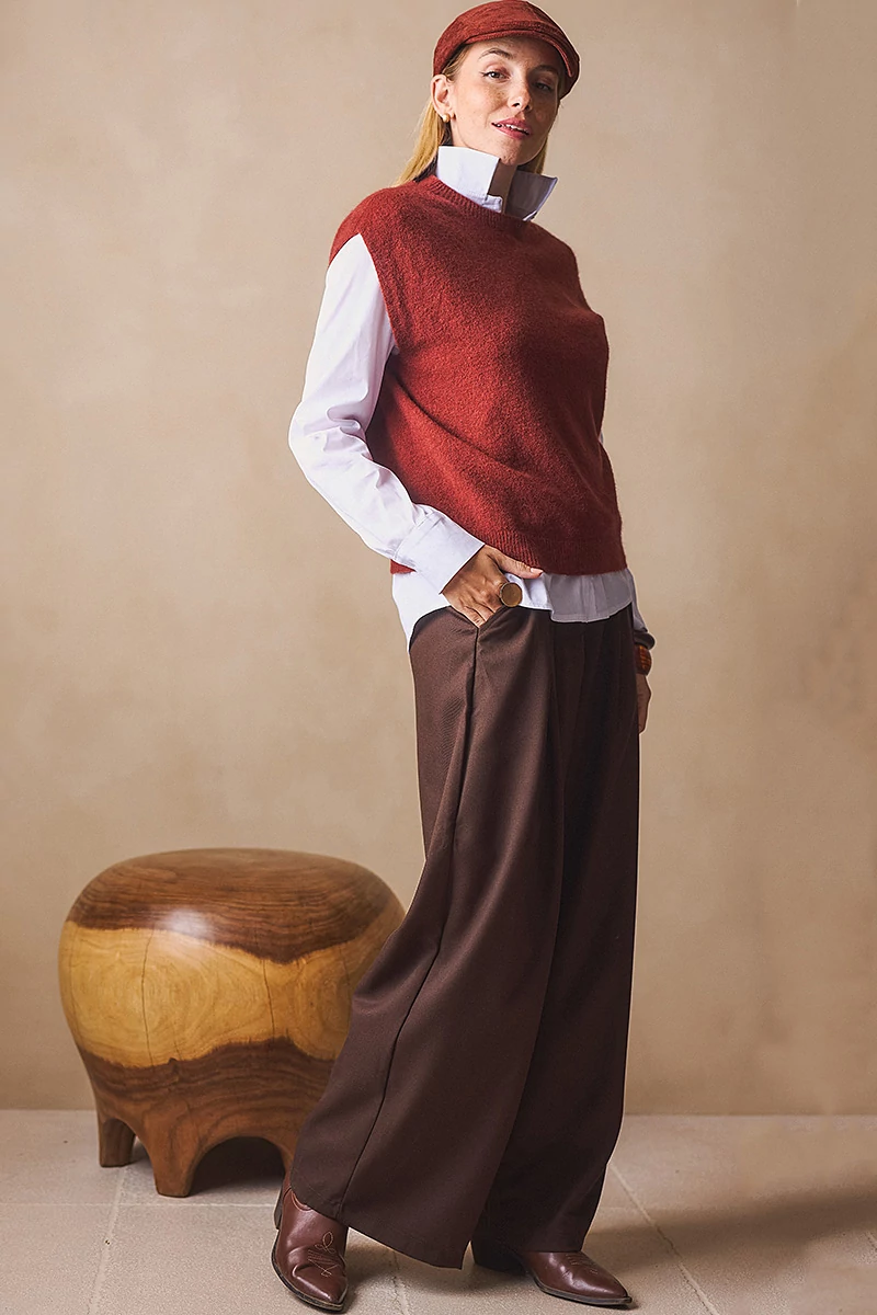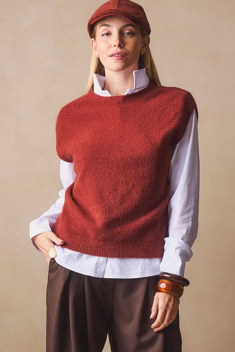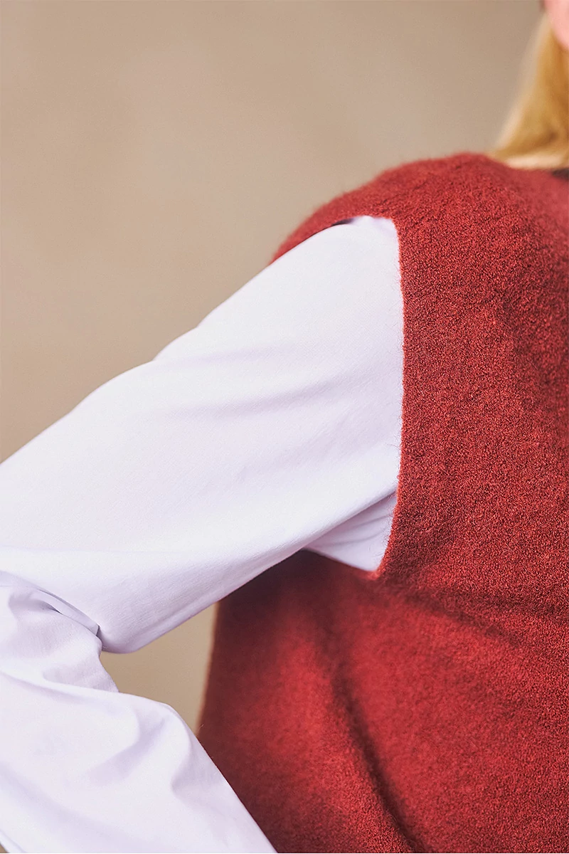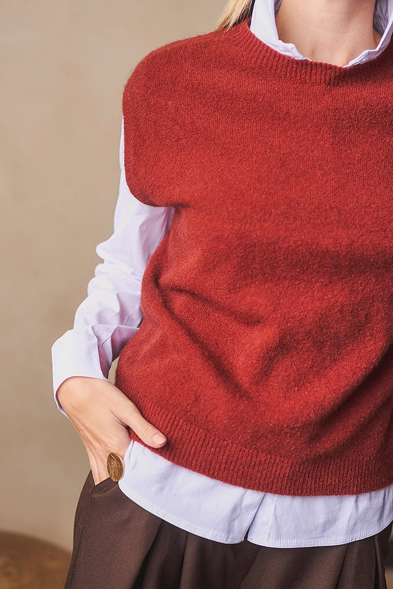 Egyenes vonalú, finomkötött mellény, kerek passzés nyakkal és passzé nélküli aljjal. A puha és meleg kötöttek változatossá és komfortossá teszik az őszi/téli öltözékeket.