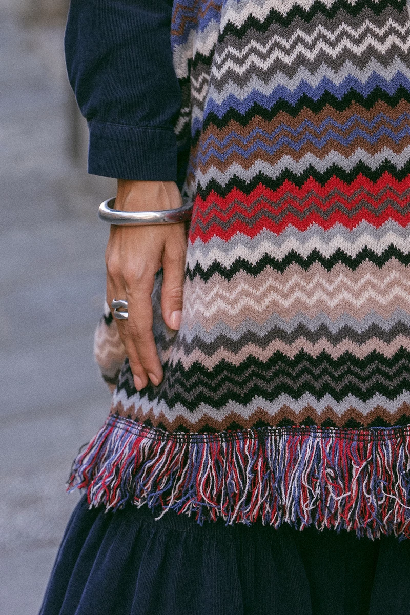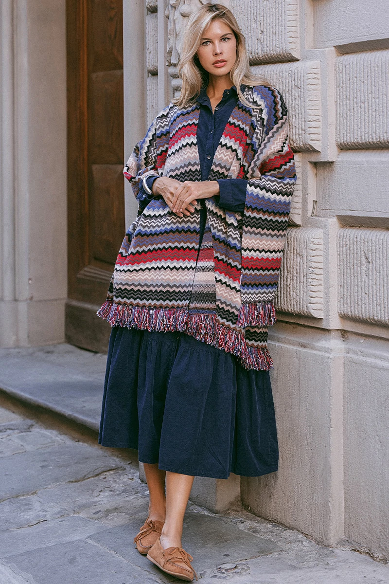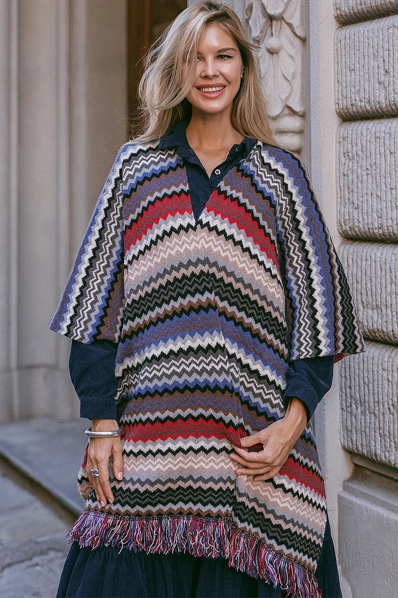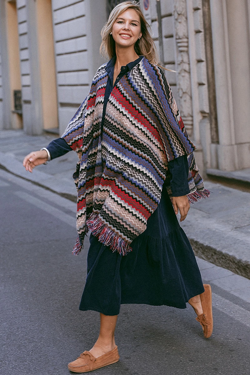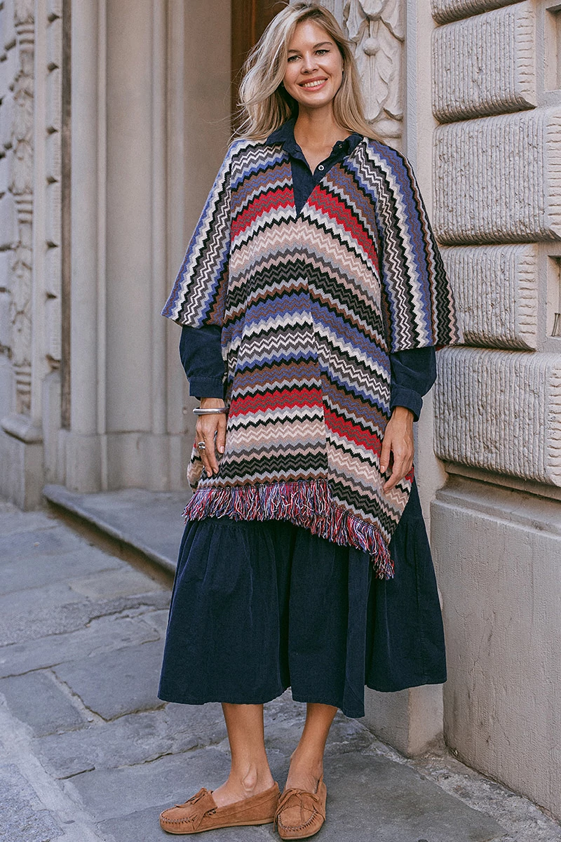 Egyenes vonalú poncsó az alján rojtokkal. Az anyaga puha, közepesen vastag anyag.