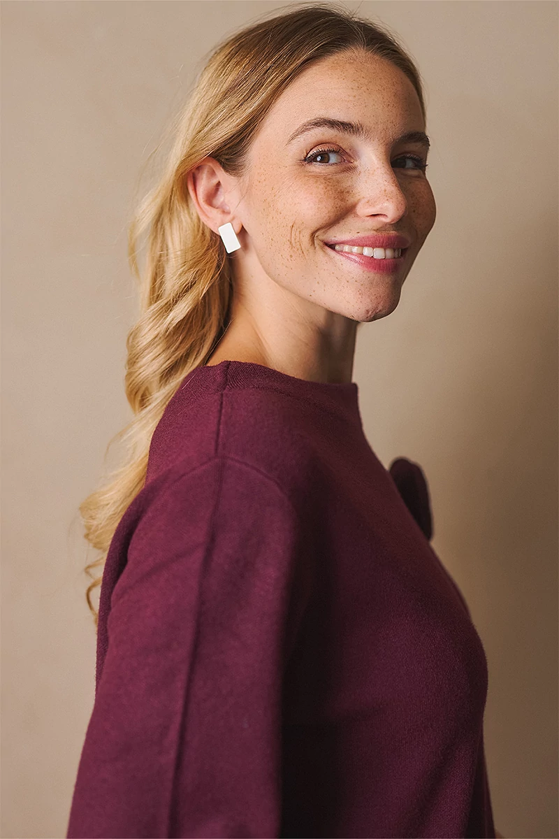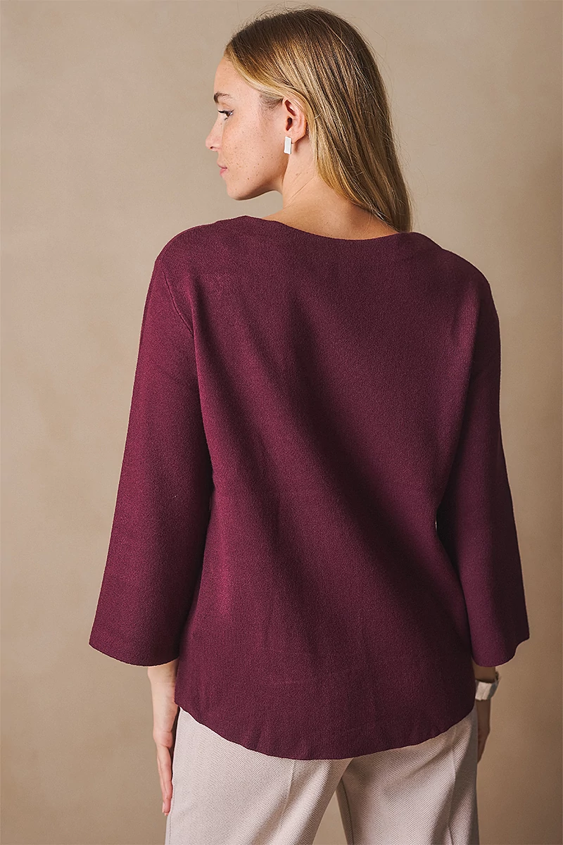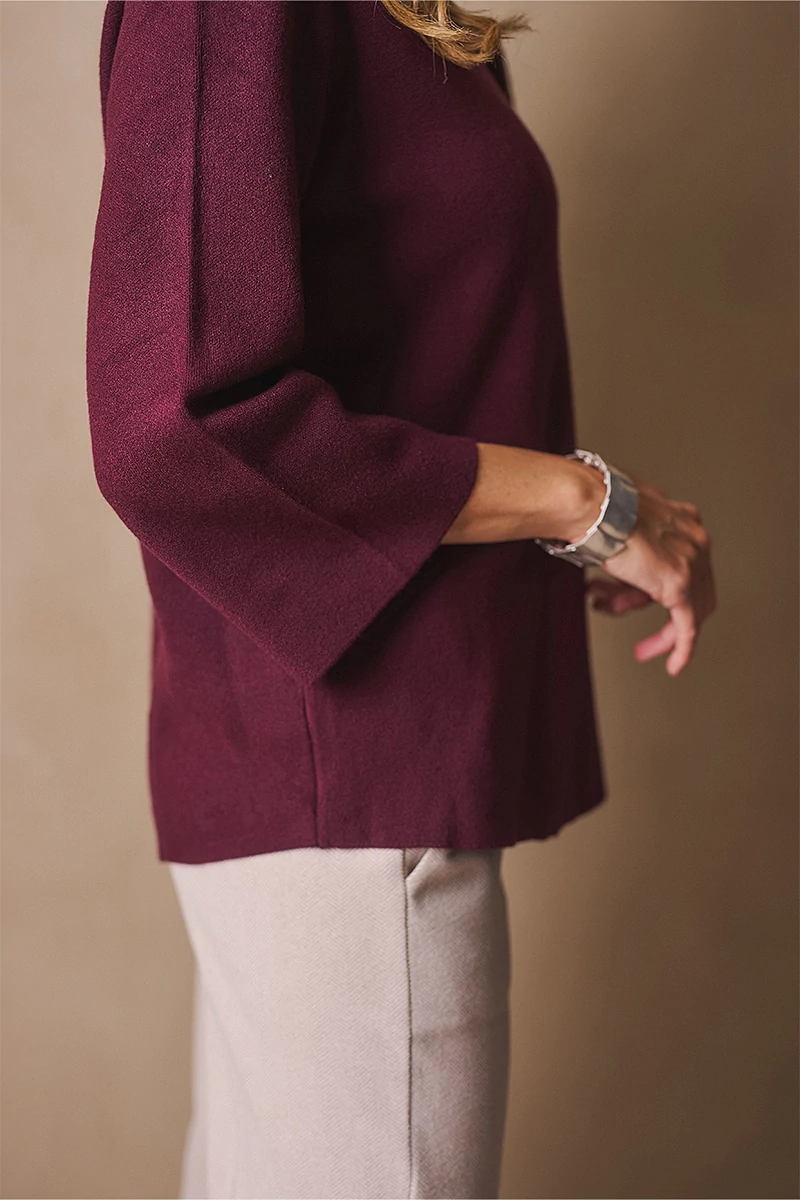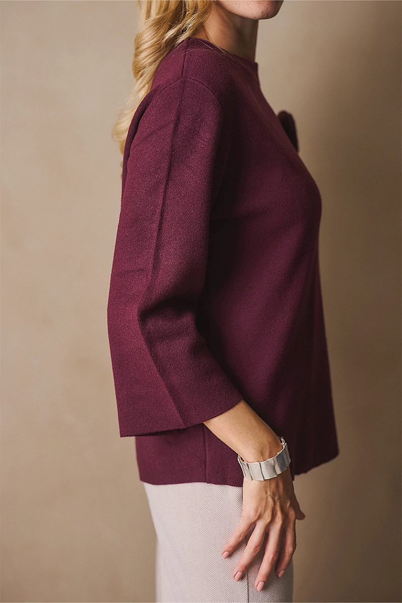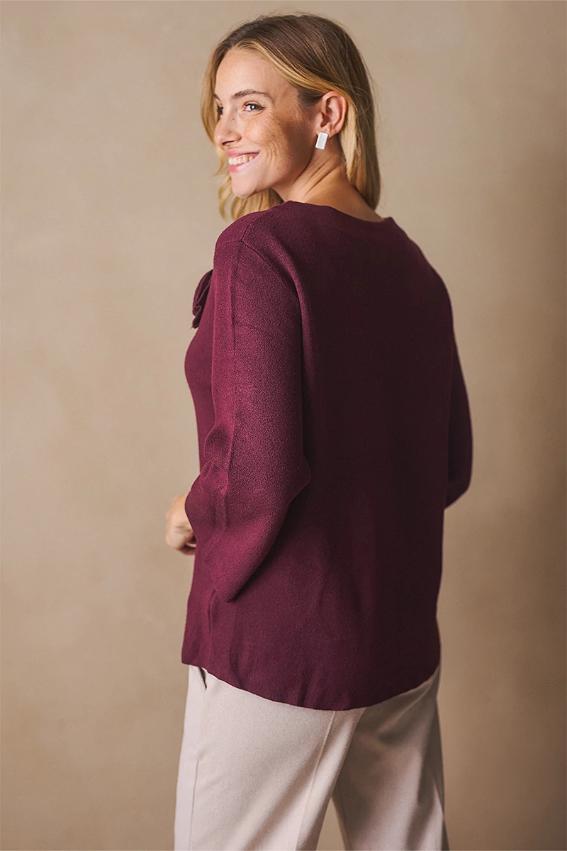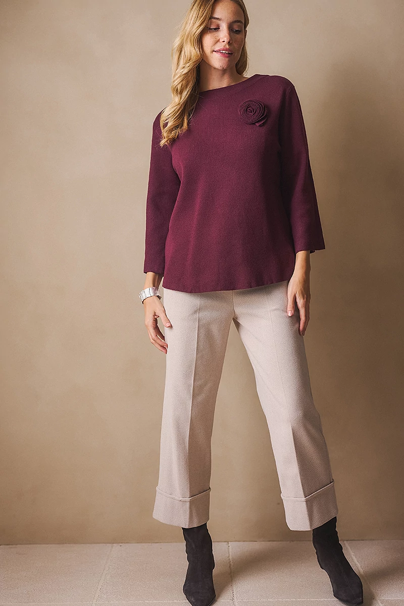 Letisztult és a nőies stílusú pulóver. Egyenes vonalú fazonja kényelmes és elegáns, a bő ujj pedig könnyed mozgást enged. Az alján és az ujja végén passzé nélküli megoldás finom egyszerűséget ad, míg a kerek, passzés nyakkivágás harmonikusan zárja a vonalakat. A levehető, rózsa formájú textil kitűző játékos, romantikus részlet, amely személyessé teszi a darabot. Egy pulóver, amely minden mozdulatában ott van a könnyedség és a női finomság.