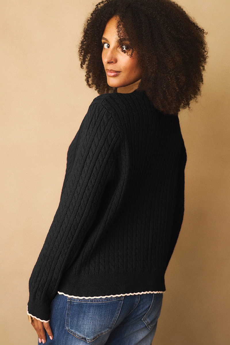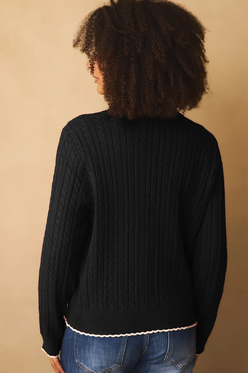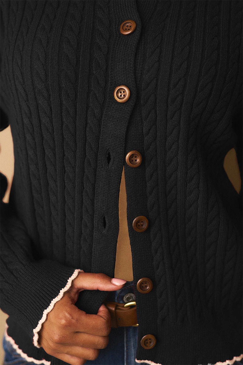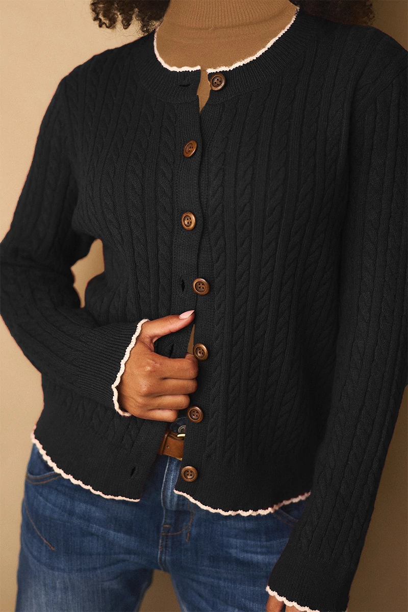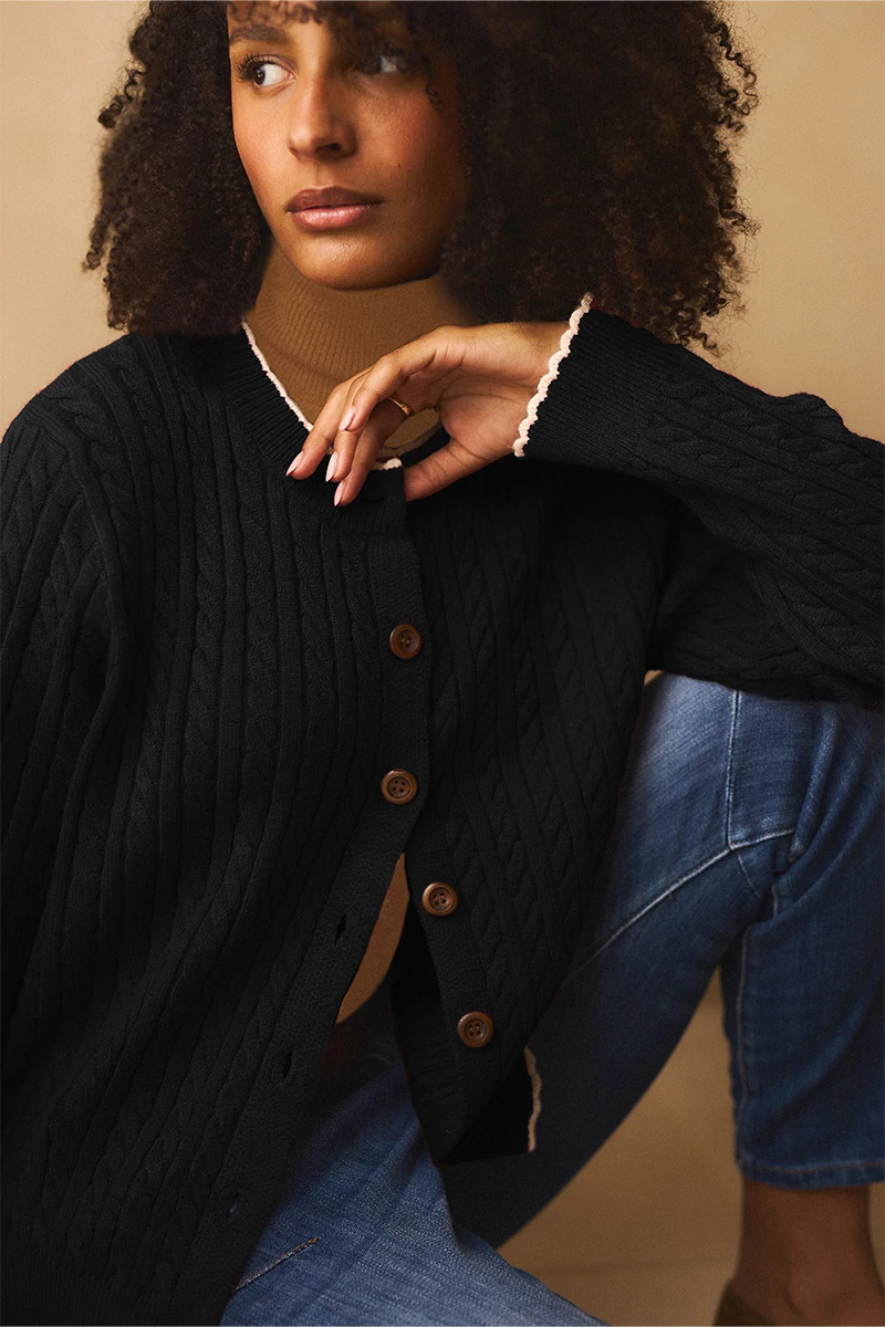 Kötött kardigán bájos vintage hangulatban. Klasszikus copfmintája finom textúrát ad, amit fehér szegélyek hangsúlyoznak a széleken, egy játékos, nőies részlet, amely még inkább kiemeli a darab romantikus karakterét. Elöl végig fagombokkal záródik.