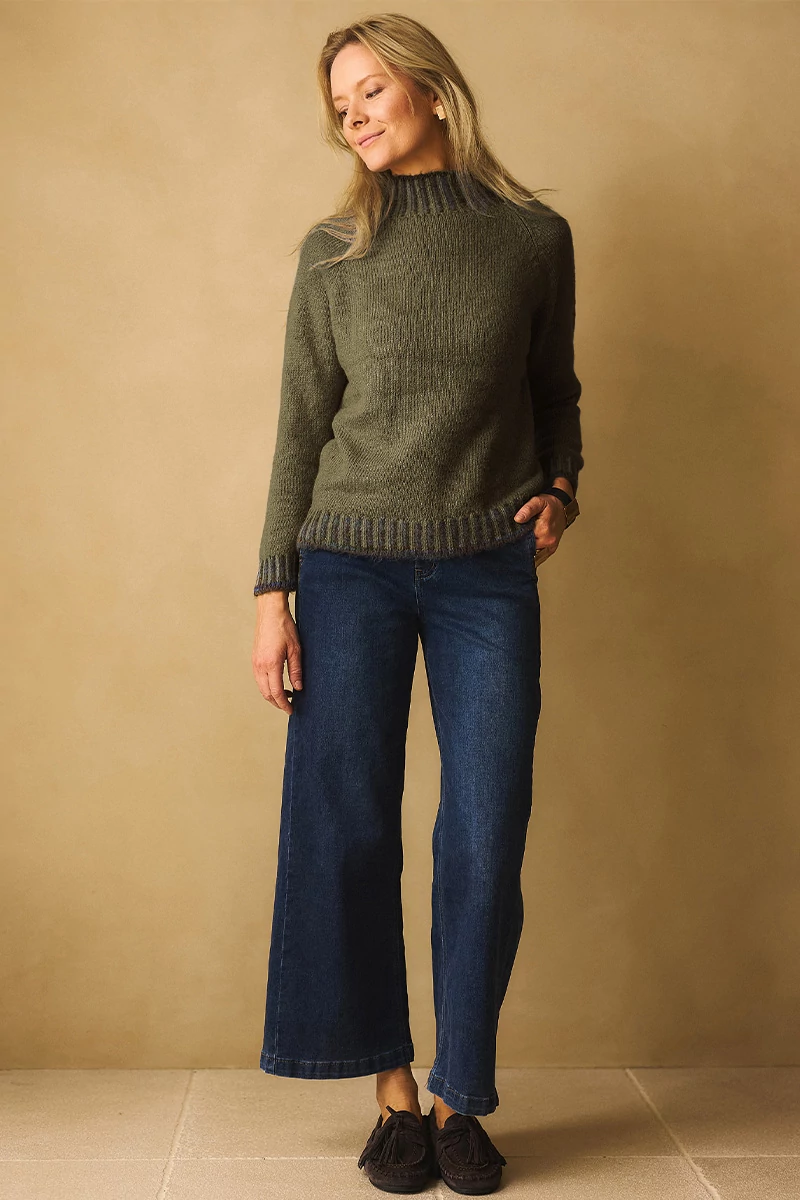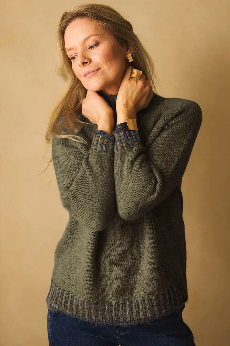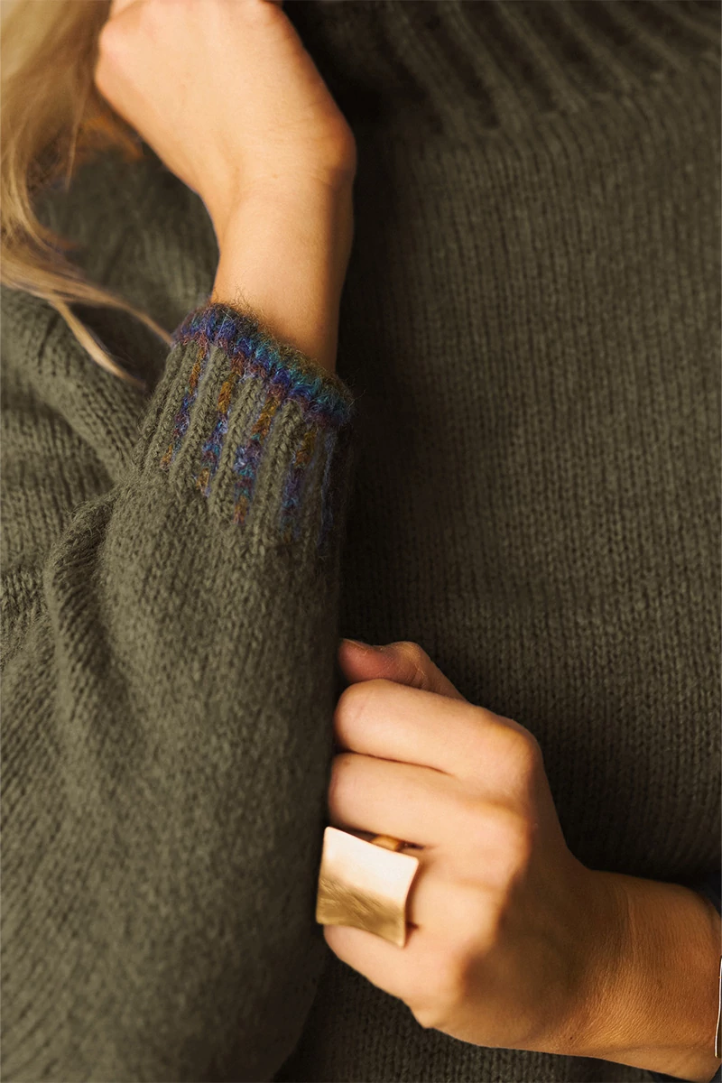 Egyenes vonalú pulóver félgarbós nyakkal, raglán ujjal, hímzéssel díszített passzéval. Az anyaga rugalmas, puha, vastag hurkolt anyag.
