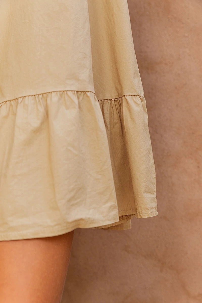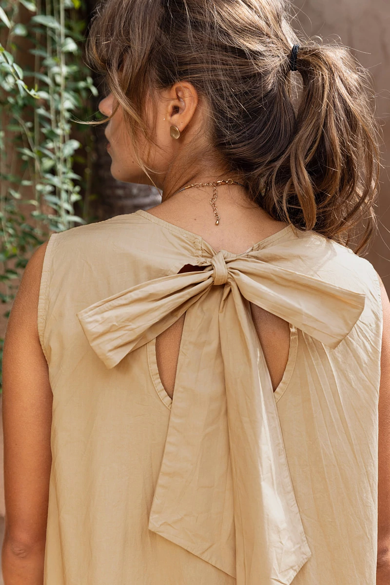 Lefele A vonalban bővülő, egyszerű vonalvezetésű, ujjatlan pamutvászon ruhácska az alján szélesebb fodorral, és hátán masnis kivágással. A ruha anyaga enyhén rugalmas pamutvászon