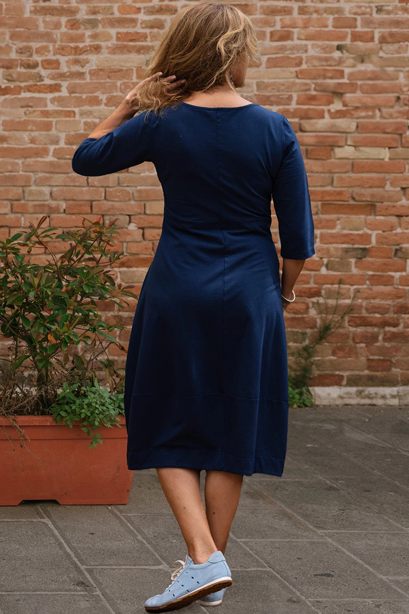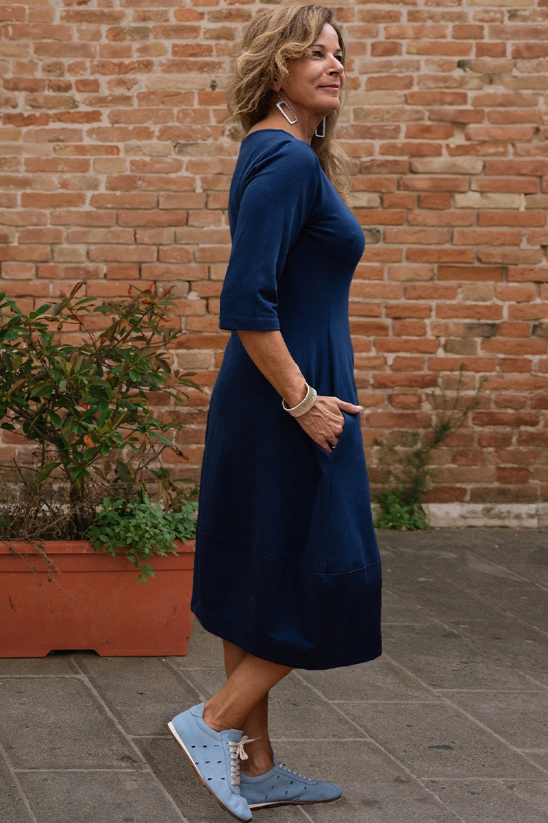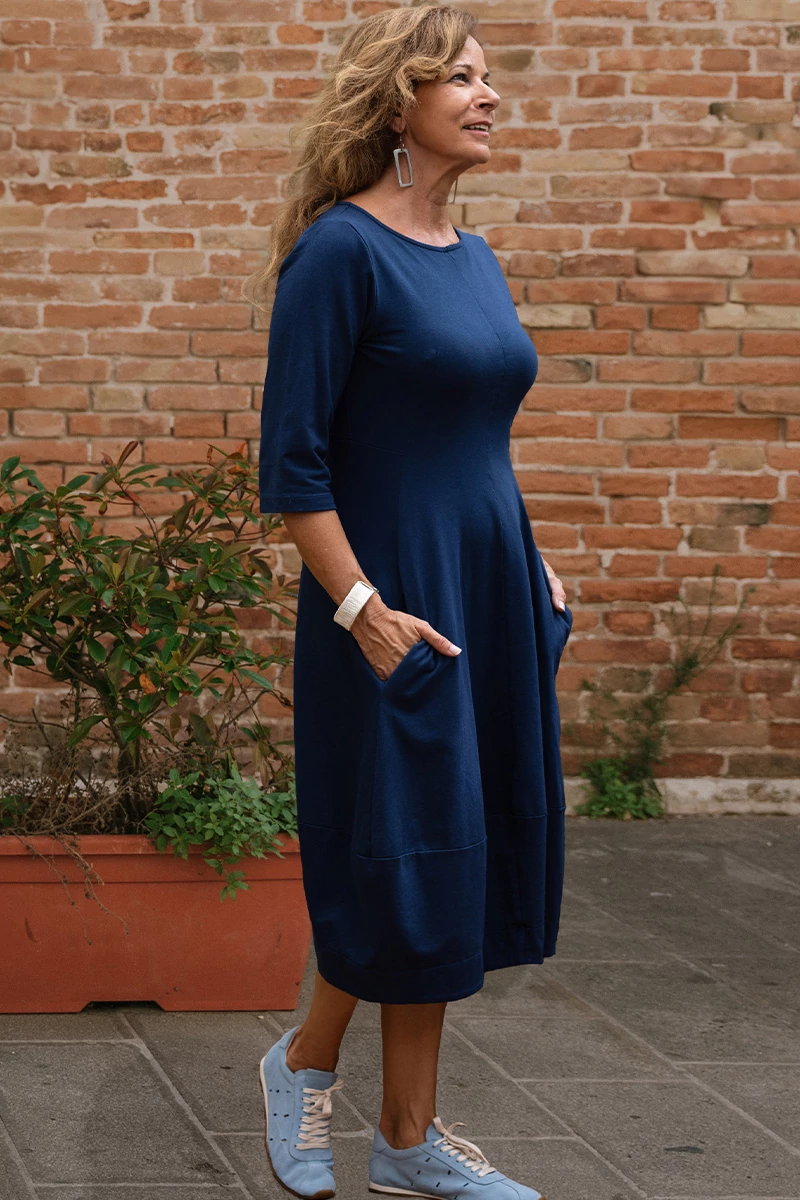 Karcsúsított, testkövető, enyhén hagyma fazonú ruha, elöl a szűkítővarrásokban rejtett zsebekkel. Ujja 3/4-es hosszúságú. Anyaga rugalmas, fazon és formatartó,belül hurkolt felületű pamut.