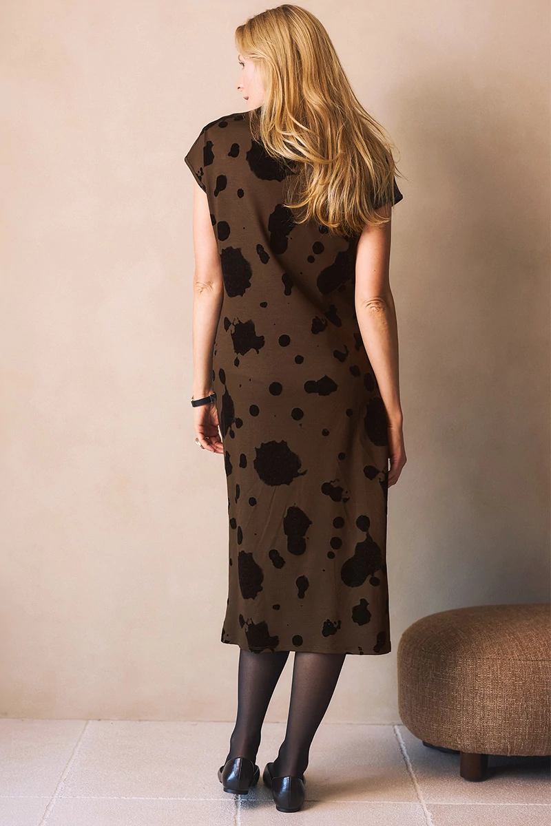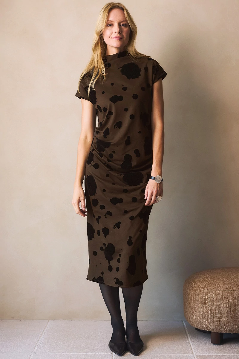 Elegáns, egyenes vonalú, hosszú szövetruha félgarbós nyakkal, japán ujjal, két oldalán finom ráncolással. Az anyaga rugalmas, puha szövet anyag.