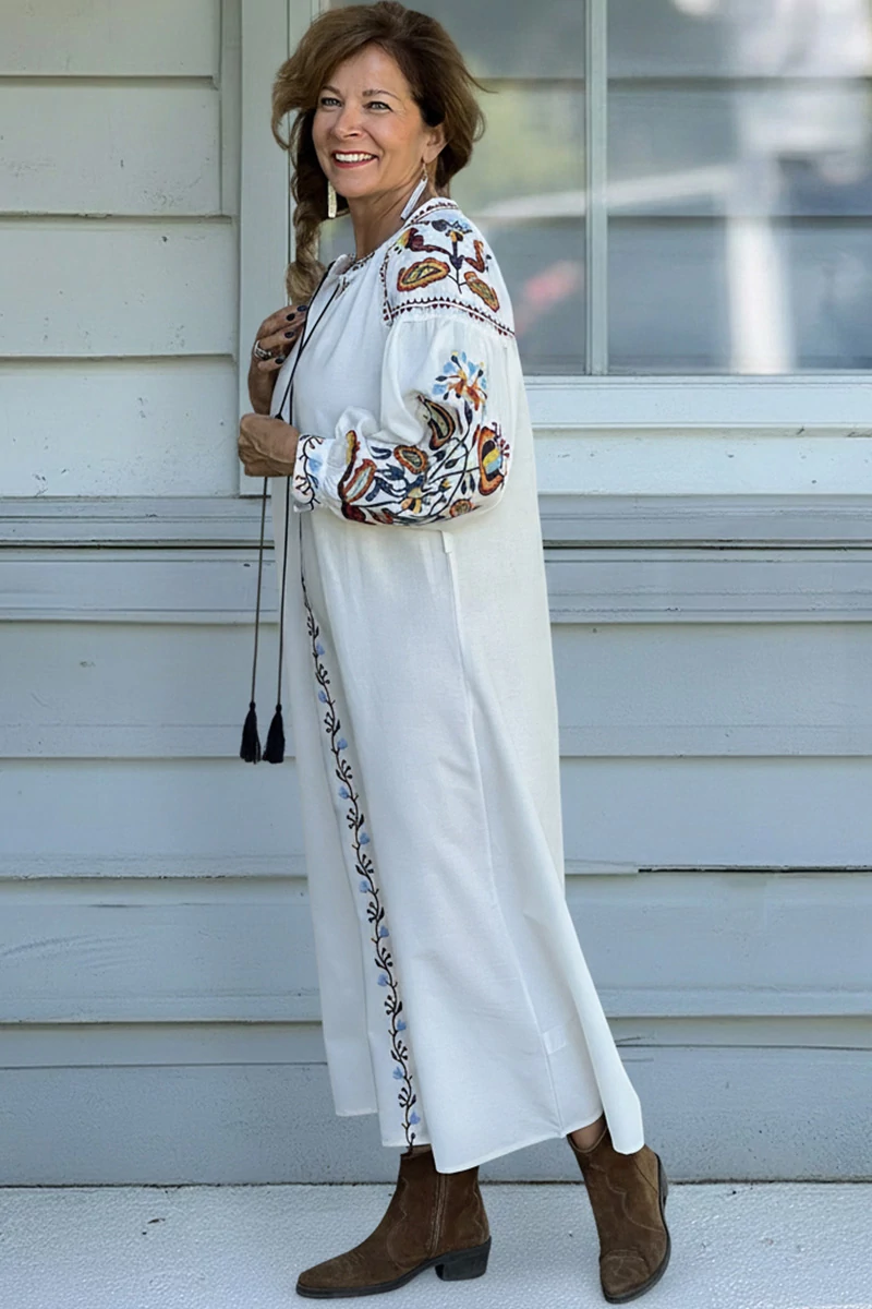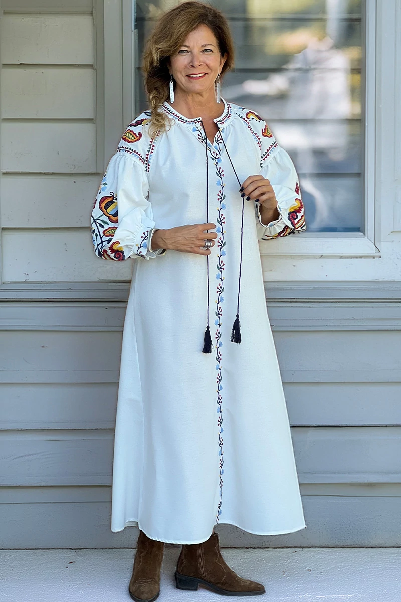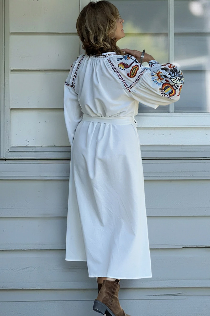 Egyenes vonalú midi ruha állógallérral,a derekánál bújtatóval, kötővel, a nyakánál finom ráncolással, bojtos kötővel, széles, buggyos 3/4-es, mandzsettás ujjal. A ruha különleges karakterét a színes, etno stílusú dekoratív hímzés adja. Az anyaga nem rugalmas, puha pamut és lenkeverék szövet.
