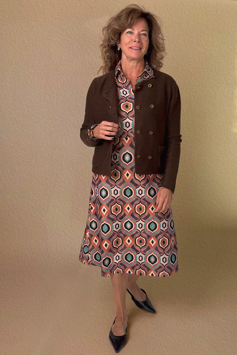 Az egyberuha ősszel olyan, mint egy egyszerű varázslat: egy mozdulattal teljes szettet ad, miközben megidézi a szezon gazdag, meleg atmoszféráját. Az ingruhánk puha anyagból készült, mesés őszi mintával. Klasszikus, galléros ingruha fazon, a derekánál kötővel és a szoknyarész A-vonalban bővül. Hosszú, mandzsettás ujjú, és elöl végig gombokkal záródik. Az anyaga rendkívül puha és rugalmas.