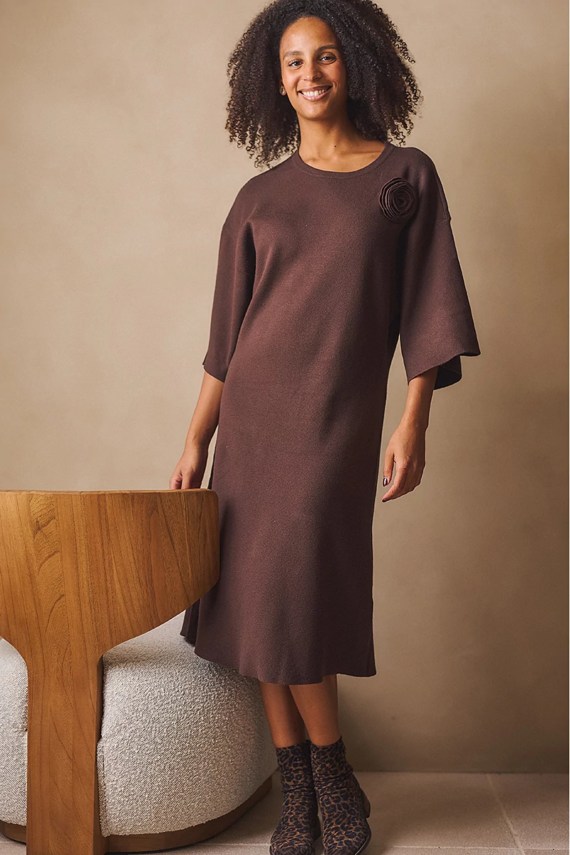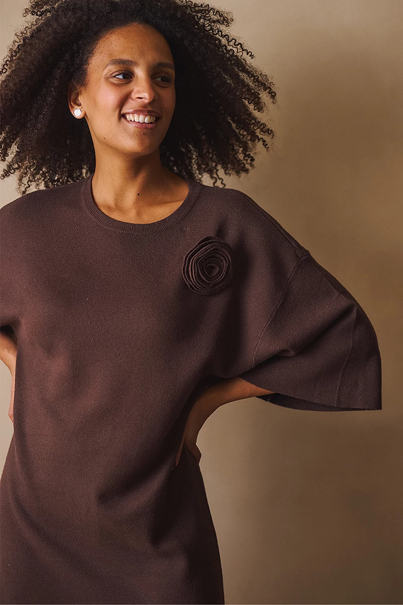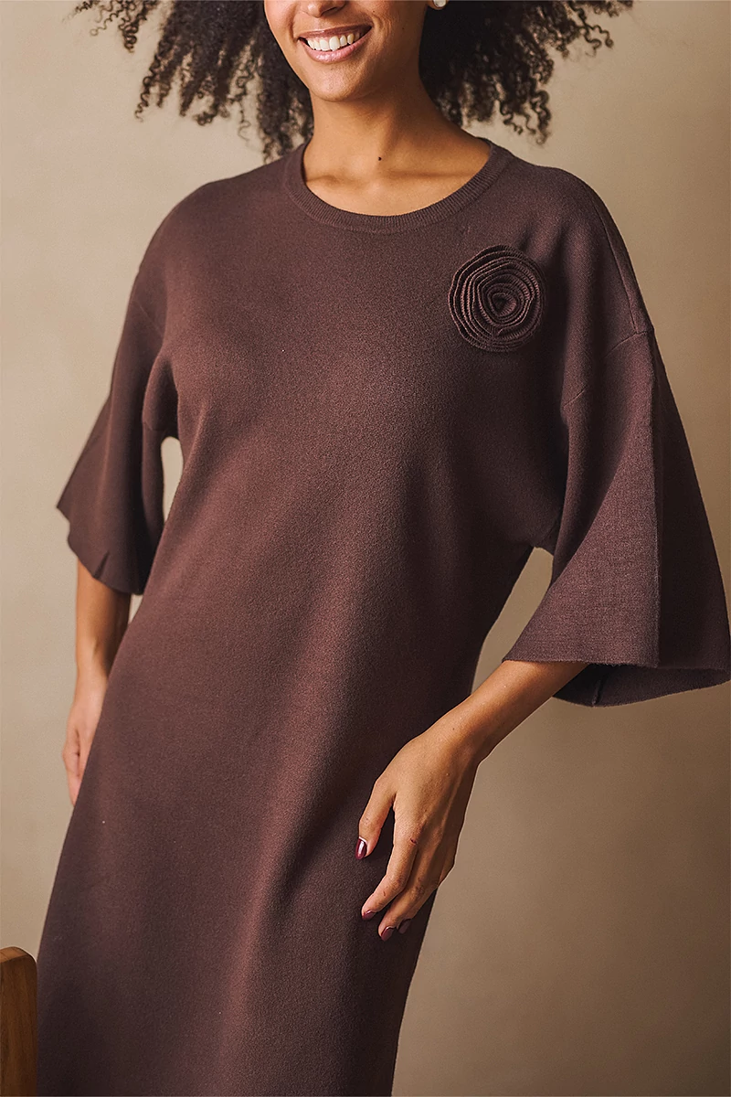 Ez a kötött ruha a letisztultság és a nőies részletek tökéletes egyensúlya.Egyenes vonalú, közepes hosszúságú fazonja kényelmes és elegáns, az 1/2-es bő ujj pedig könnyed mozgást enged. Az alján és az ujja végén passzé nélküli megoldás finom egyszerűséget ad, míg a kerek, passzés nyakkivágás harmonikusan zárja a vonalakat. A levehető, rózsa formájú textil kitűző játékos, romantikus részlet, amely személyessé teszi a darabot.Egy ruha, amelyben természetesen lehetsz elegáns, minden mozdulatában ott van a könnyedség és a női finomság.