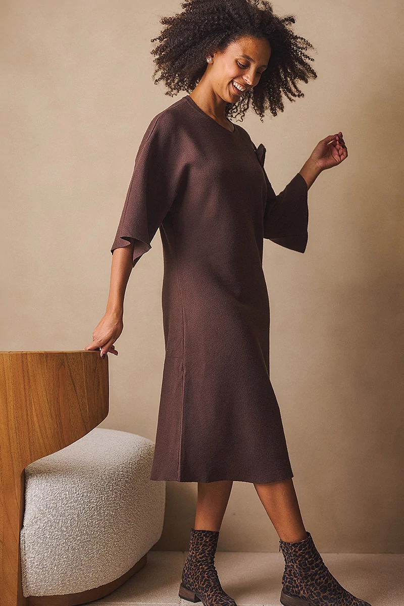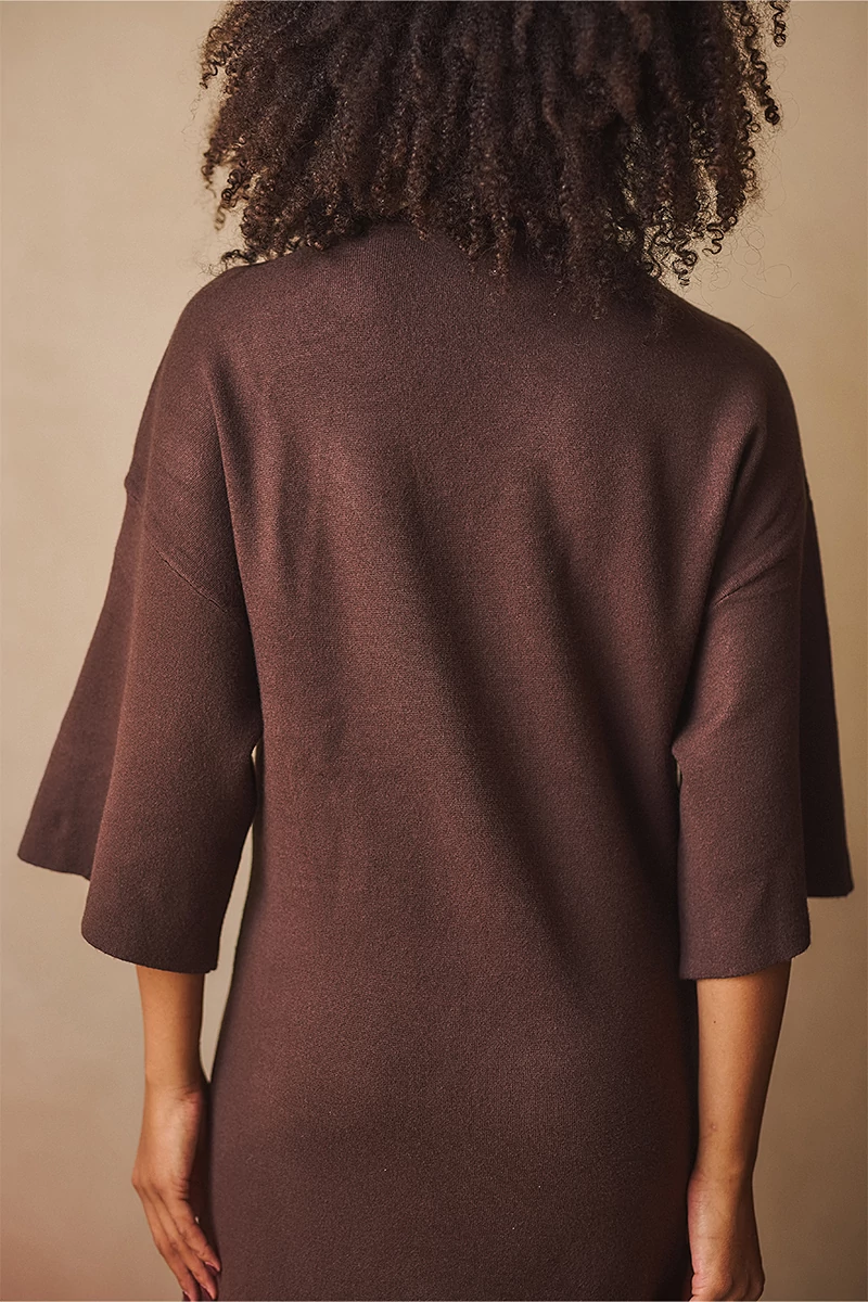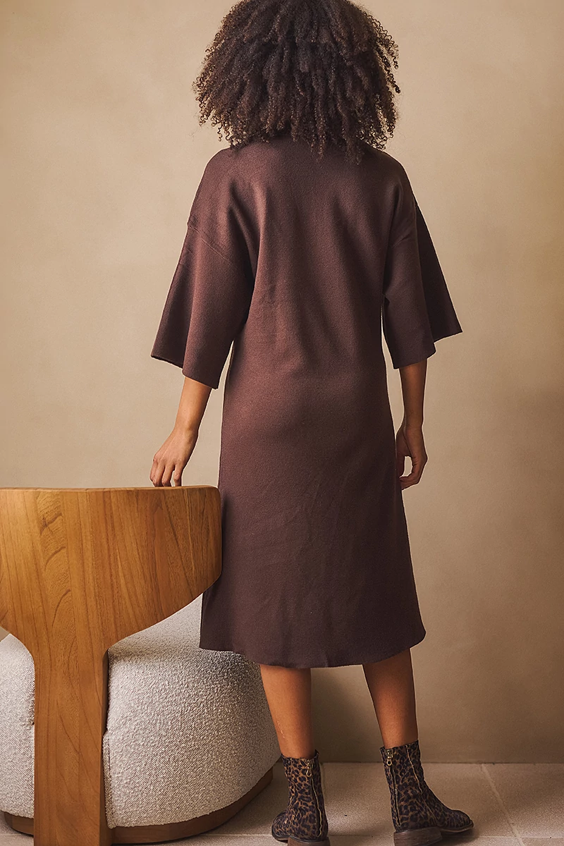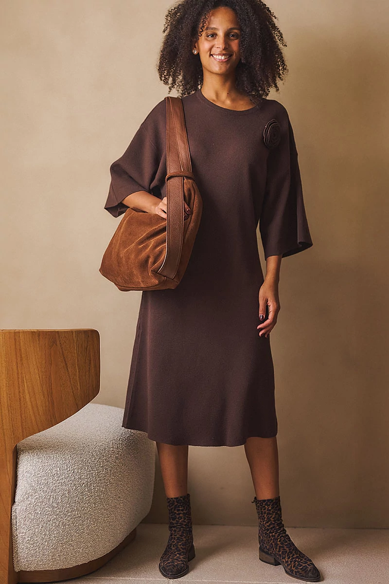 Ez a kötött ruha a letisztultság és a nőies részletek tökéletes egyensúlya.Egyenes vonalú, közepes hosszúságú fazonja kényelmes és elegáns, az 1/2-es bő ujj pedig könnyed mozgást enged. Az alján és az ujja végén passzé nélküli megoldás finom egyszerűséget ad, míg a kerek, passzés nyakkivágás harmonikusan zárja a vonalakat. A levehető, rózsa formájú textil kitűző játékos, romantikus részlet, amely személyessé teszi a darabot.Egy ruha, amelyben természetesen lehetsz elegáns, minden mozdulatában ott van a könnyedség és a női finomság.
