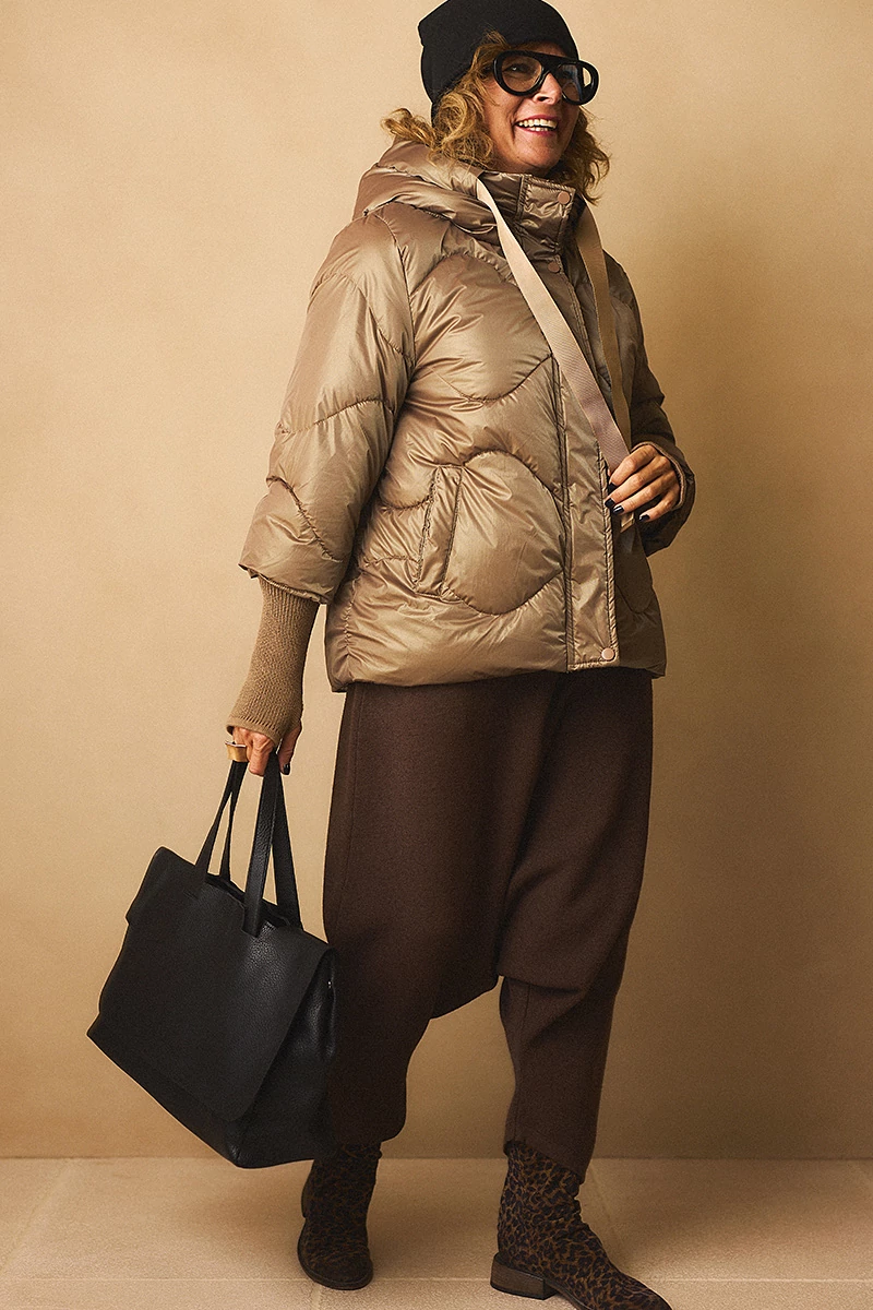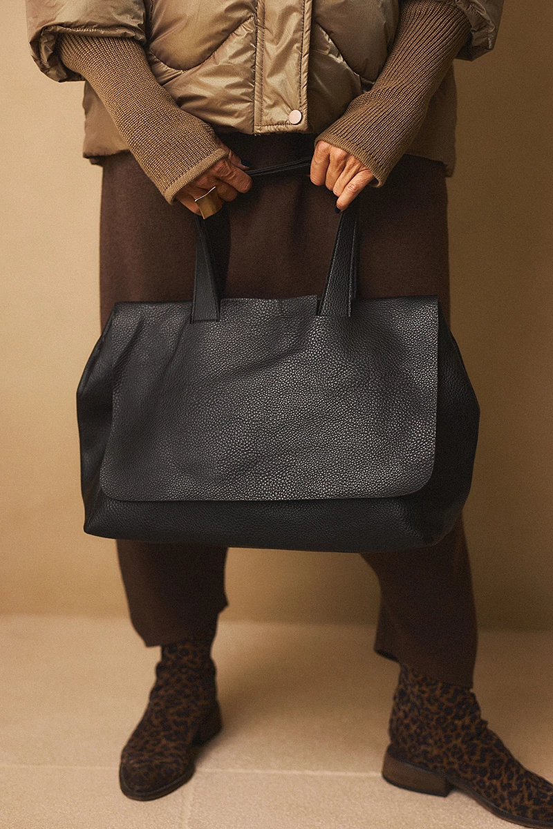 Egyterű, téglalap formájú táska, belül egy cipzáros zsebbel, oldalt patenttal. Áthajtással záródik. Puha, nem merev falú. Tartozéka egy hosszú pánt és egy különálló cipzáros táska.